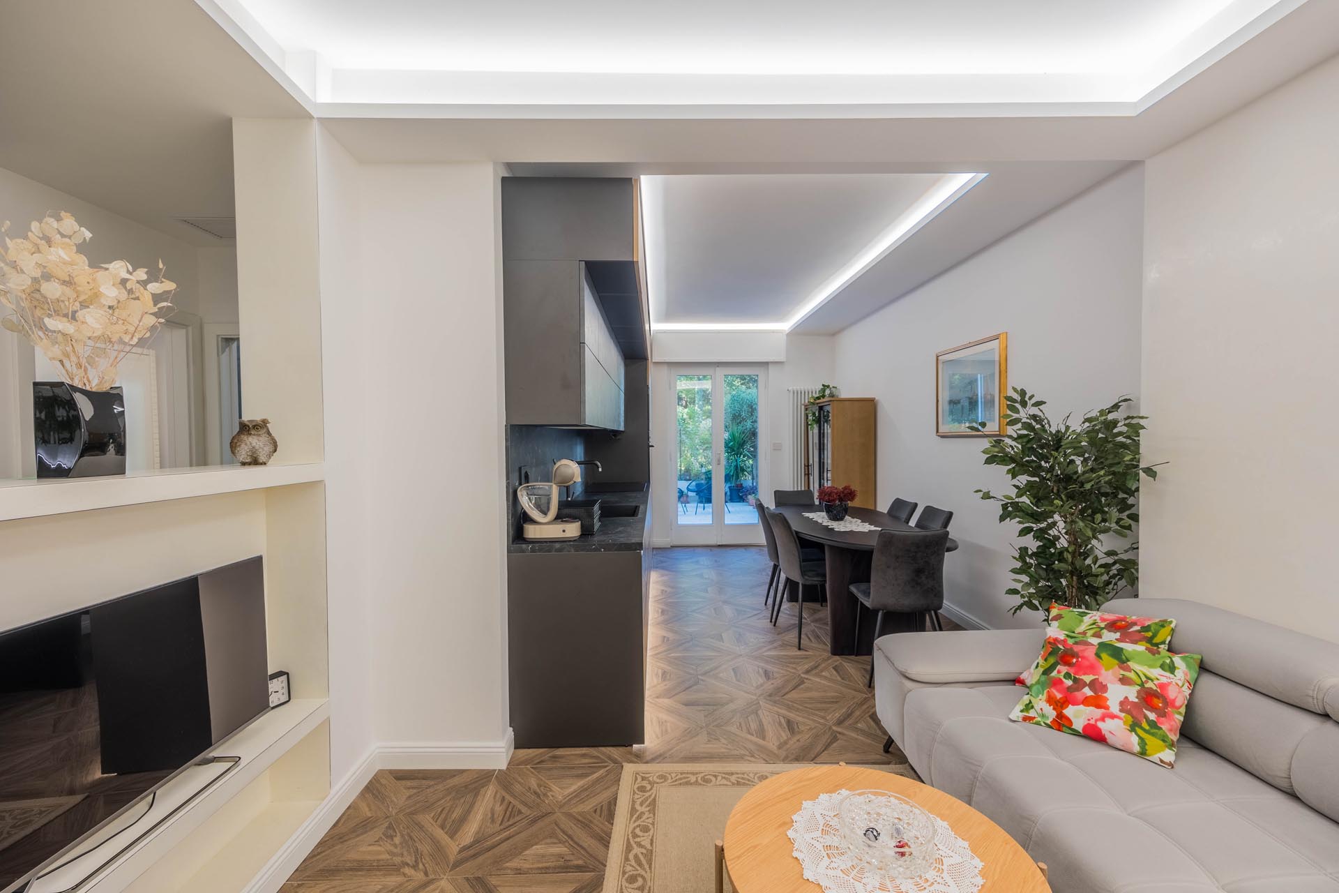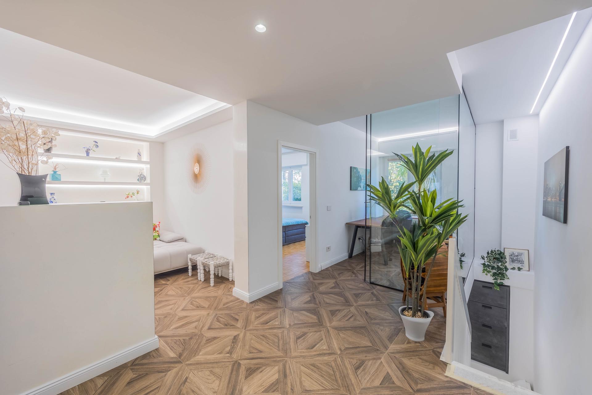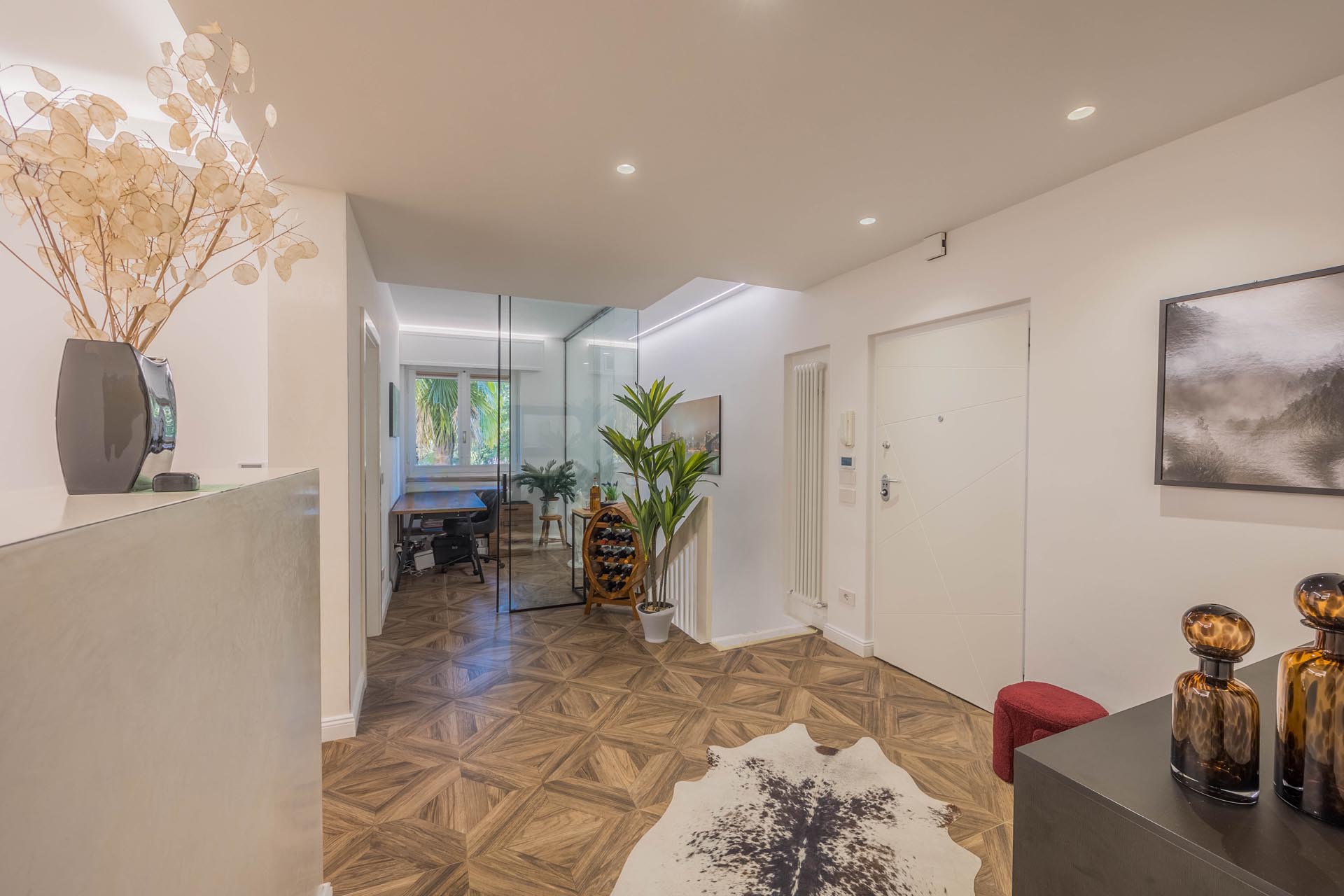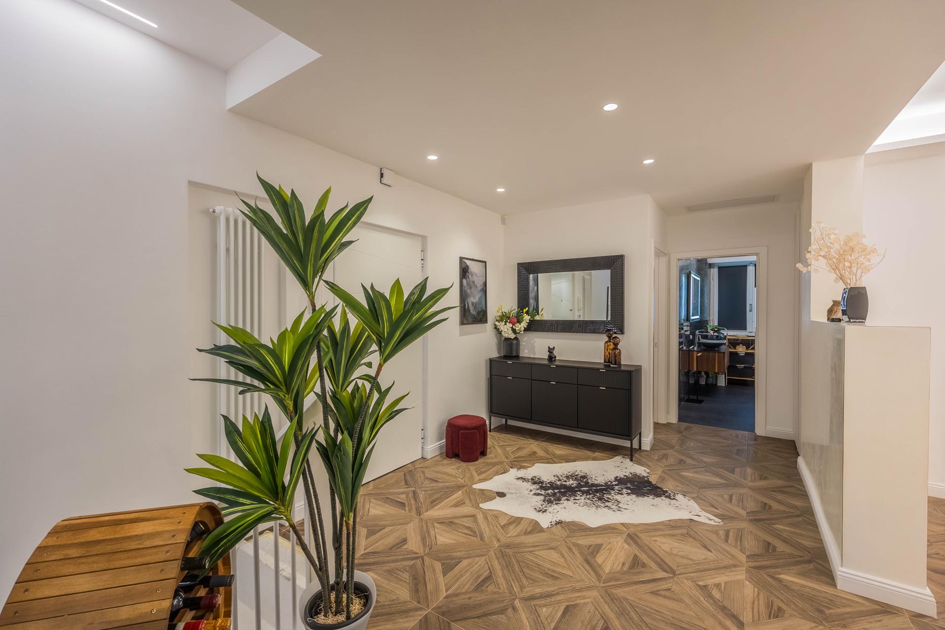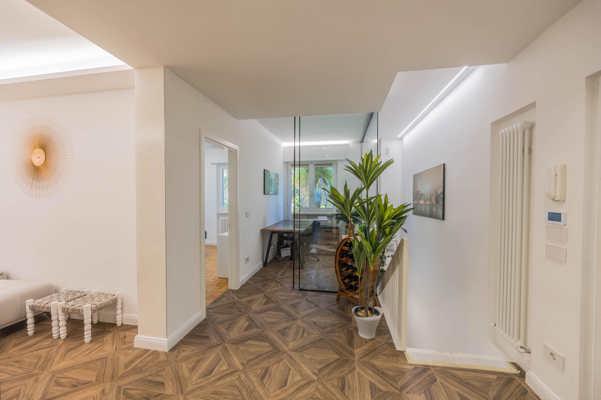 Die Immobilie wurde vollständig mit hochwertigen Materialien renoviert, wobei besonderer Wert auf edle Details gelegt wurde. Wände in Stucco Veneziano verleihen den Räumen eine stilvolle und repräsentative Note.
