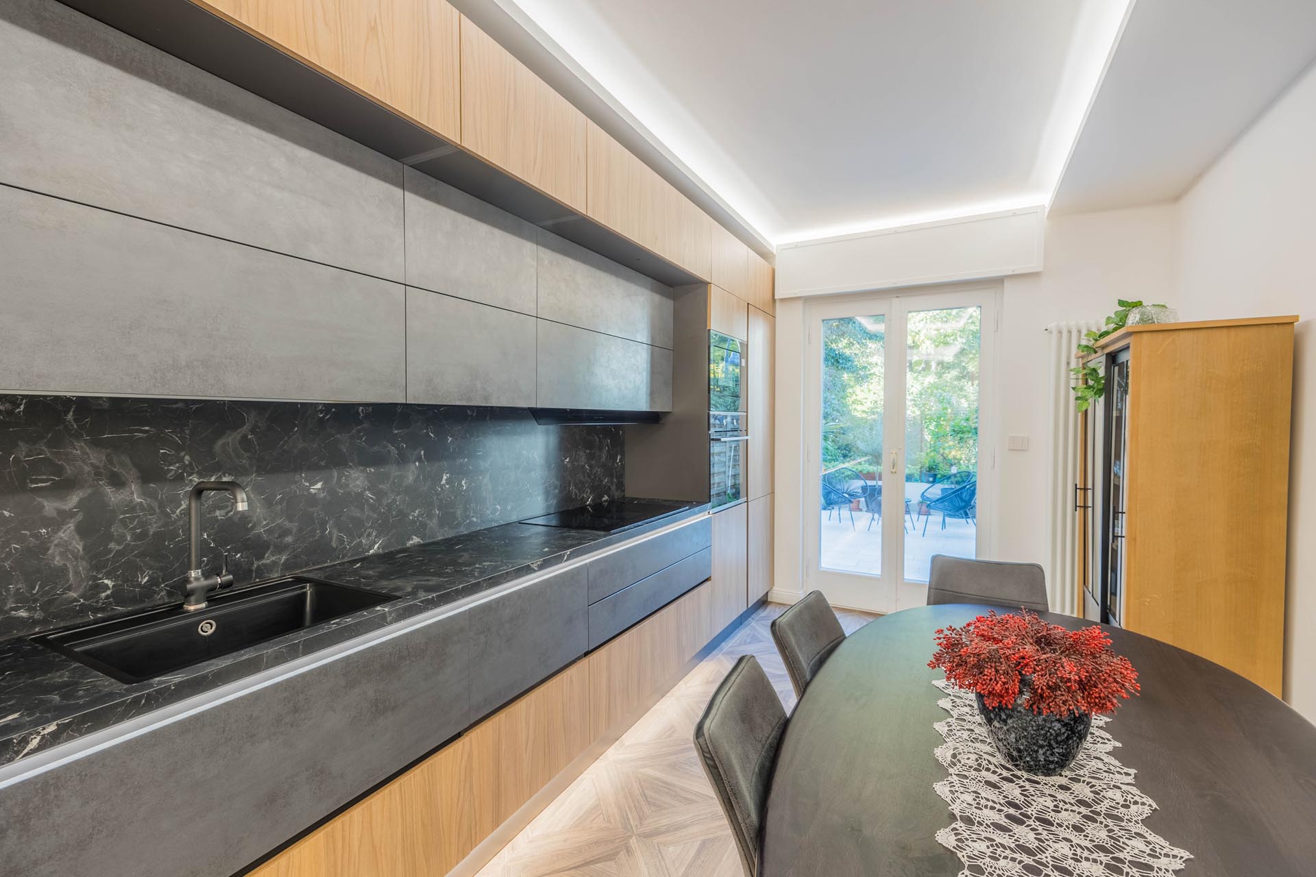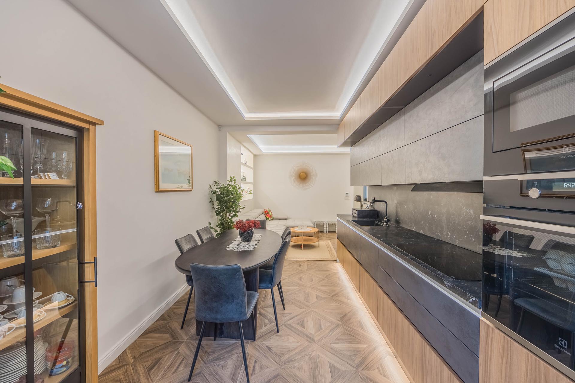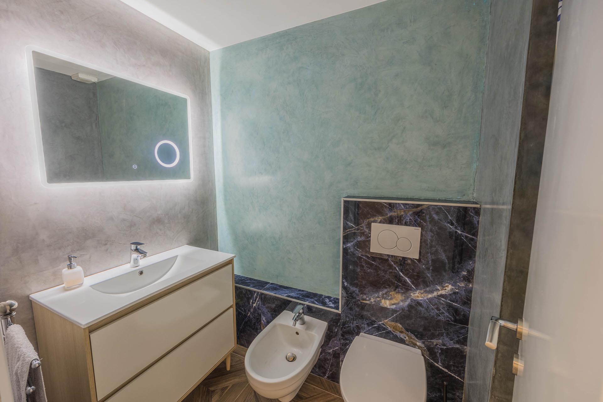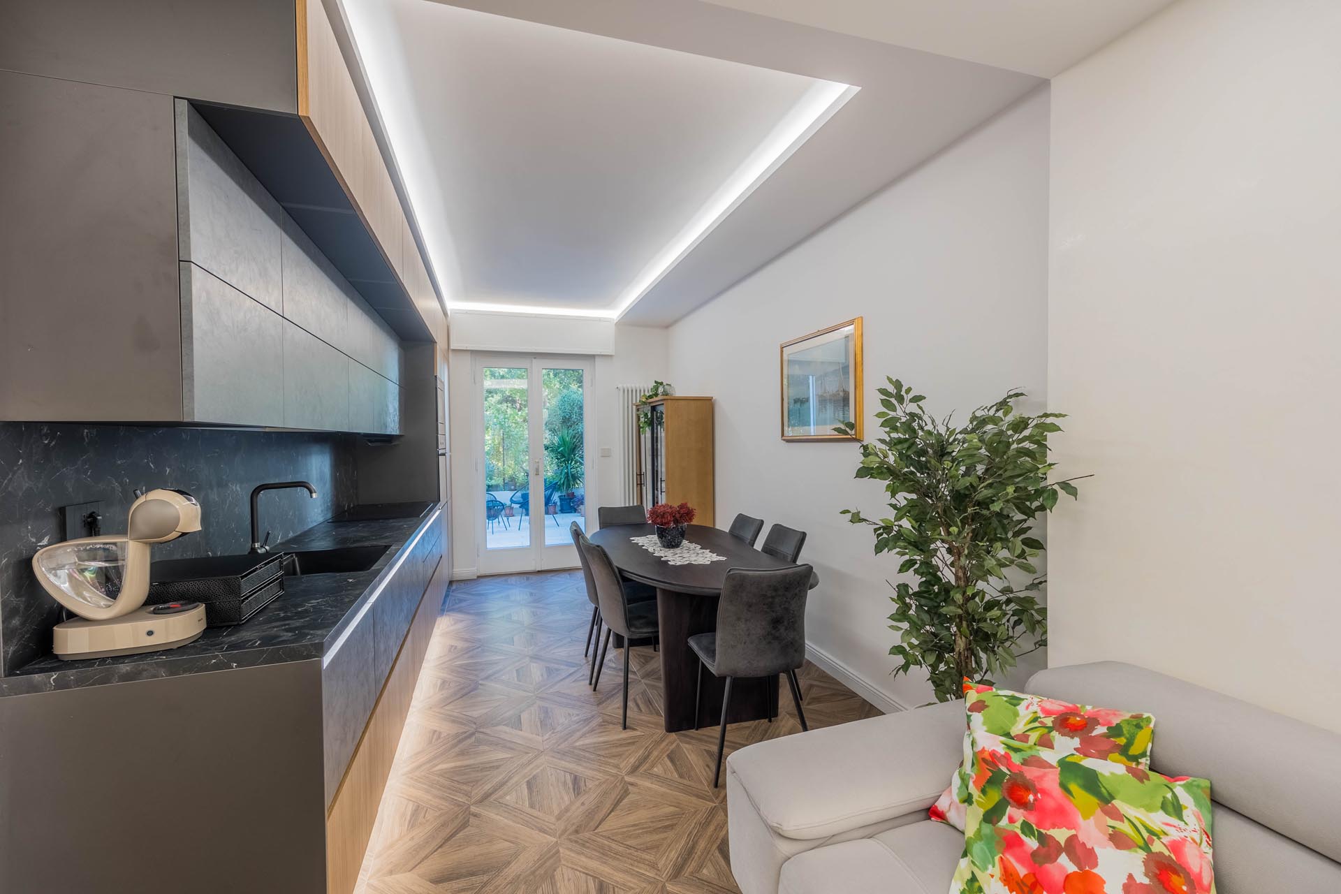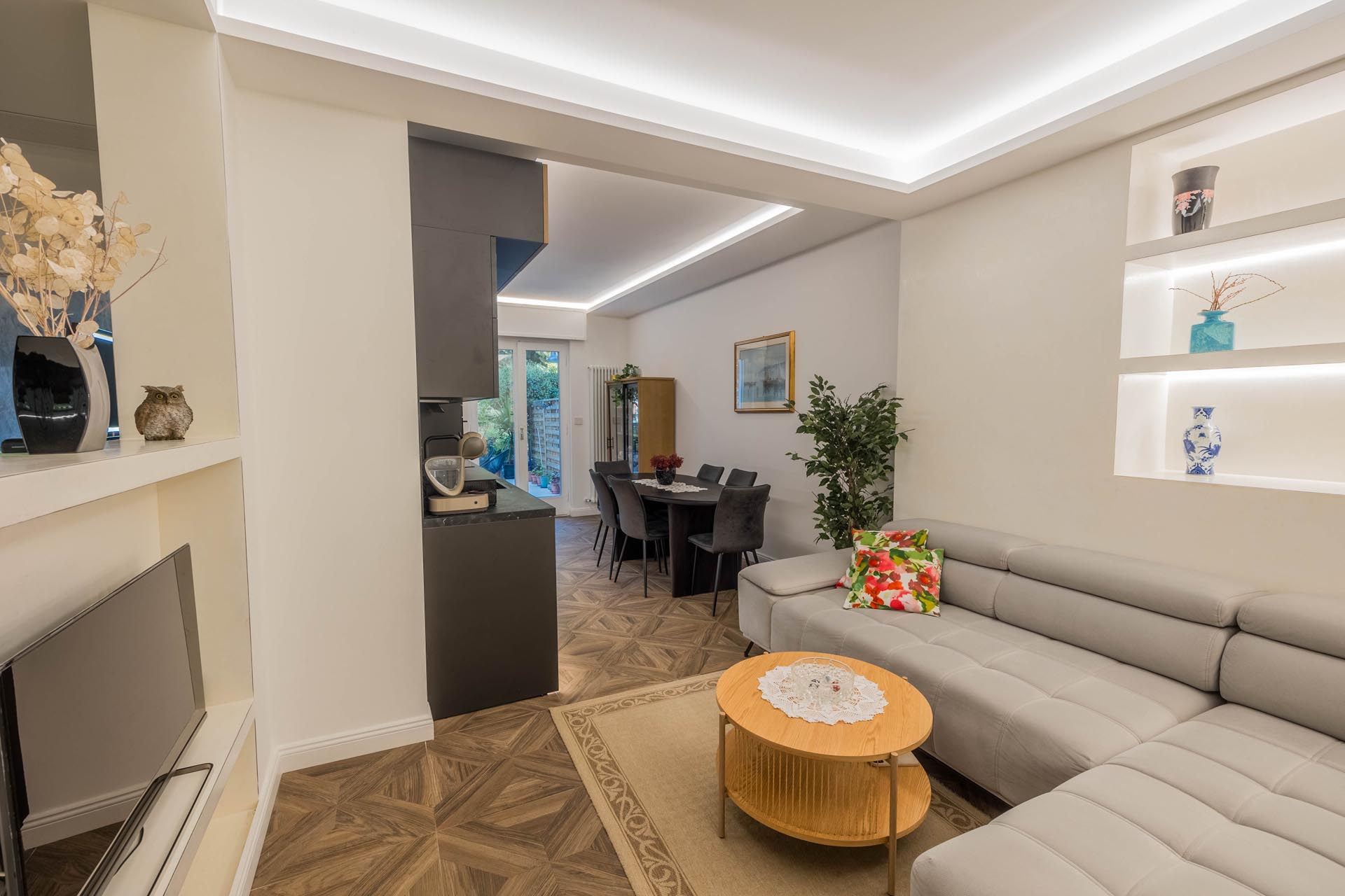 Die Immobilie wurde vollständig mit hochwertigen Materialien renoviert, wobei besonderer Wert auf edle Details gelegt wurde. Wände in Stucco Veneziano verleihen den Räumen eine stilvolle und repräsentative Note.