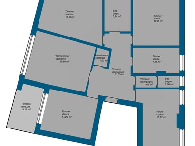 Die Wohnung ist auf drei Seiten frei ausgerichtet und überzeugt durch ihre Helligkeit sowie eine angenehme Belüftung. Sie verfügt über vier geräumige Schlafzimmer und zwei Bäder, die eine flexible Nutzung ermöglichen. Die Ausrichtung nach Nordwesten sorgt für ein gleichmäßiges, angenehmes Licht, während die große Terrasse einen wunderbaren Ausblick auf die Talfer bietet – ein Ort, der sich ideal zum Entspannen oder für gesellige Stunden eignet.