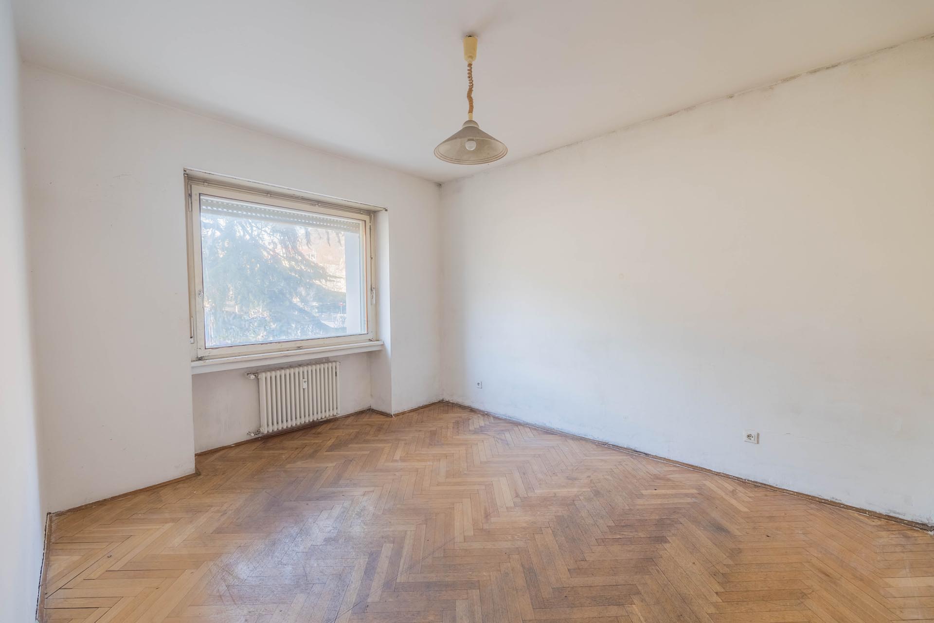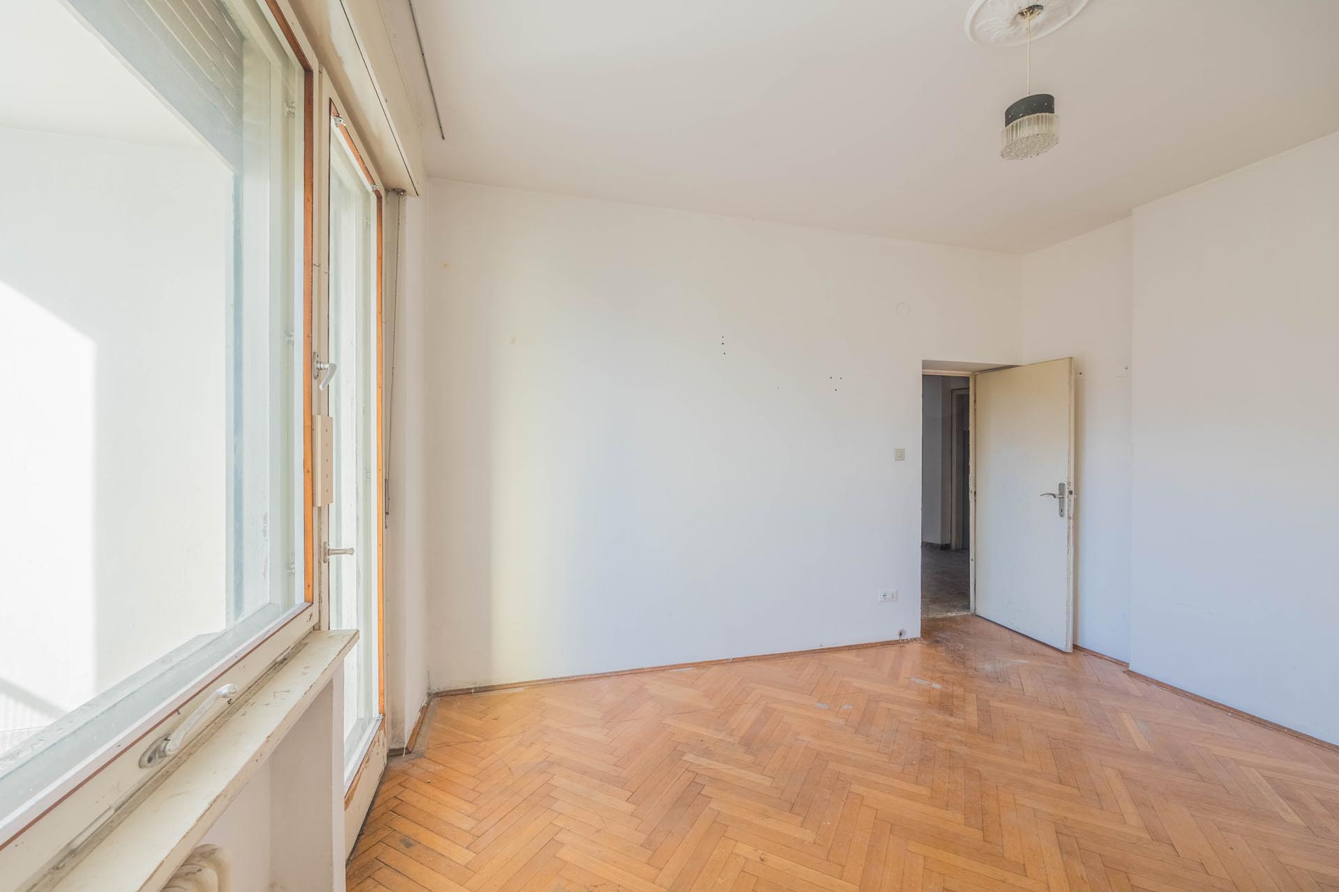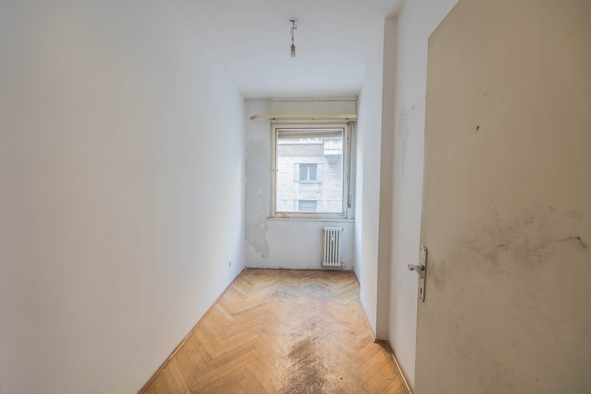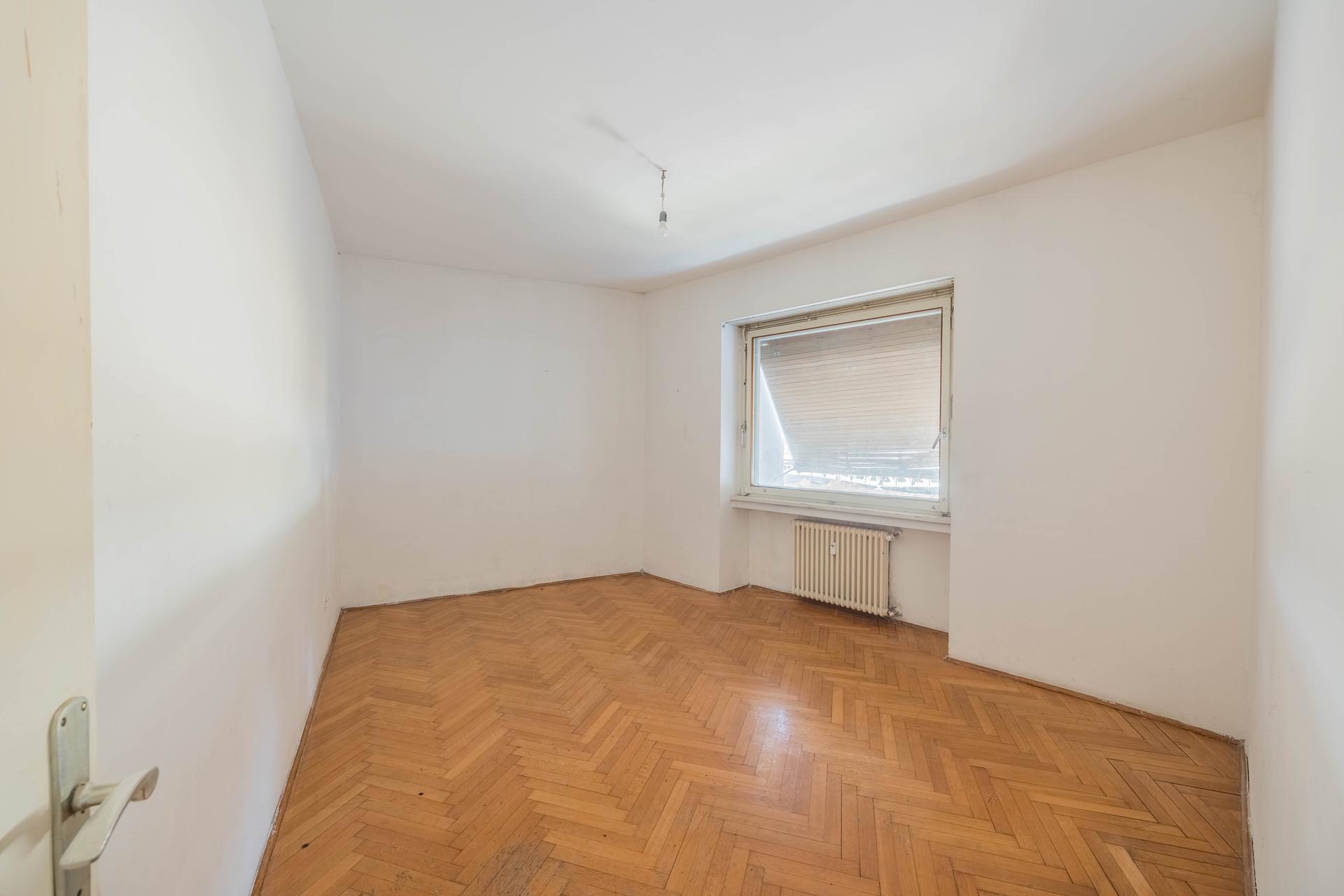 Die Immobilie befindet sich in einem sanierungsbedürftigen Zustand, wodurch umfangreiche Gestaltungsmöglichkeiten bestehen. So könnte die Wohnung nach eigenen Vorstellungen modernisiert oder alternativ in drei separate Einheiten aufgeteilt werden, beispielsweise in zwei 2-Zimmer-Wohnungen sowie eine 1-Zimmer-Wohnung. Besonders wertvoll sind die bestehenden Parkettböden, die erhalten und restauriert werden könnten, um den historischen Charme der Räume zu bewahren.