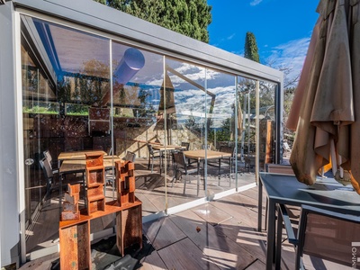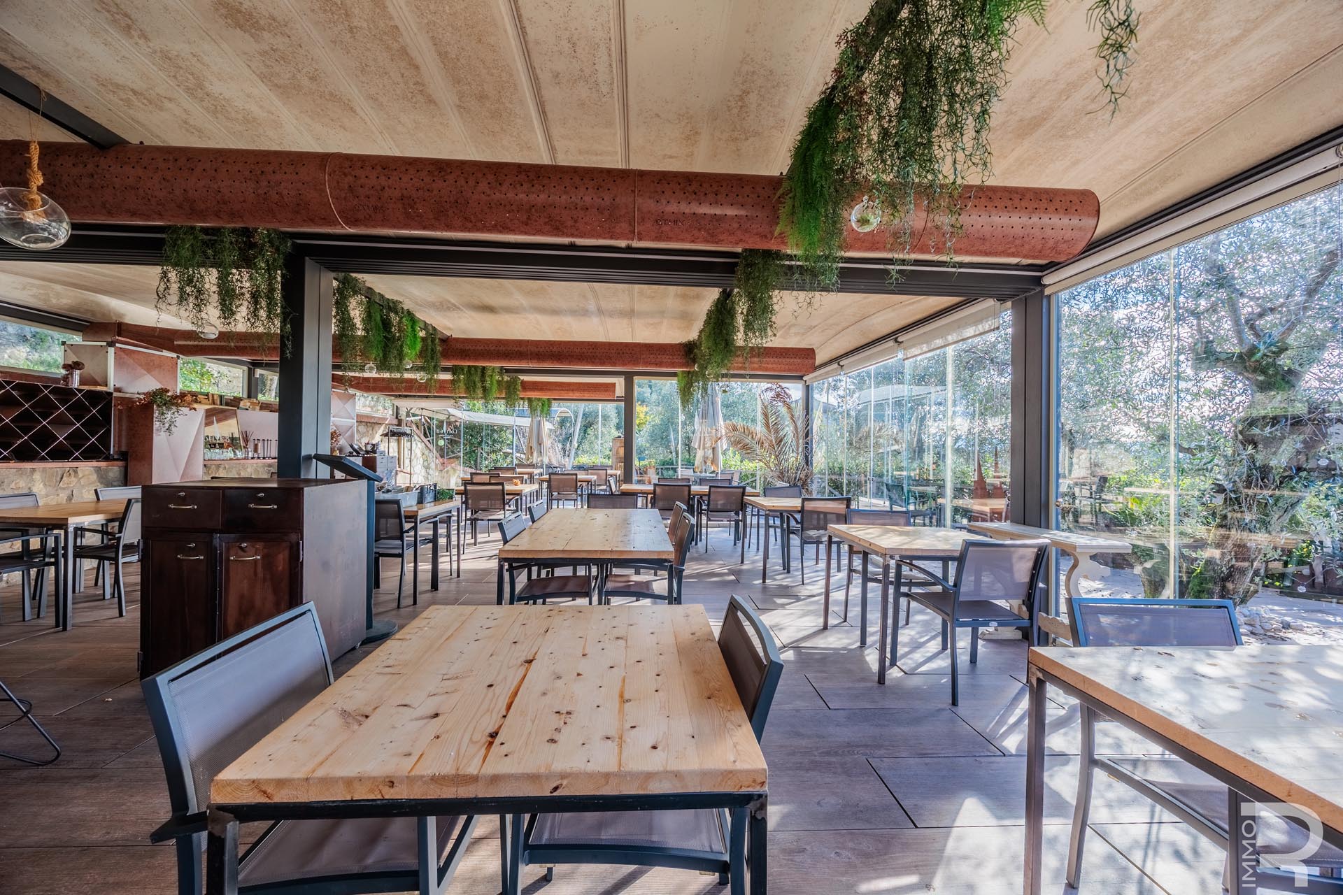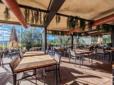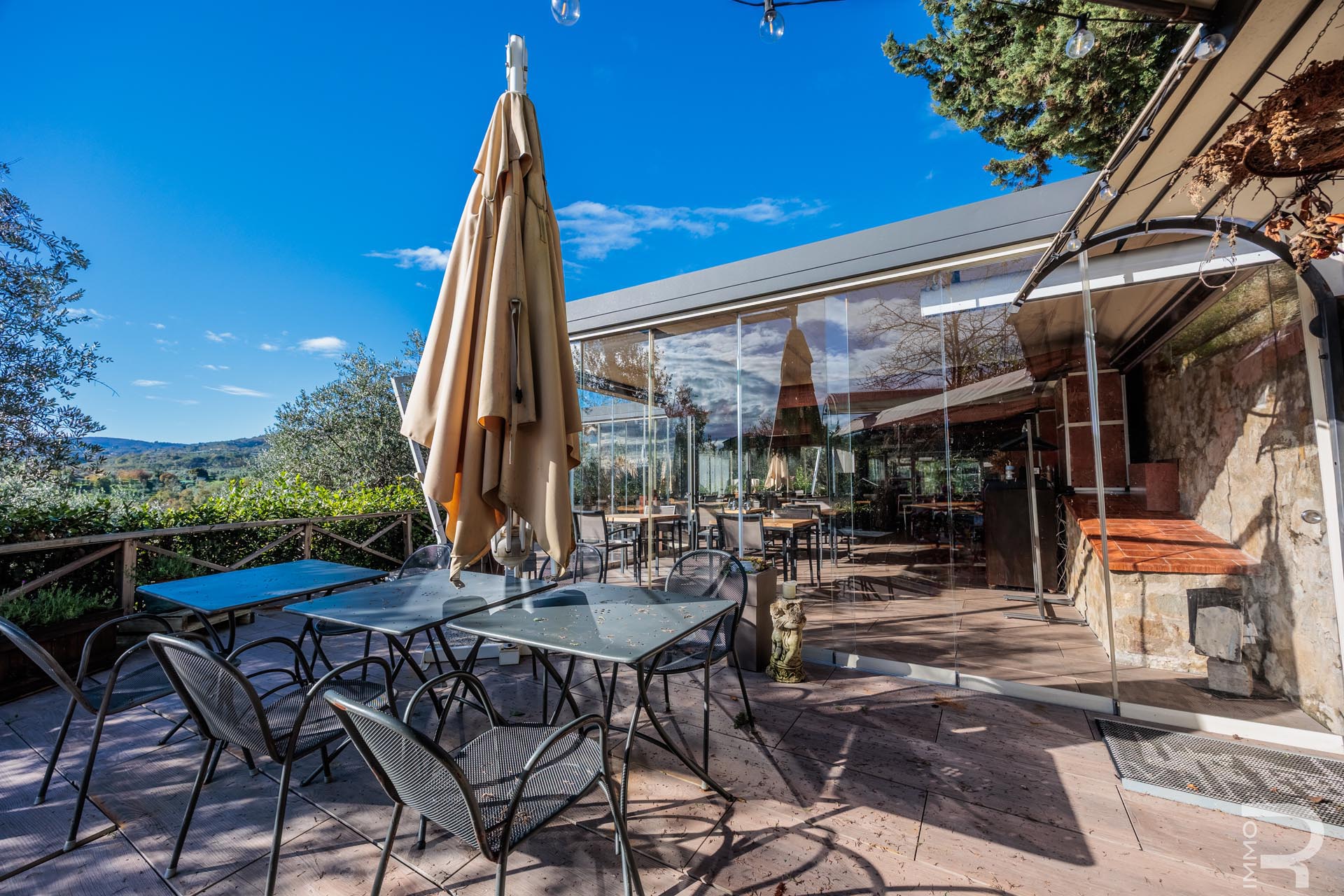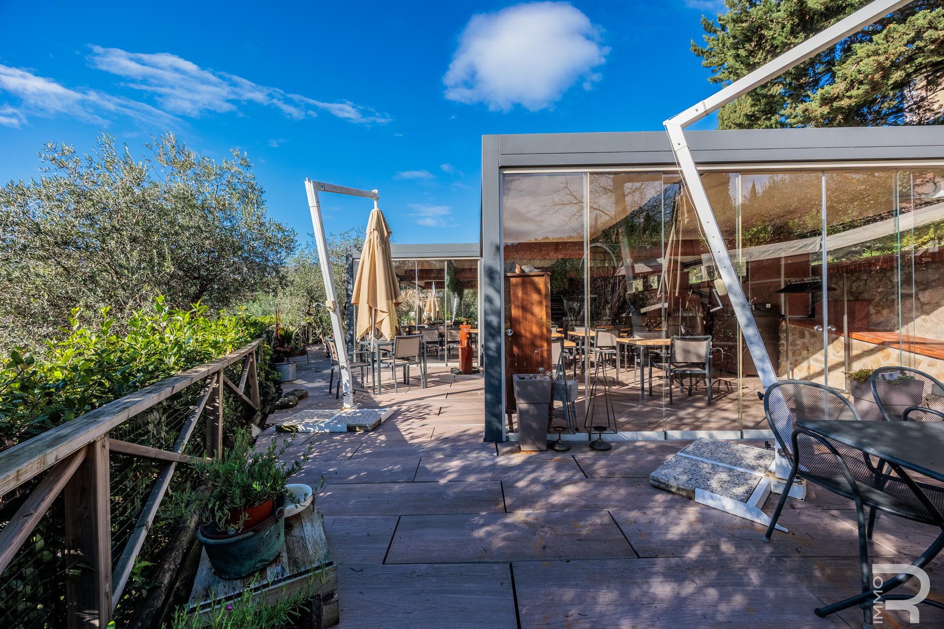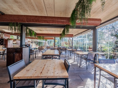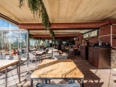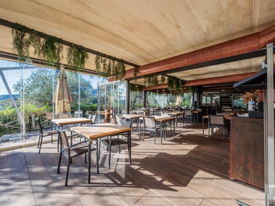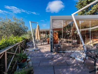 Auf einer höher gelegenen Terrasse, umgeben von Olivenbäumen, befindet sich das stilvolle Veranda-Restaurant mit offener Profiküche. Ein isolierter Container dient dort als Speisekammer, während ein kleines Holzhaus mit zwei Toiletten den Gästen zur Verfügung steht. Zwei großzügige Parkplätze am Rand des Grundstücks sorgen für bequeme Erreichbarkeit.