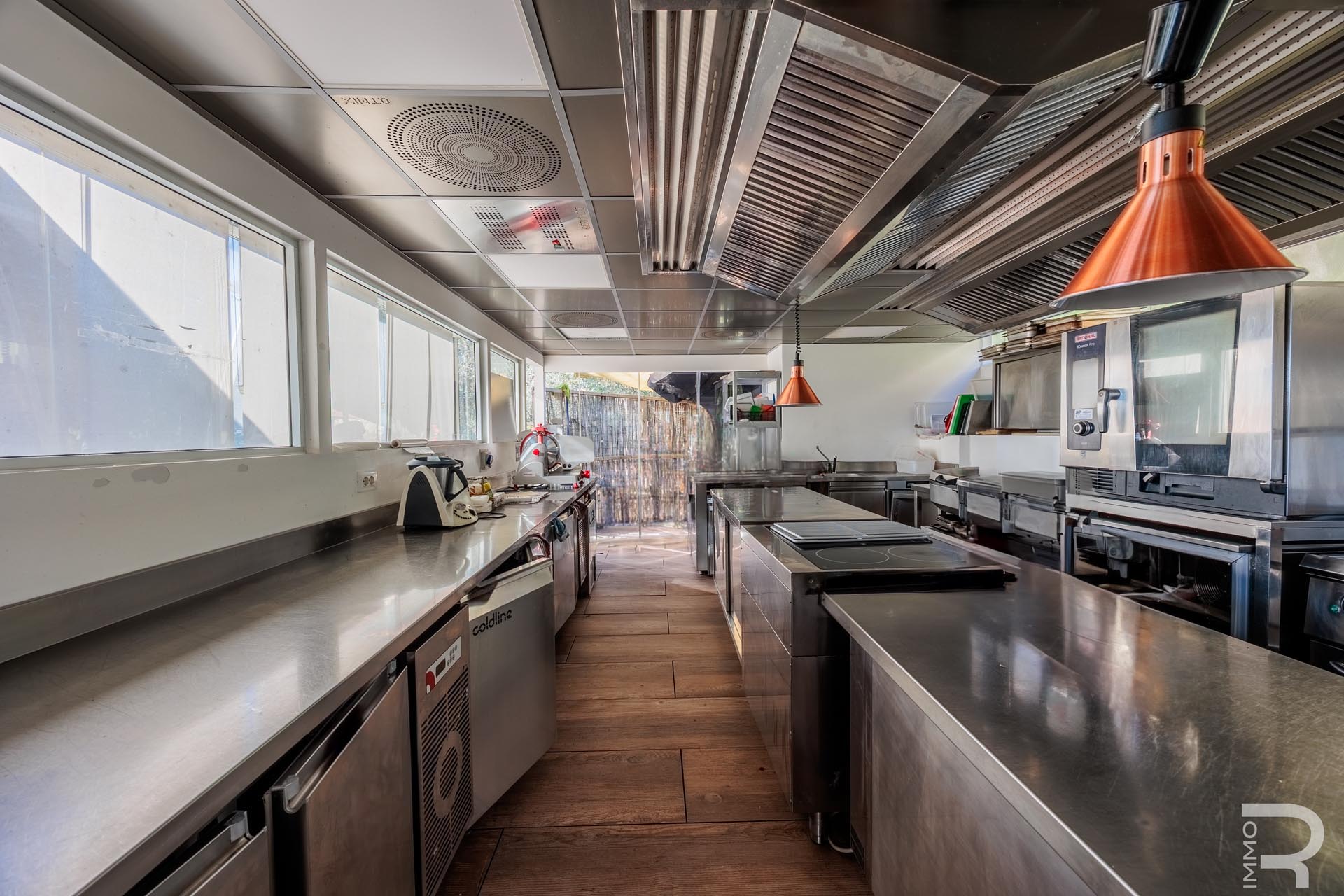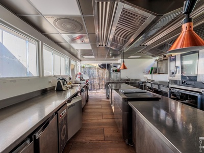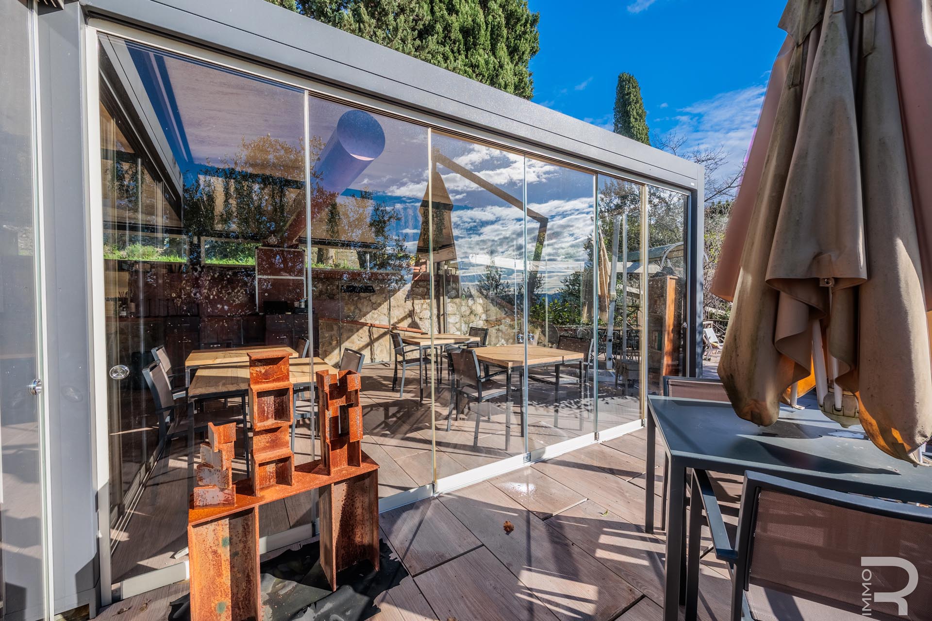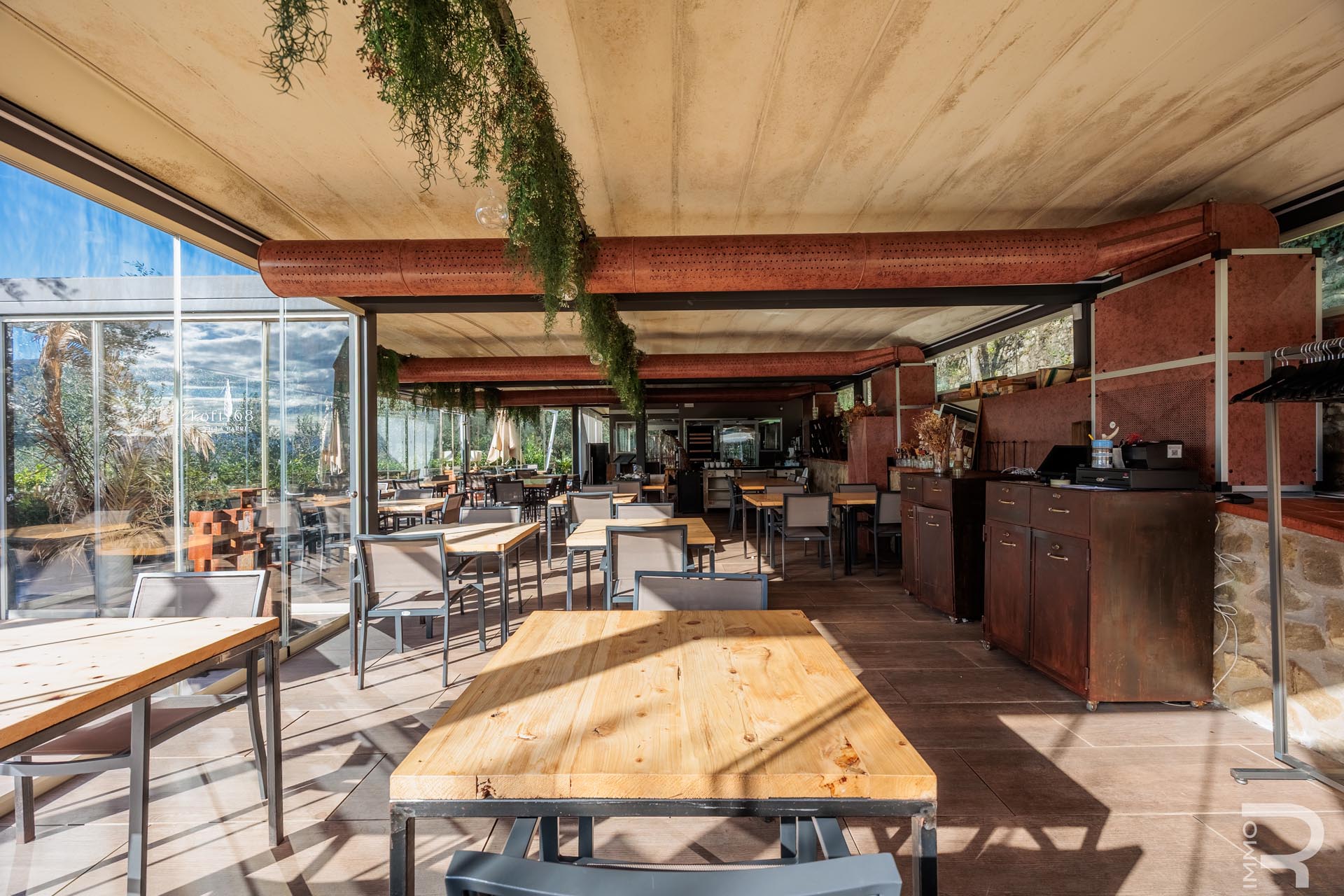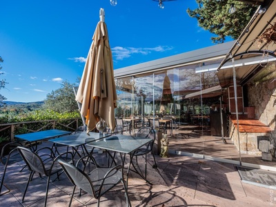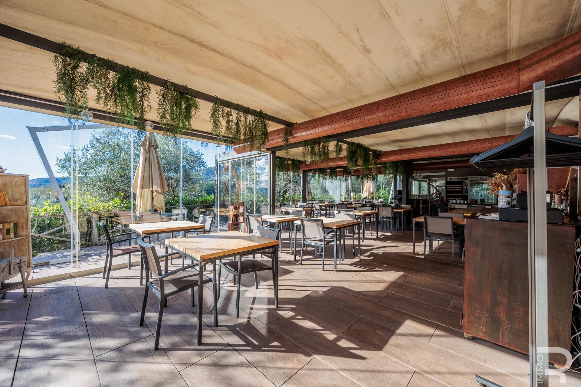 Auf einer höher gelegenen Terrasse, umgeben von Olivenbäumen, befindet sich das stilvolle Veranda-Restaurant mit offener Profiküche. Ein isolierter Container dient dort als Speisekammer, während ein kleines Holzhaus mit zwei Toiletten den Gästen zur Verfügung steht. Zwei großzügige Parkplätze am Rand des Grundstücks sorgen für bequeme Erreichbarkeit.