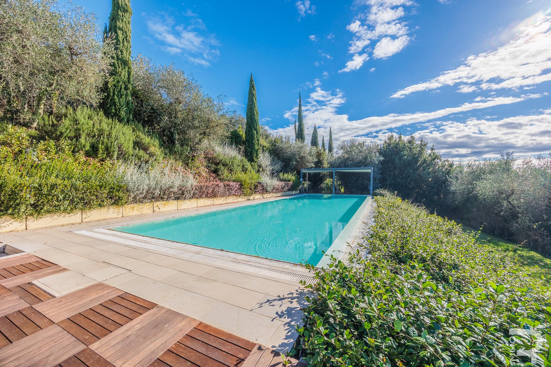 Das Anwesen umfasst insgesamt rund 19 Hektar Land, die sich bis zum Gipfel des eigenen Hügels erstrecken. Neben etwa 800 Olivenbäumen und 15.000 Heilpflanzen befindet sich hier auch ein Bienenhaus mit 40 Bienenstöcken; ein Teil des Geländes ist bewaldet. Die Bewirtschaftung wird durch zahlreiche landwirtschaftliche Geräte unterstützt, sodass die Villa Parri ihre einzigartige natürliche Umgebung in voller Pracht bewahren kann.