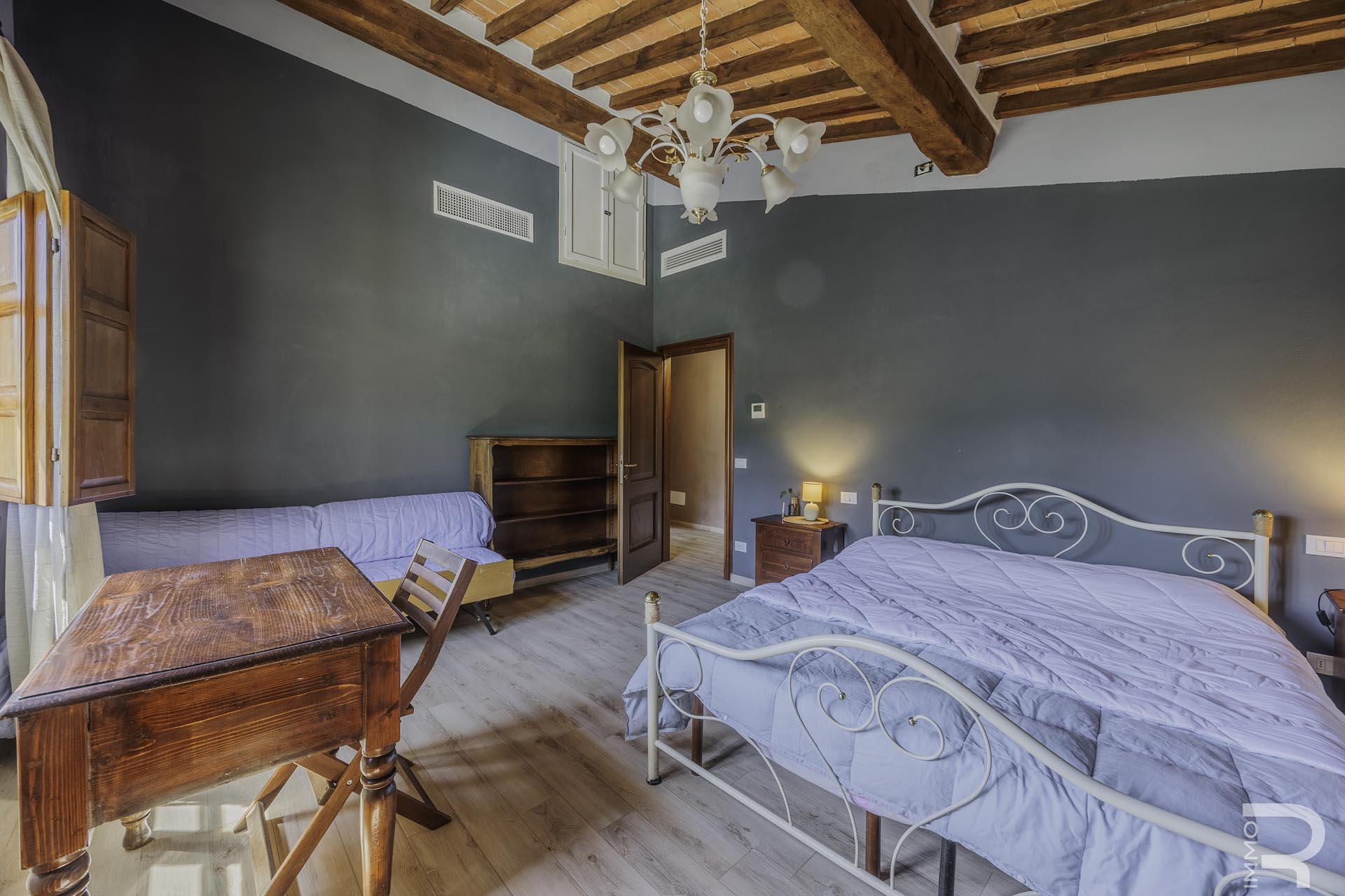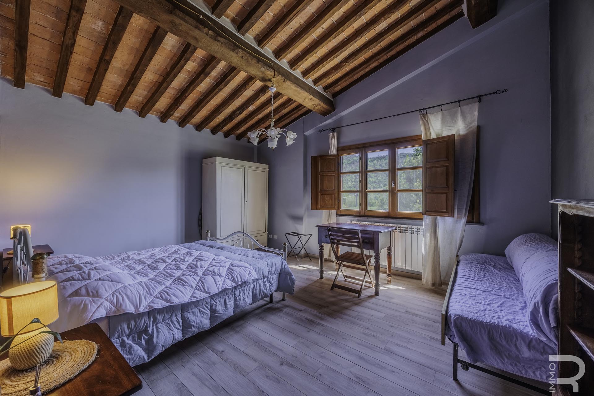 Das Bauernhaus ist aktuell in zwei Wohneinheiten unterteilt: Im Erdgeschoss befinden sich drei Schlafzimmer und drei Badezimmer, während das Obergeschoss ebenfalls über drei Schlafzimmer und drei Badezimmer verfügt. Diese Aufteilung eignet sich hervorragend für die touristische Vermietung oder für die Nutzung durch mehrere Parteien.