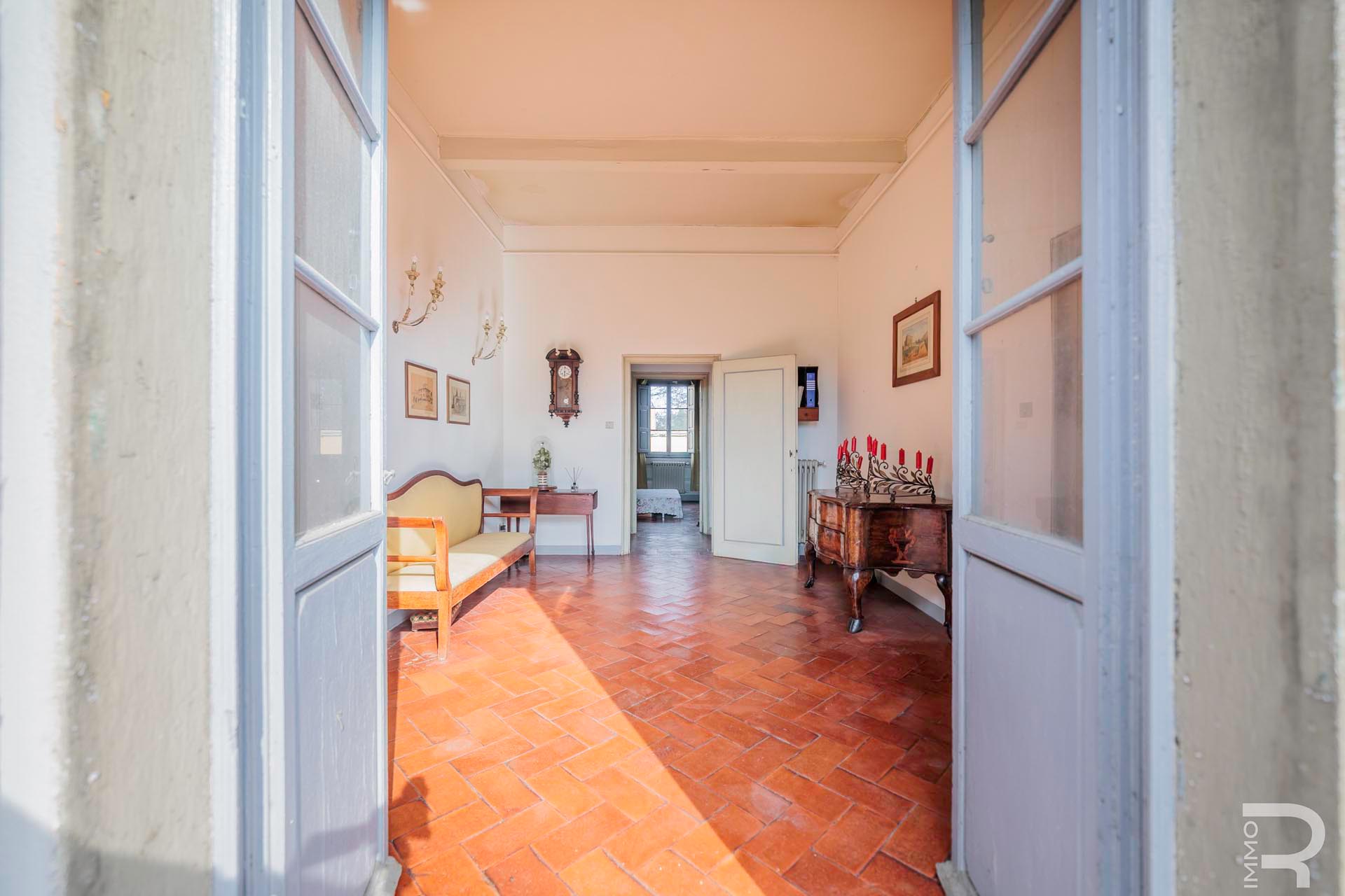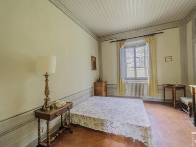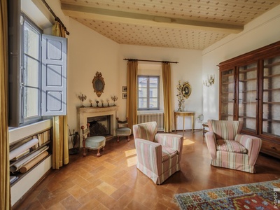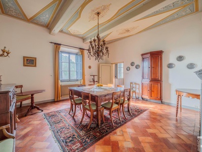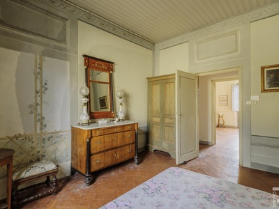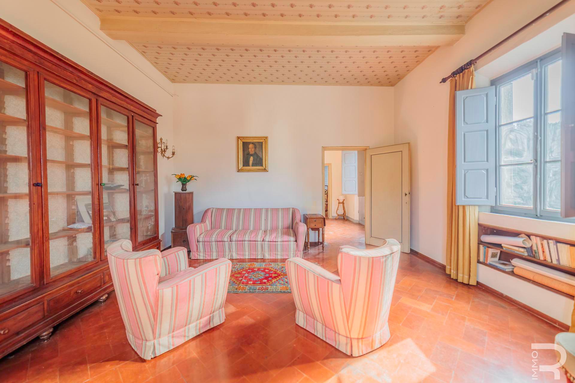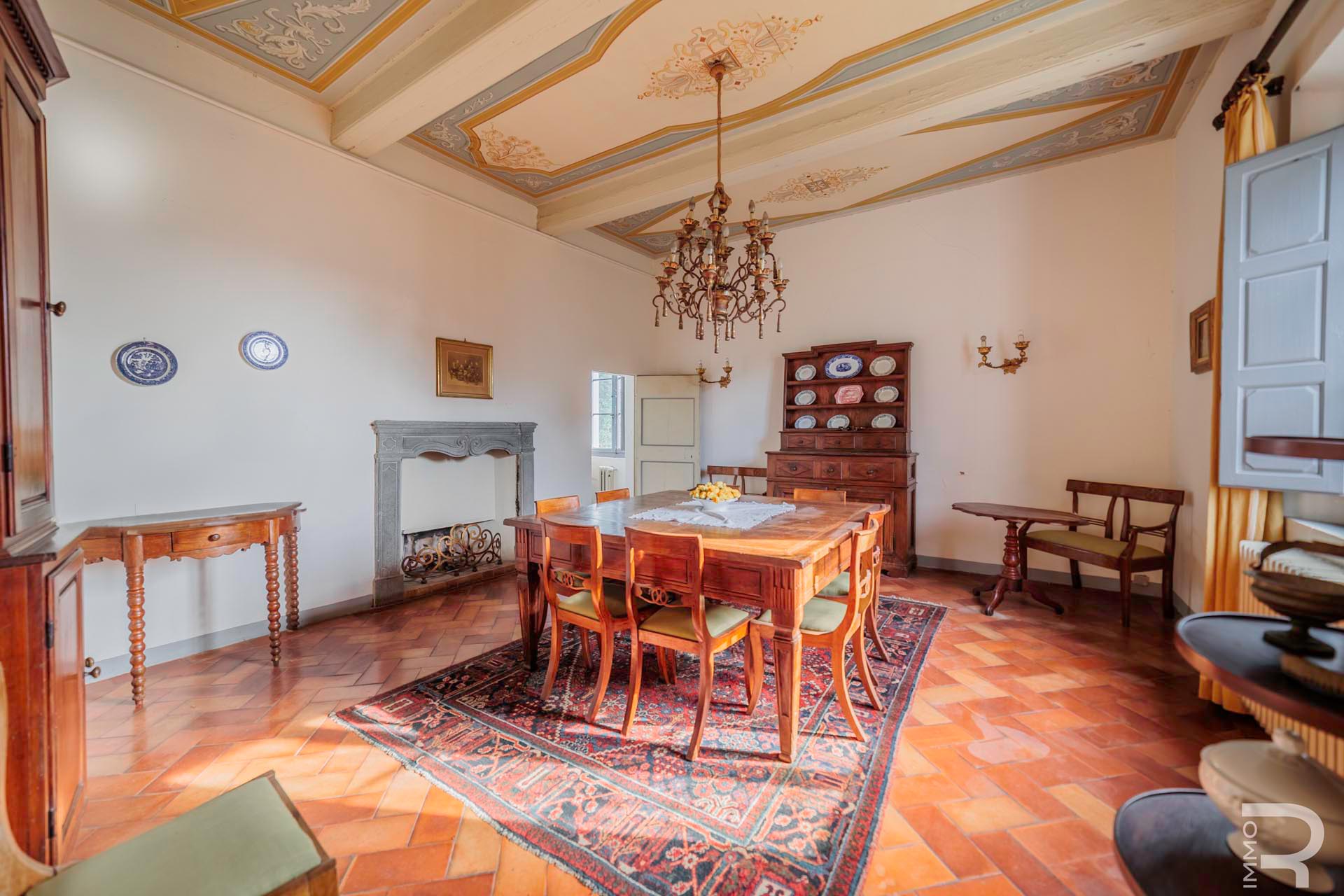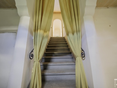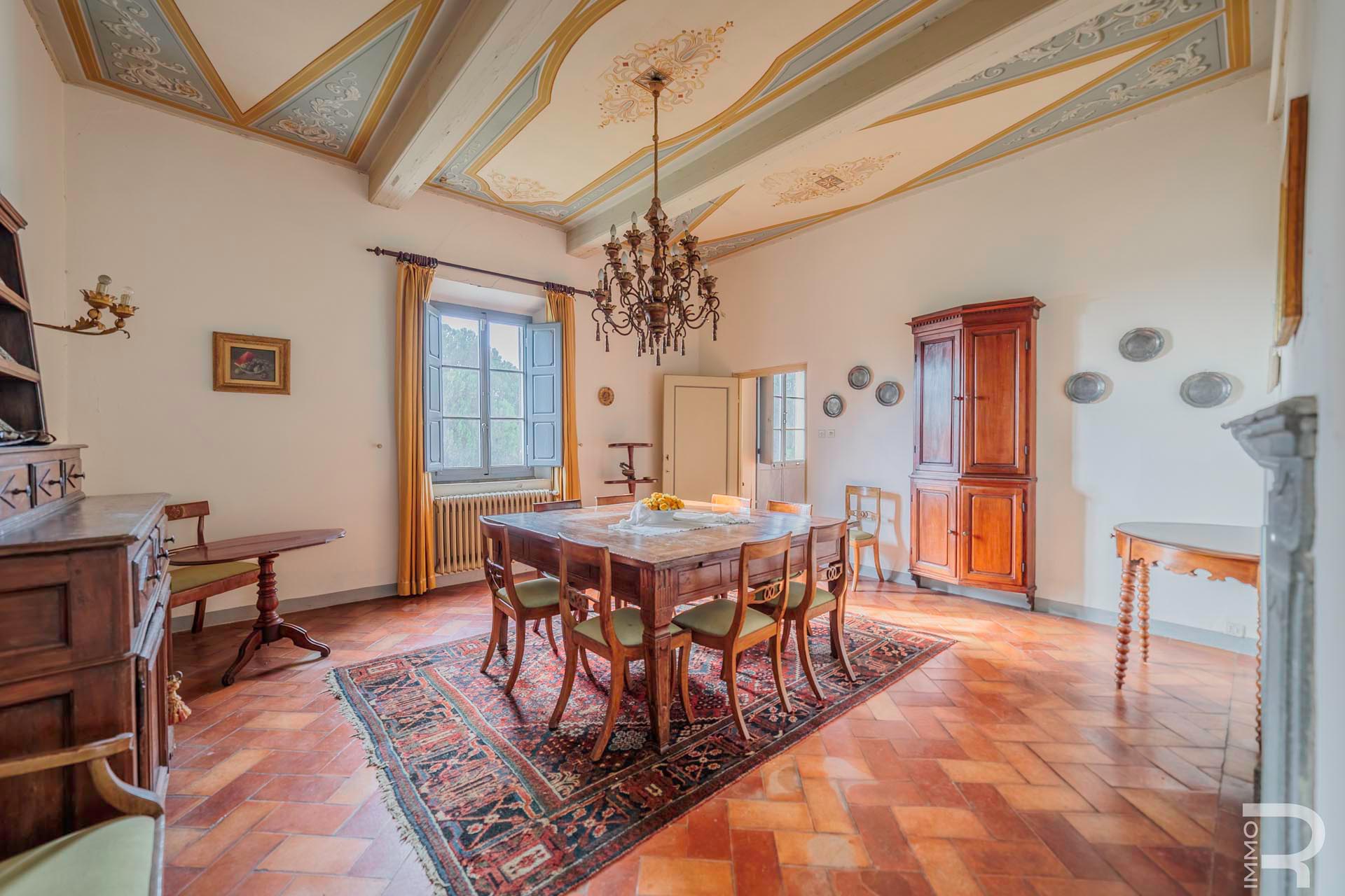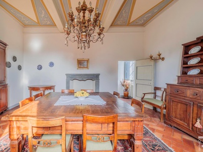 Die Villa erstreckt sich über zwei Etagen und verfügt über insgesamt 6 Schlafzimmer sowie 4 Badezimmer. Großzügige Räume und die klassische Architektur prägen das Erscheinungsbild. Besonders hervorzuheben sind einige Innenwände, die mit dekorativen Fresken verziert sind und den historischen Charakter der Immobilie unterstreichen.