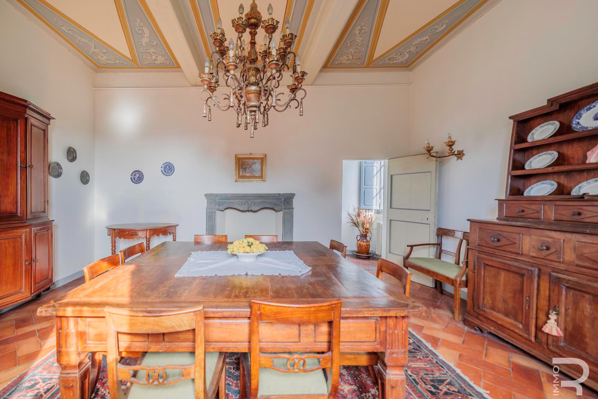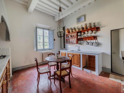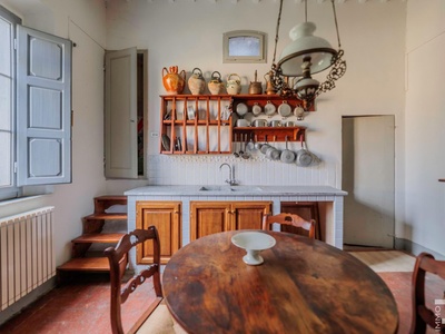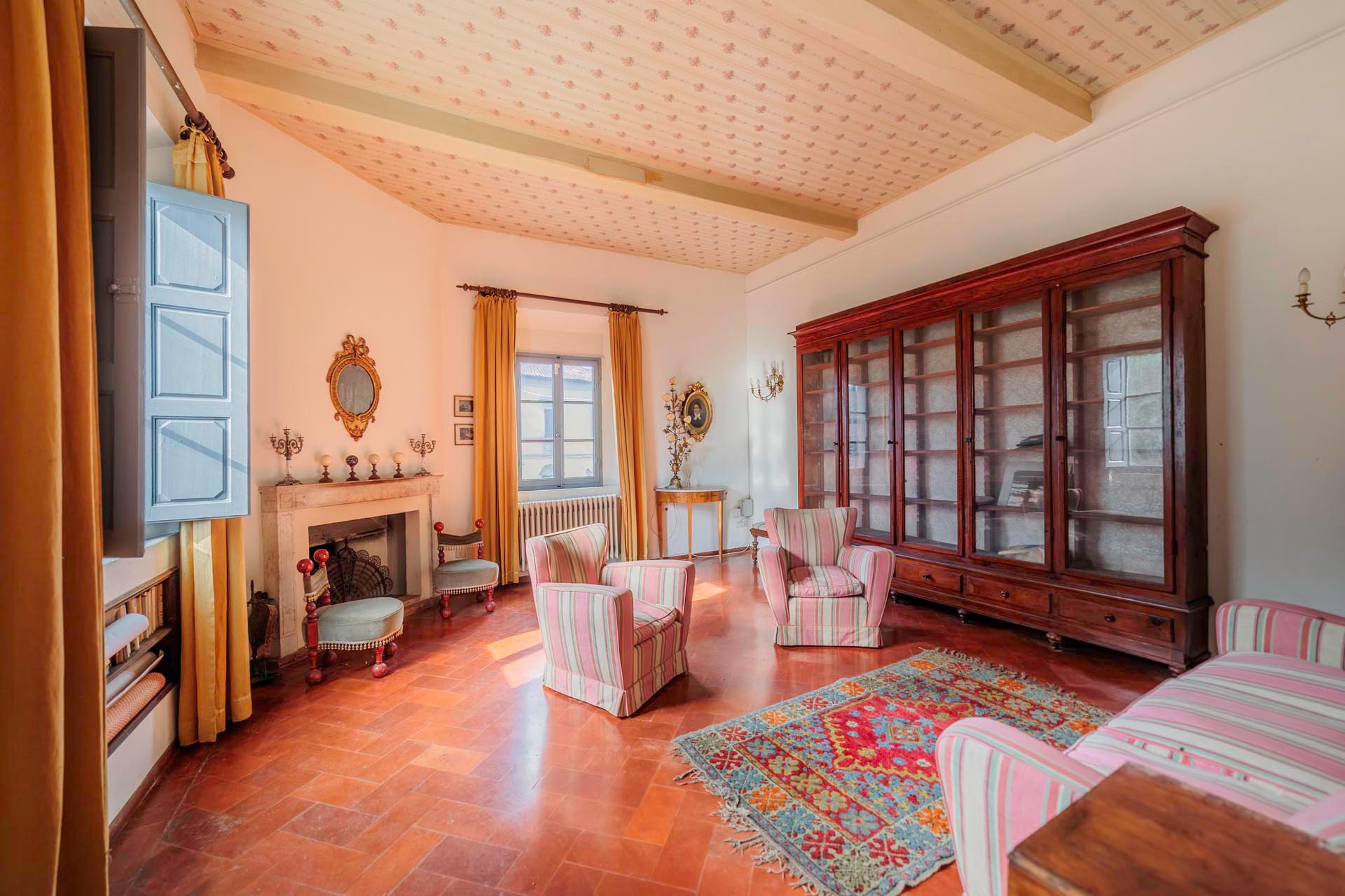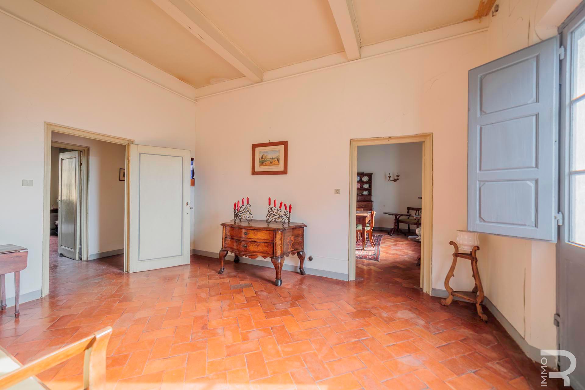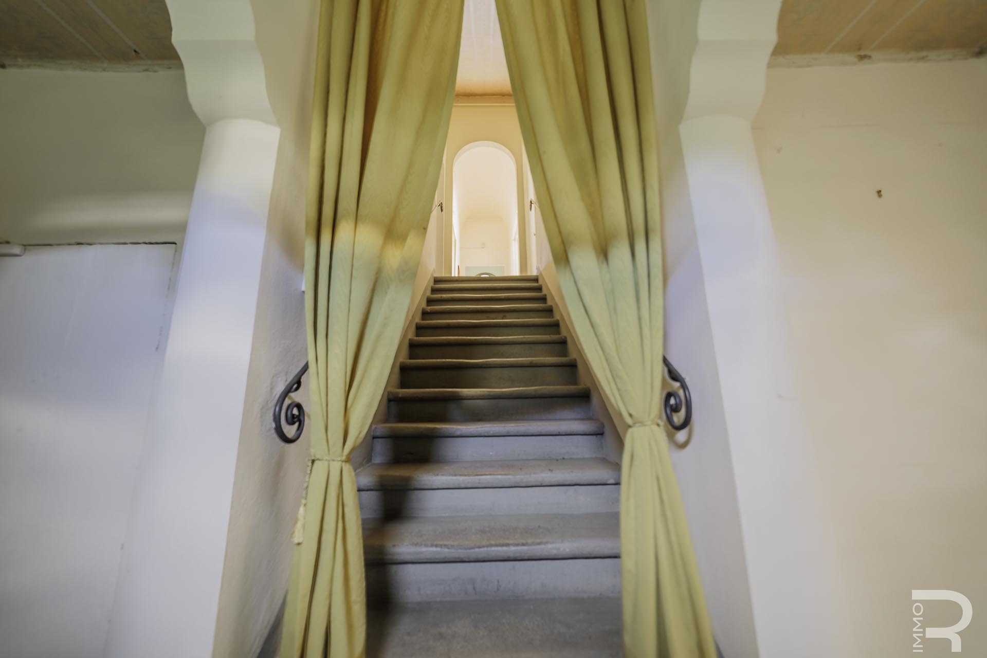 Die Villa erstreckt sich über zwei Etagen und verfügt über insgesamt 6 Schlafzimmer sowie 4 Badezimmer. Großzügige Räume und die klassische Architektur prägen das Erscheinungsbild. Besonders hervorzuheben sind einige Innenwände, die mit dekorativen Fresken verziert sind und den historischen Charakter der Immobilie unterstreichen.