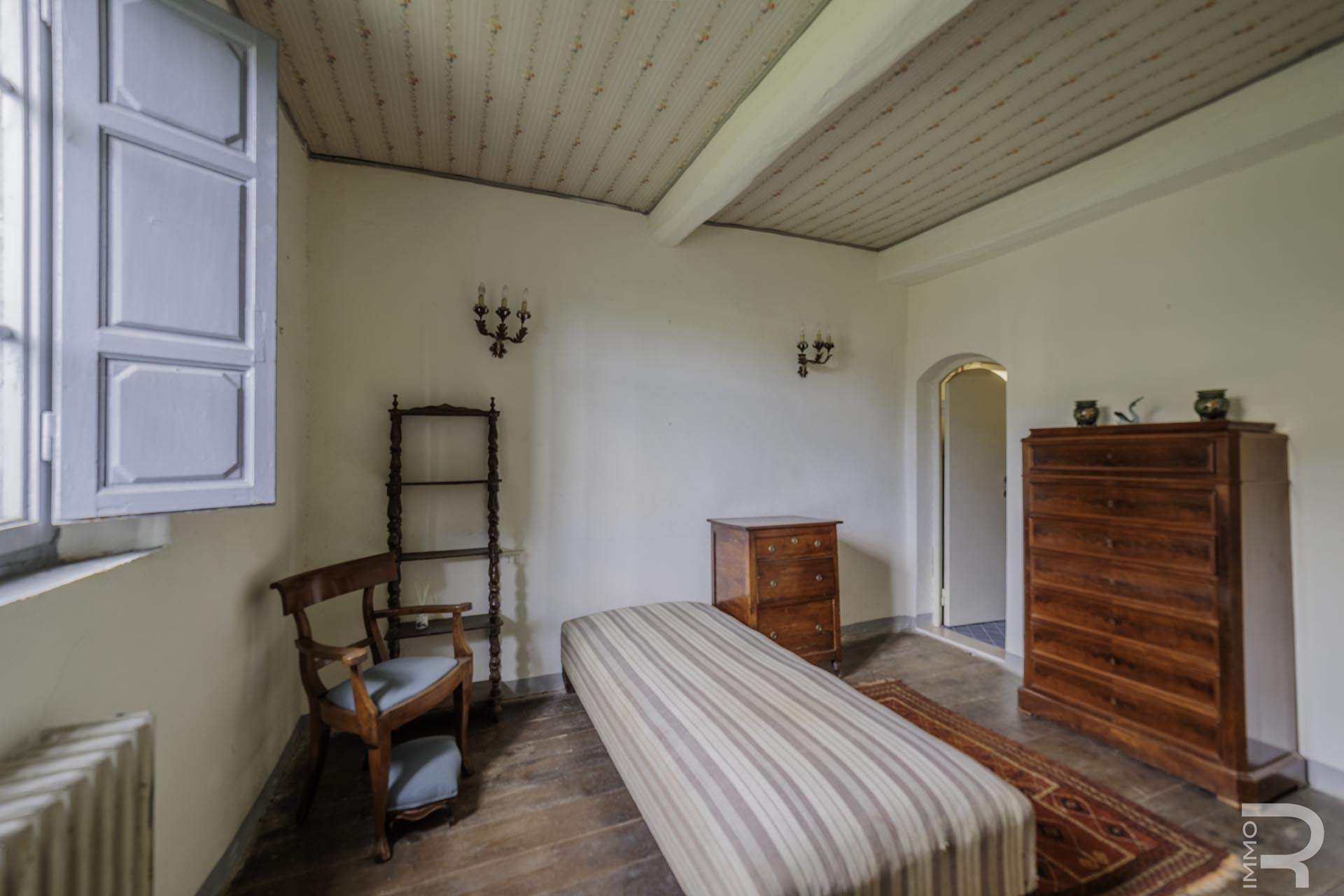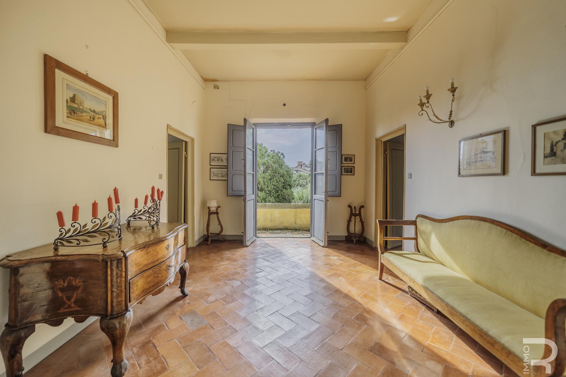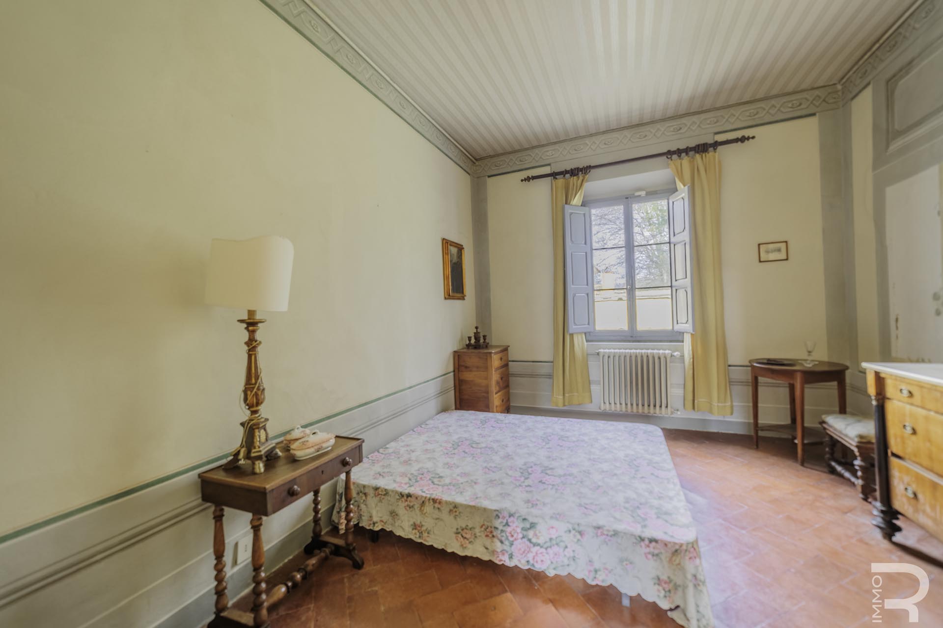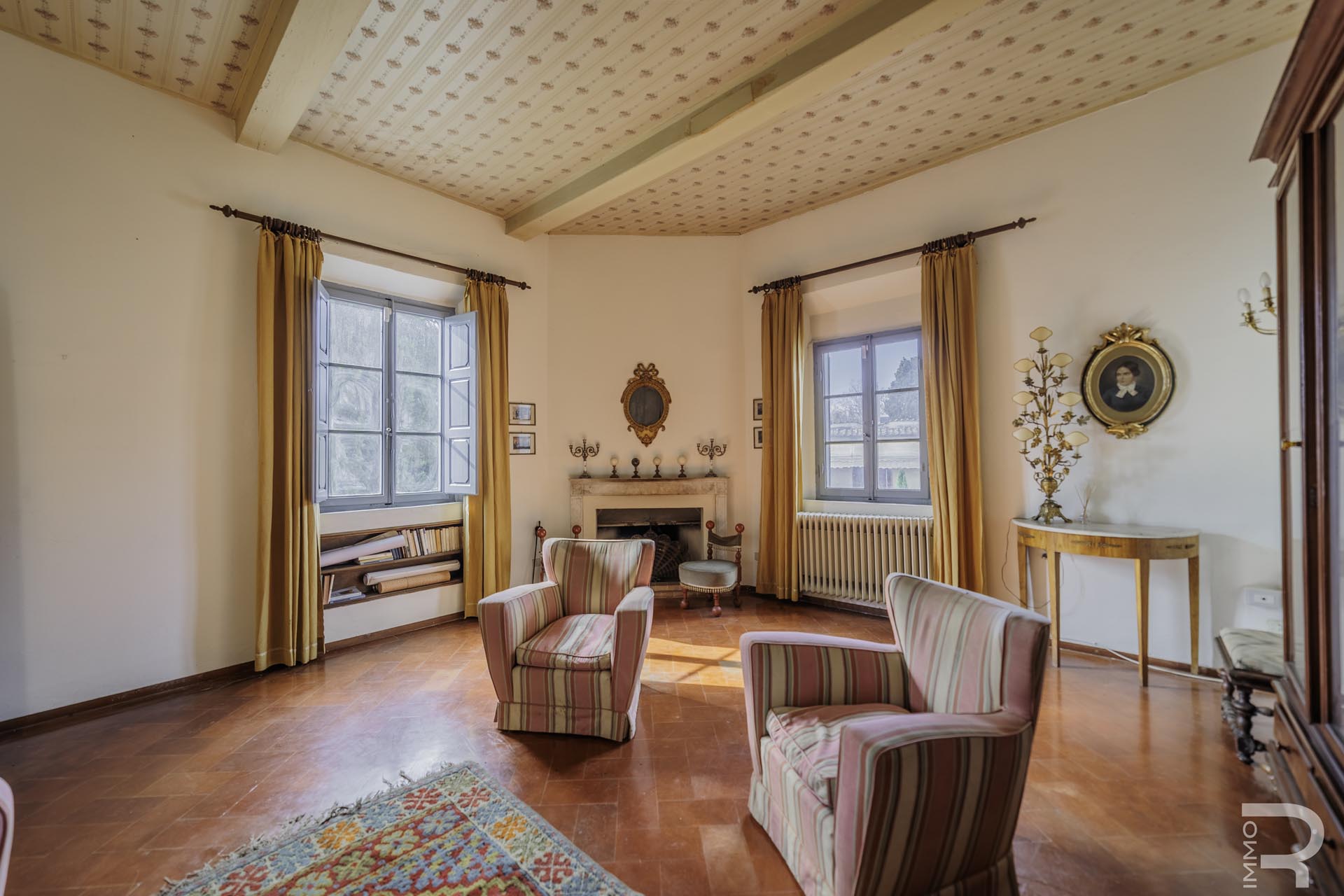 Die Villa erstreckt sich über zwei Etagen und verfügt über insgesamt 6 Schlafzimmer sowie 4 Badezimmer. Großzügige Räume und die klassische Architektur prägen das Erscheinungsbild. Besonders hervorzuheben sind einige Innenwände, die mit dekorativen Fresken verziert sind und den historischen Charakter der Immobilie unterstreichen.