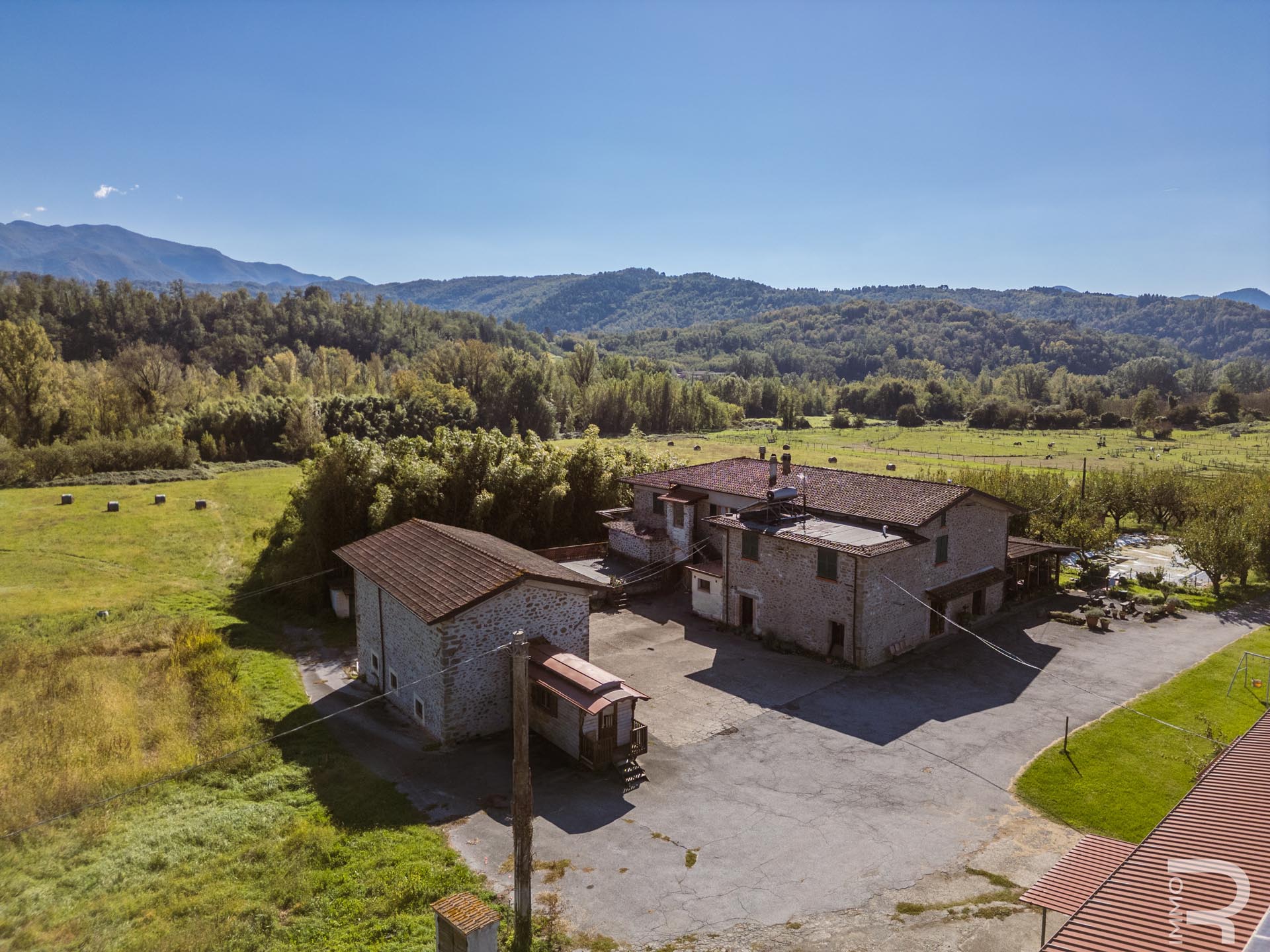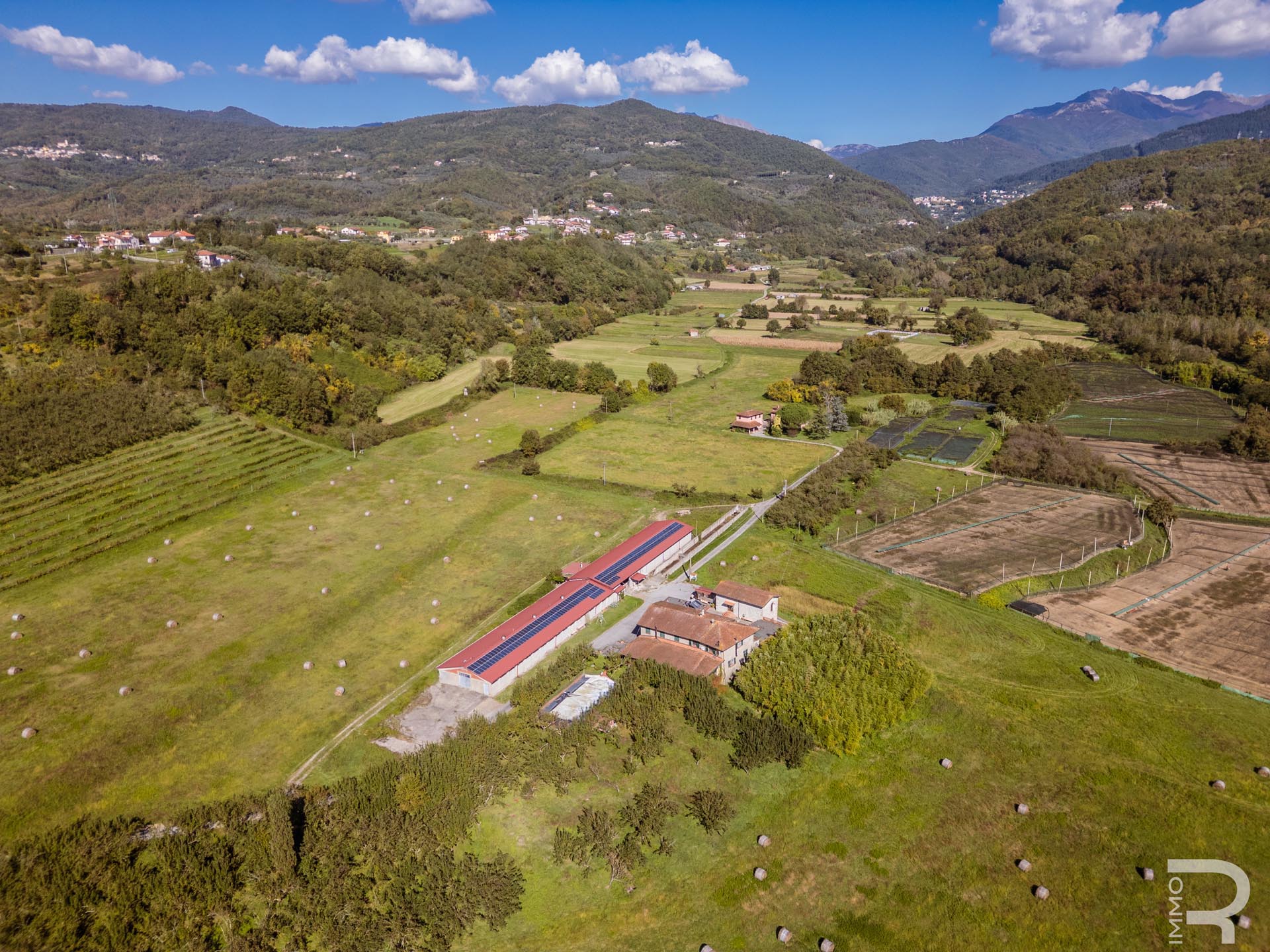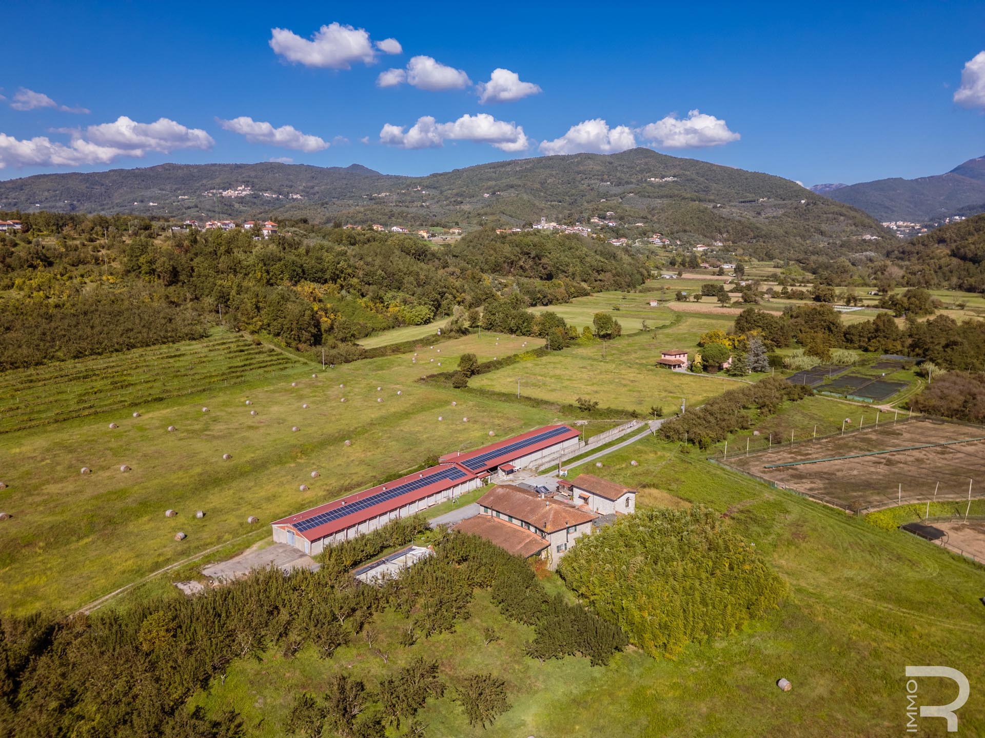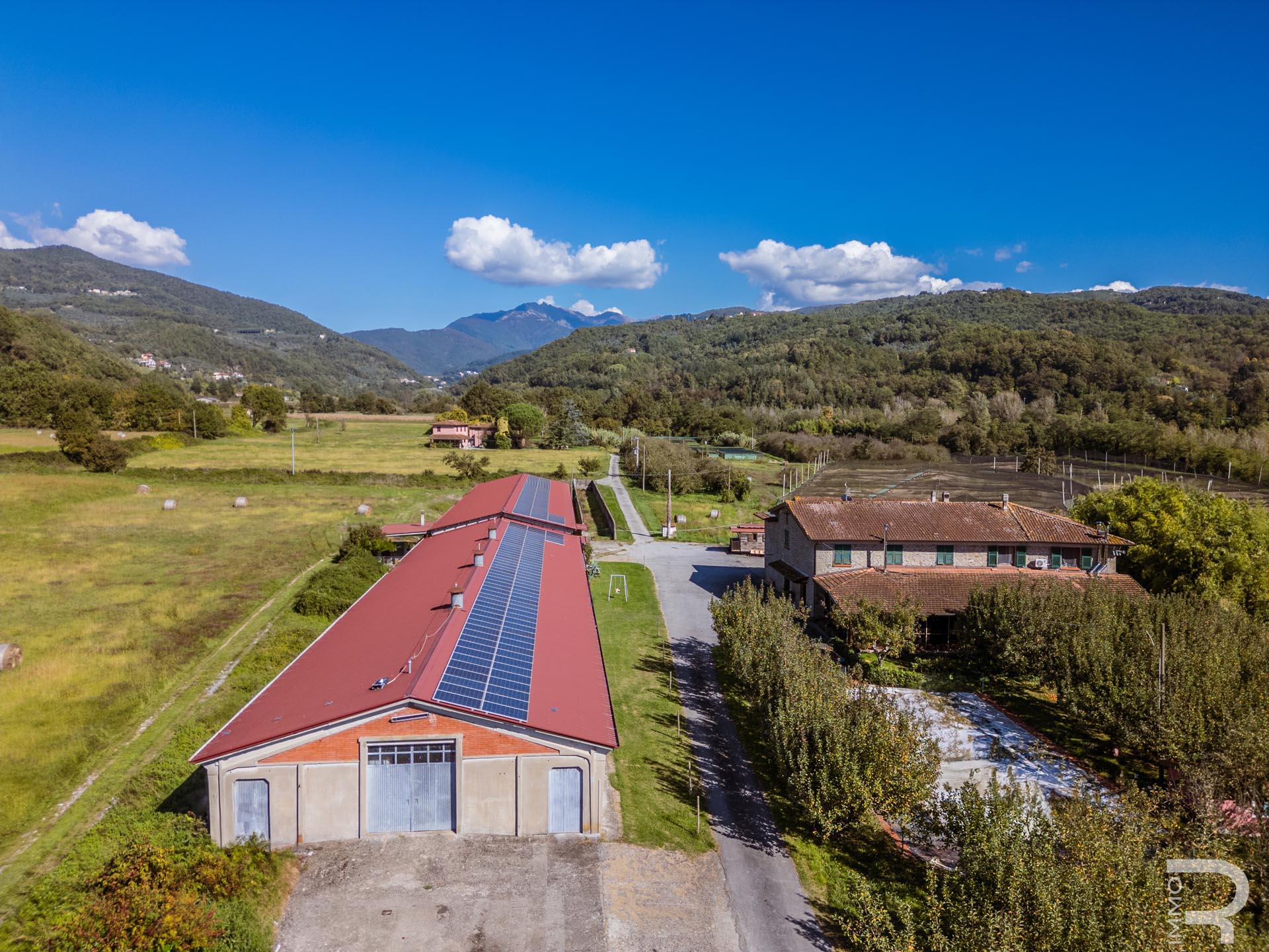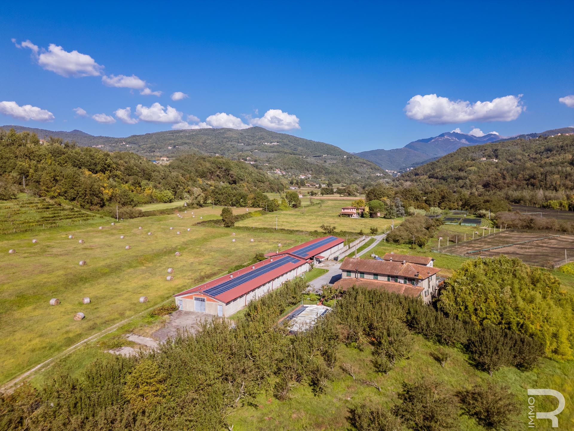 Ergänzend dazu gibt es eine Scheune mit einem flexiblen Mehrzweckraum, ideal für Workshops, Lagerung oder Veranstaltungen. Das zweite Bauernhaus beherbergt sechs voll ausgestattete Ferienwohnungen, die perfekt für einen Agriturismo-Betrieb geeignet sind. Eine große Halle mit 1.200 m² rundet das Ensemble ab und eröffnet zusätzliche Möglichkeiten für Lagerung, Produktion oder große Events.
