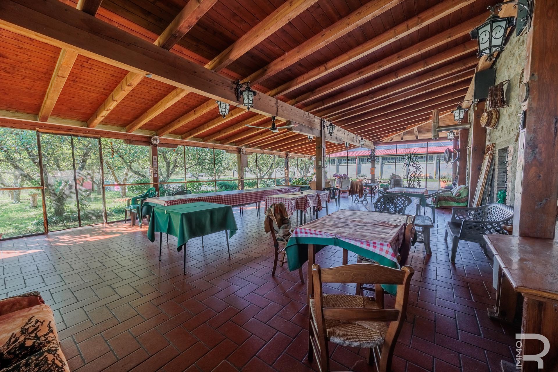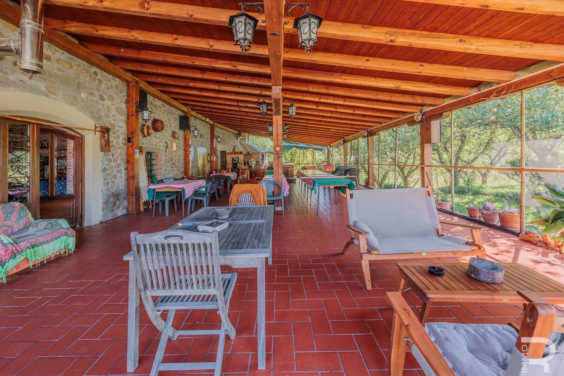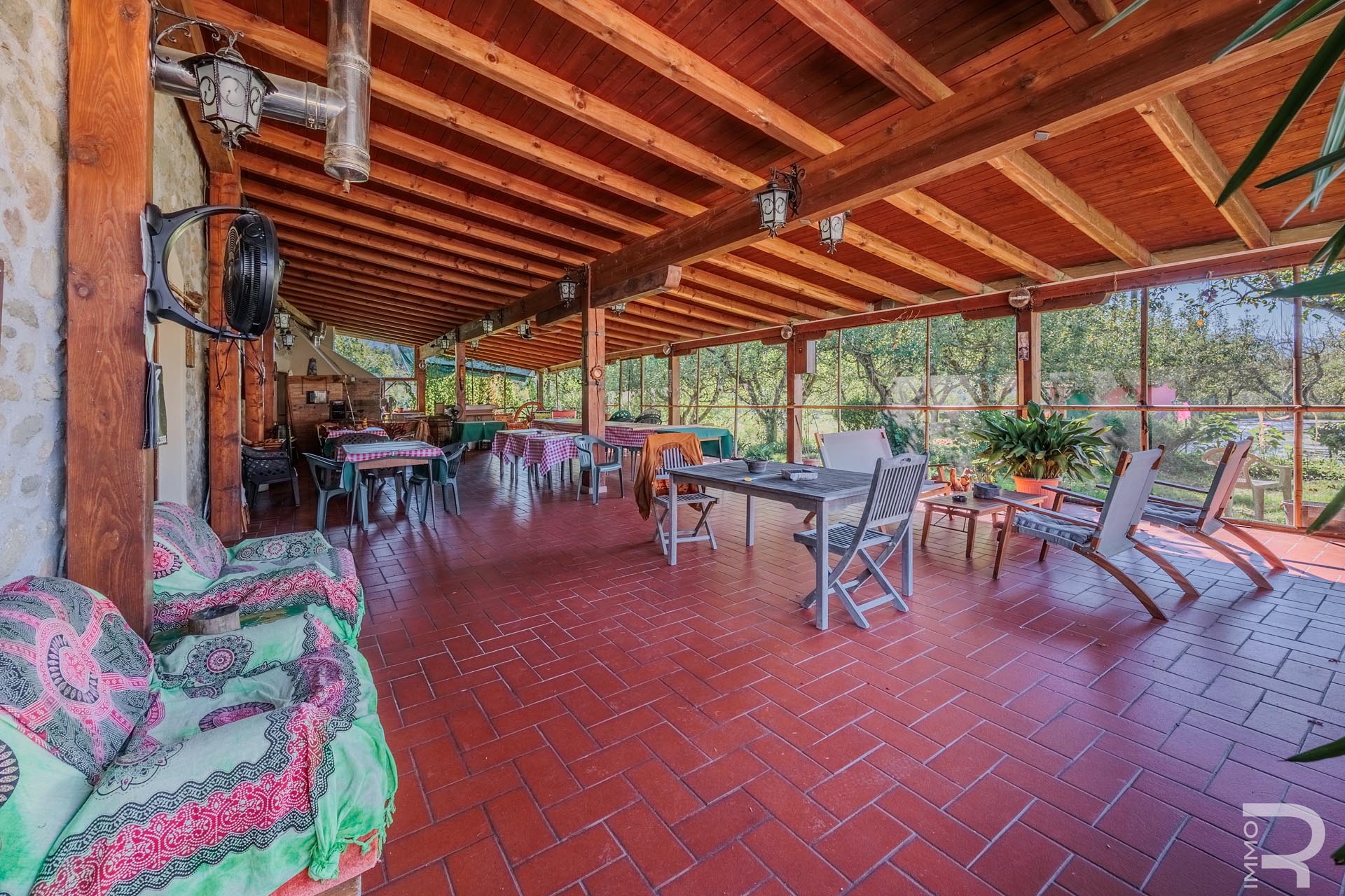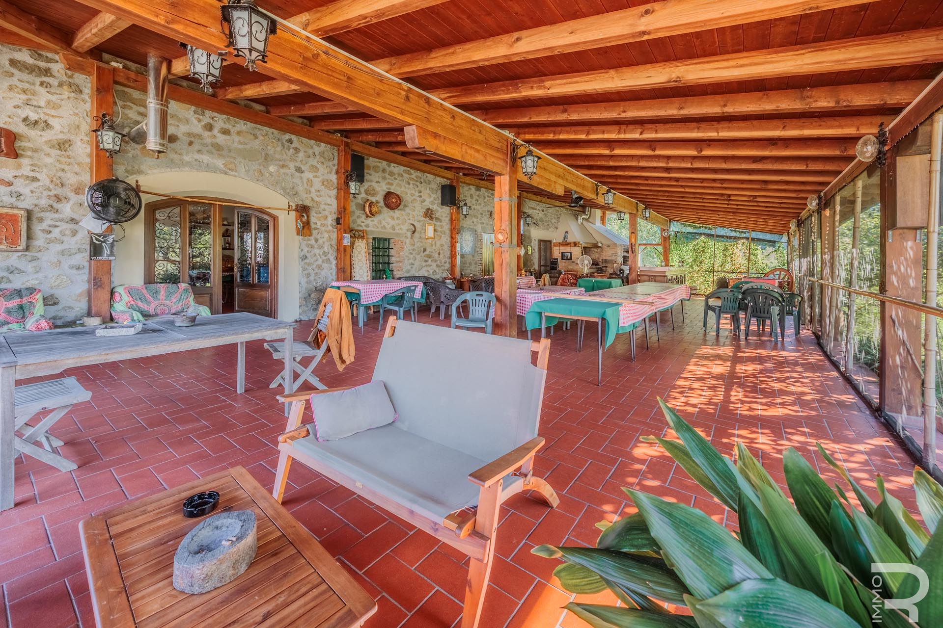 Im Zentrum des Anwesens befindet sich das Haupthaus, das durch seine Vielseitigkeit besticht: Es beherbergt komfortable Zimmer für Kurzzeitvermietungen, ein Restaurant mit professioneller Küche sowie einen großen Saal. Eine großzügige, 140 m² große Veranda mit Holzofen und Grill lädt zum geselligen Verweilen ein und bietet eine hervorragende Plattform für Veranstaltungen im Freien.