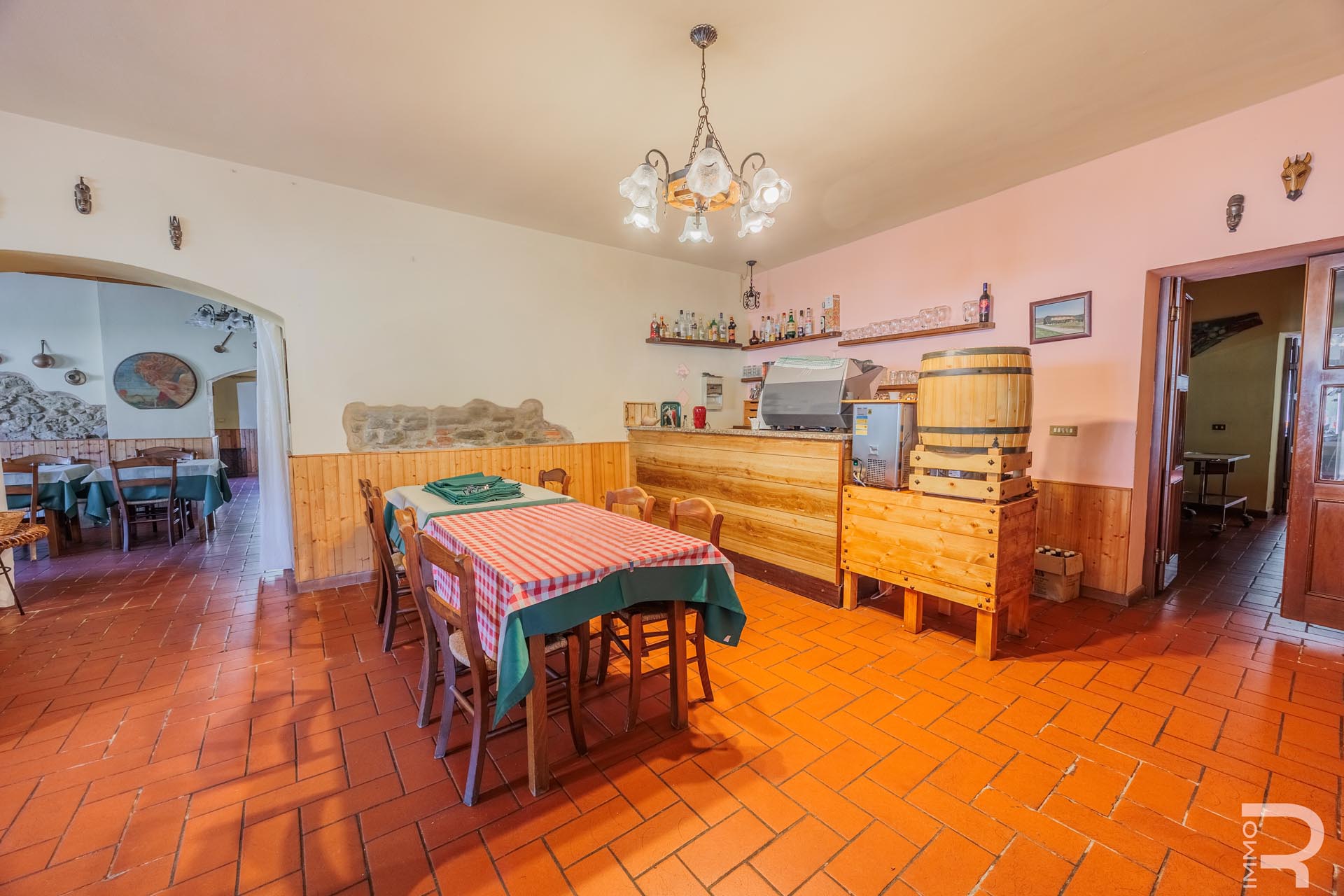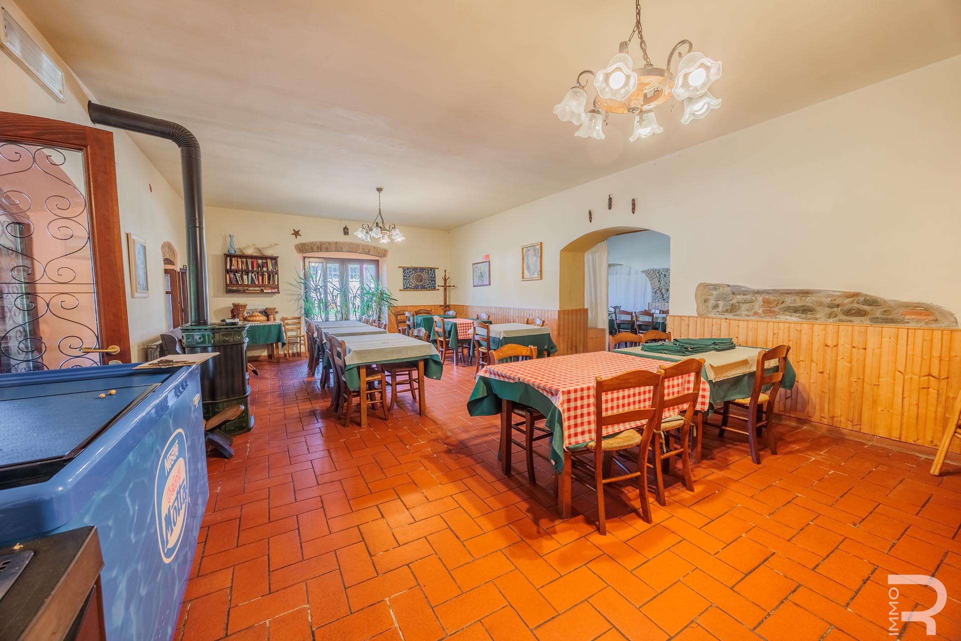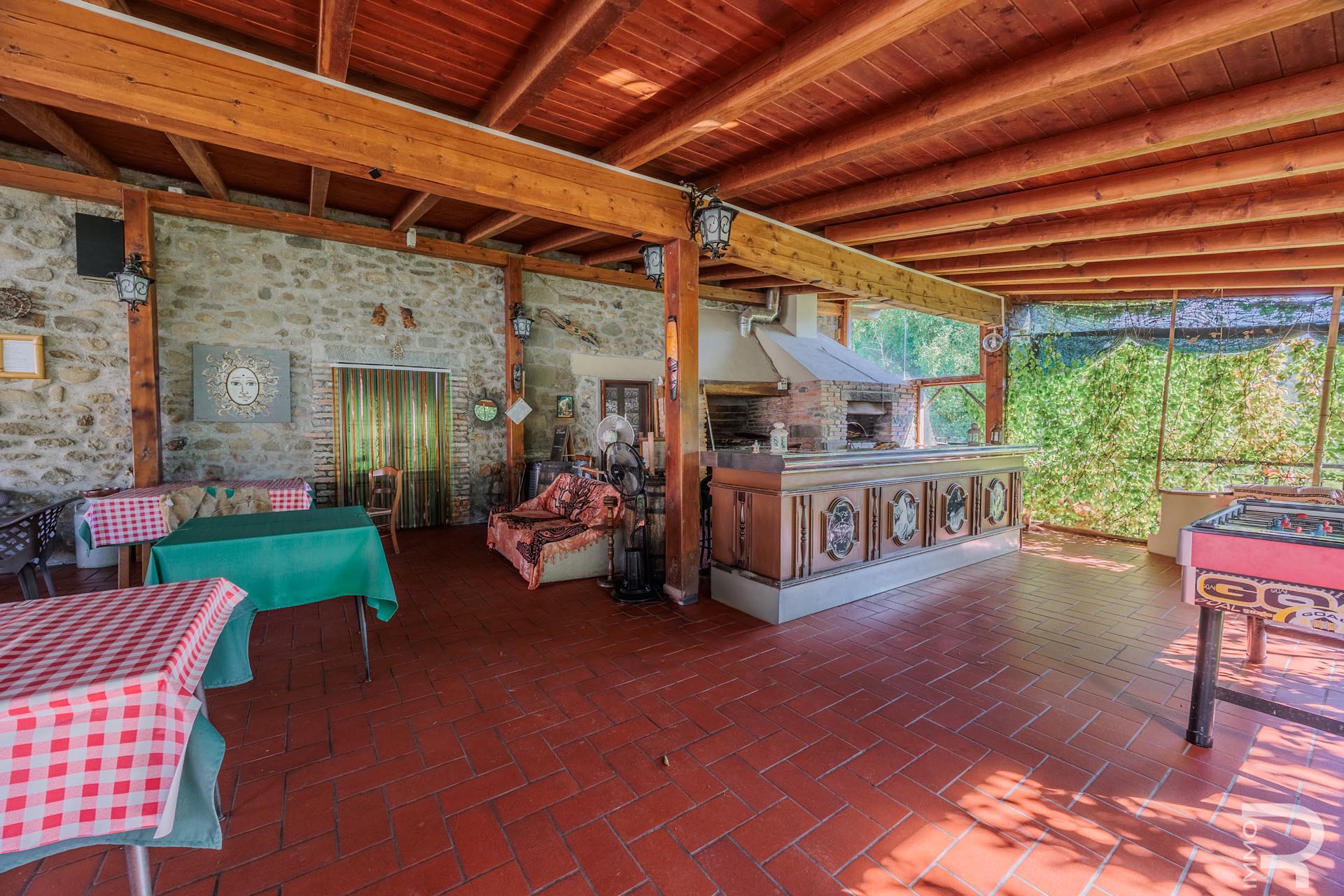 Im Zentrum des Anwesens befindet sich das Haupthaus, das durch seine Vielseitigkeit besticht: Es beherbergt komfortable Zimmer für Kurzzeitvermietungen, ein Restaurant mit professioneller Küche sowie einen großen Saal. Eine großzügige, 140 m² große Veranda mit Holzofen und Grill lädt zum geselligen Verweilen ein und bietet eine hervorragende Plattform für Veranstaltungen im Freien.