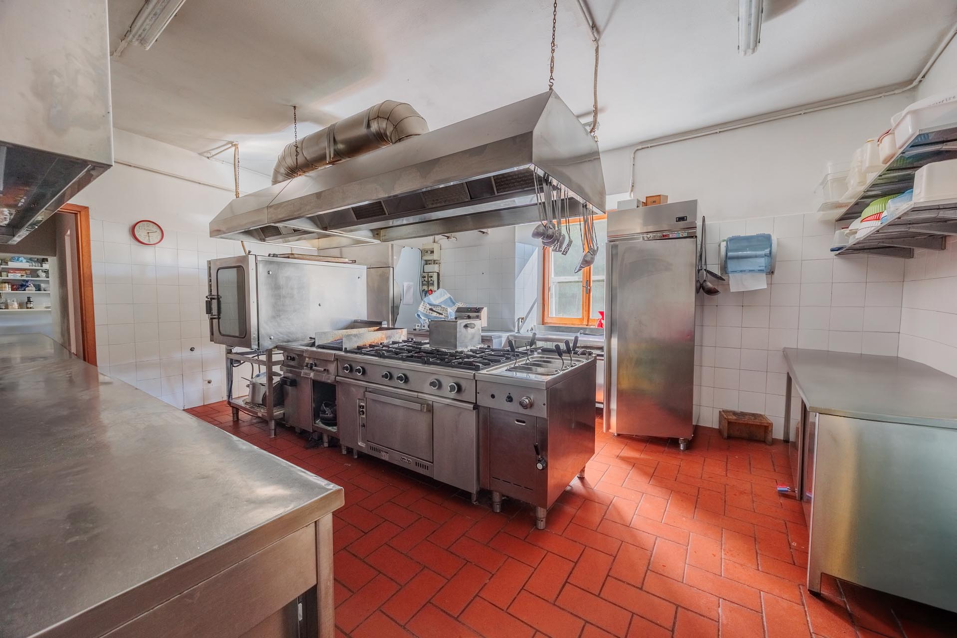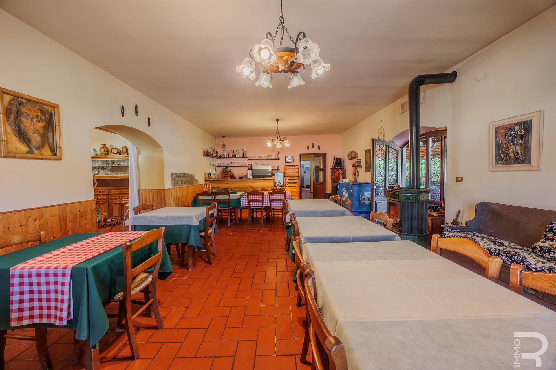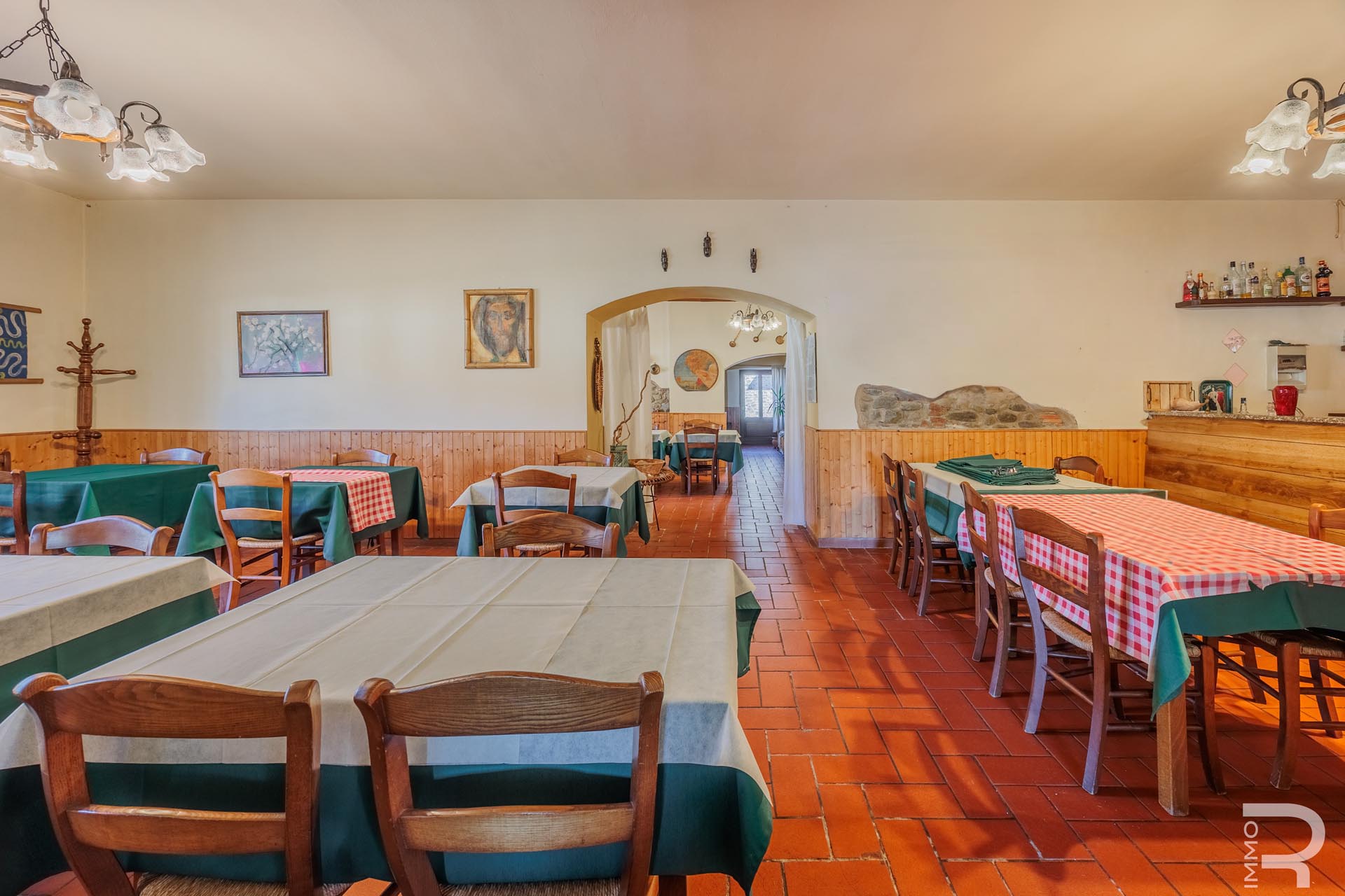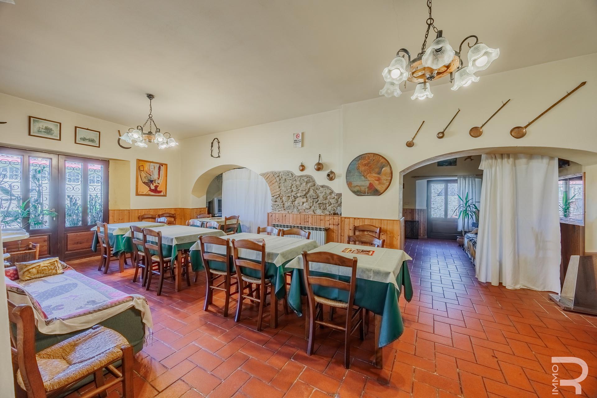 Im Zentrum des Anwesens befindet sich das Haupthaus, das durch seine Vielseitigkeit besticht: Es beherbergt komfortable Zimmer für Kurzzeitvermietungen, ein Restaurant mit professioneller Küche sowie einen großen Saal. Eine großzügige, 140 m² große Veranda mit Holzofen und Grill lädt zum geselligen Verweilen ein und bietet eine hervorragende Plattform für Veranstaltungen im Freien.