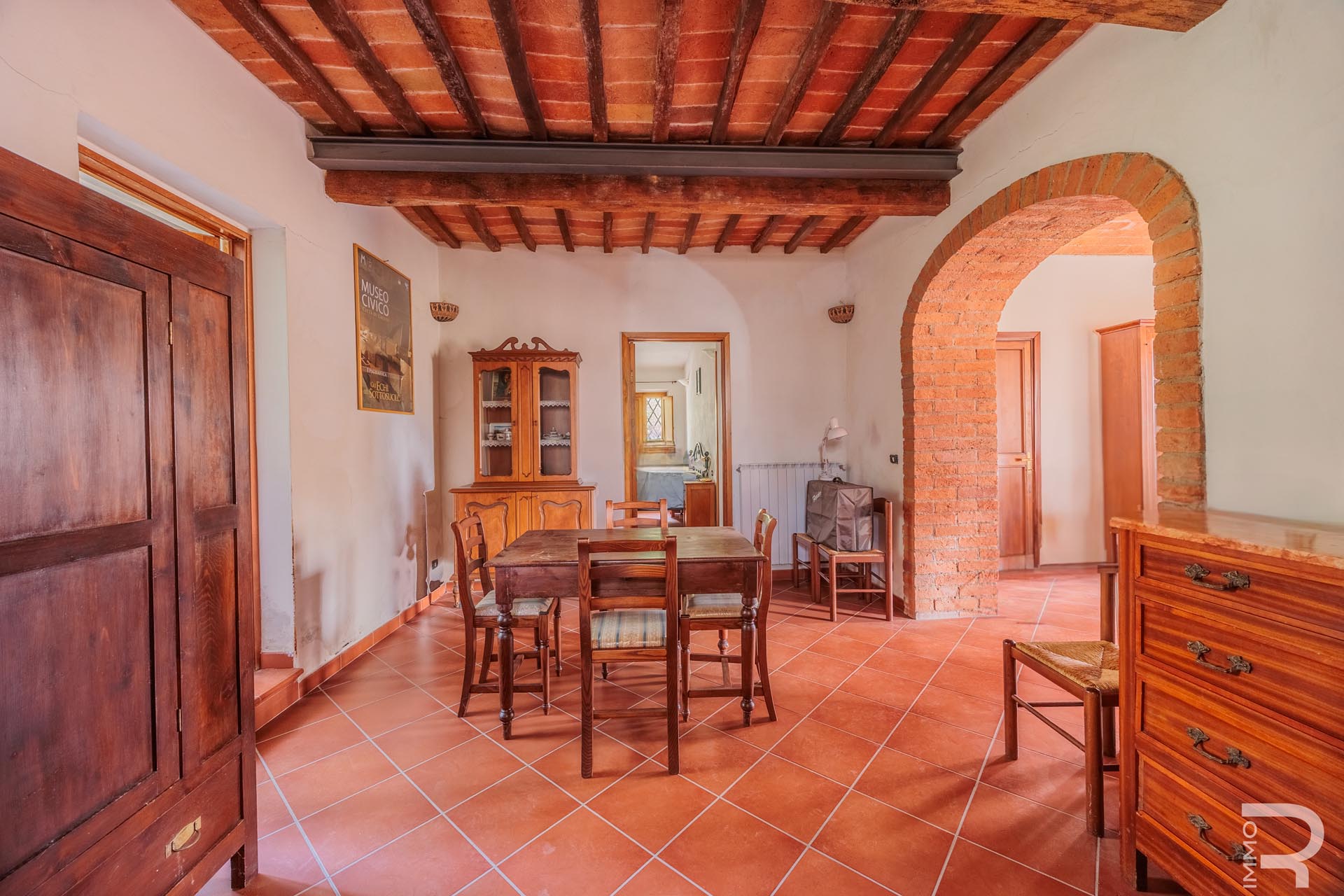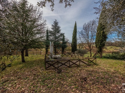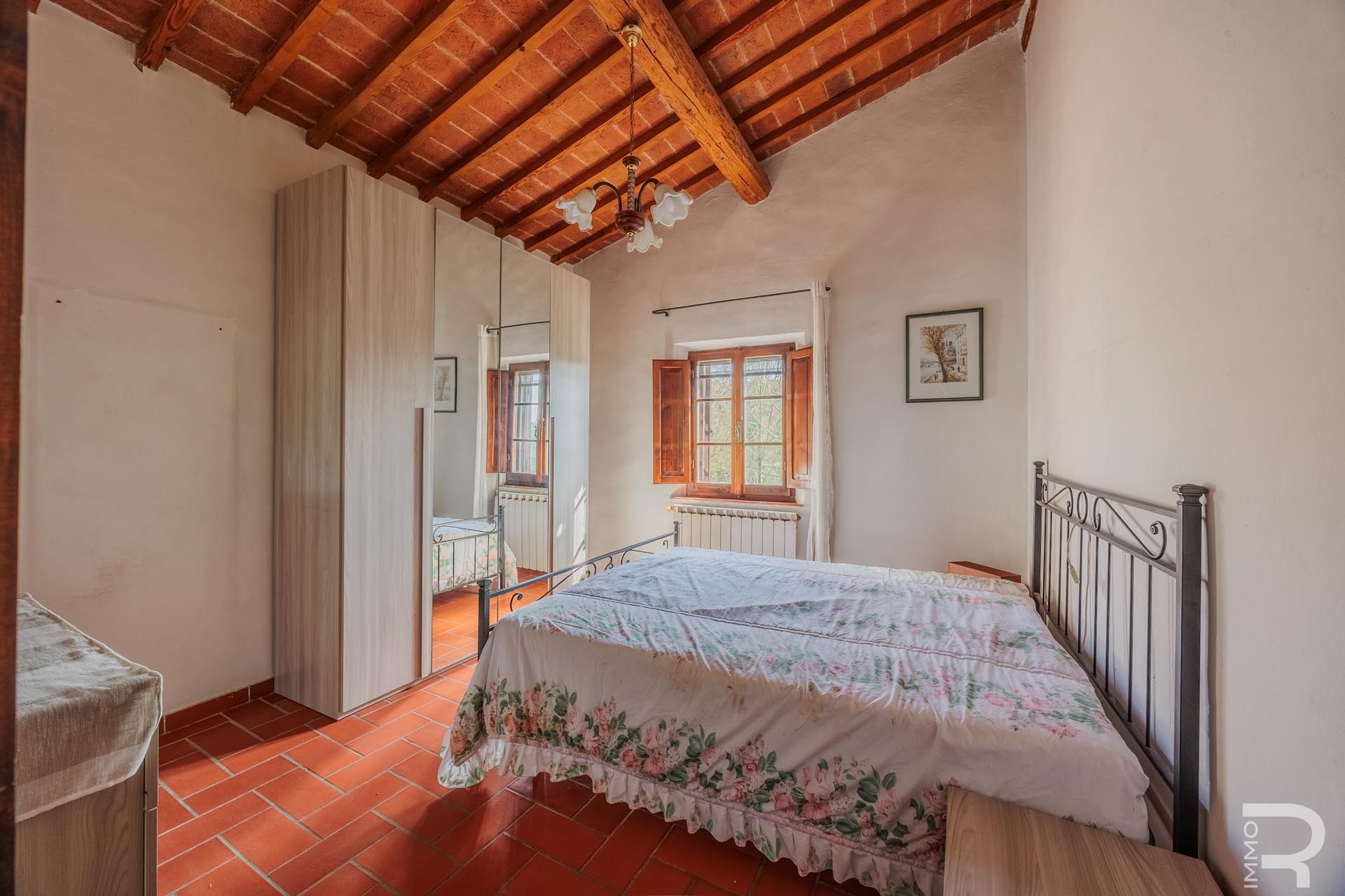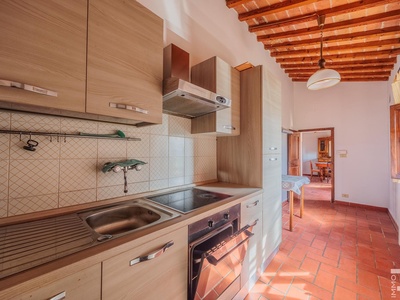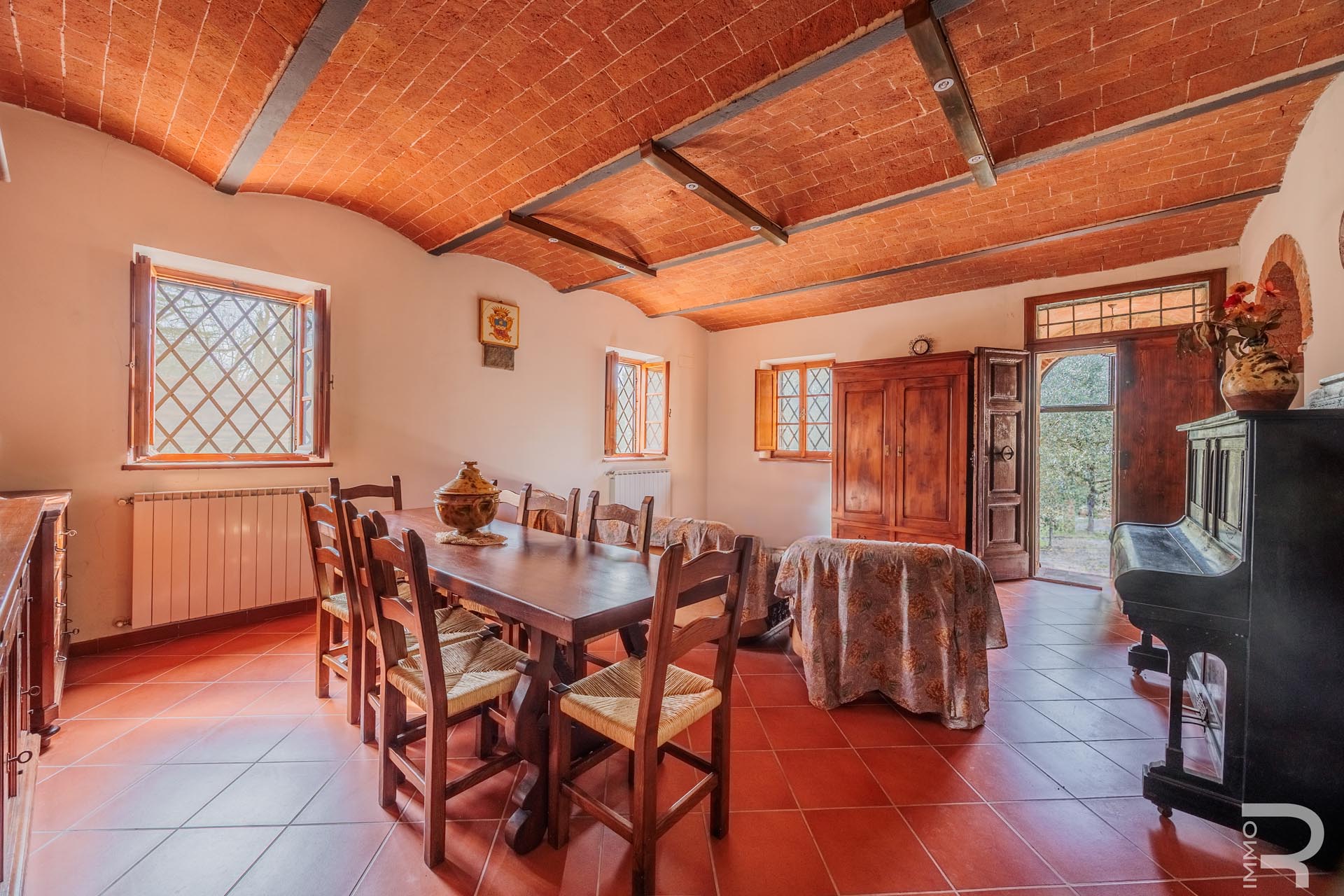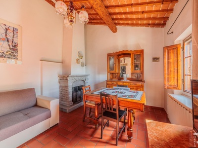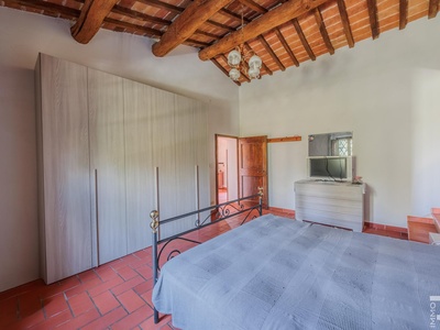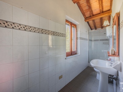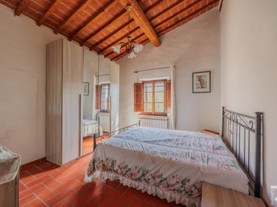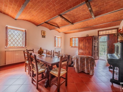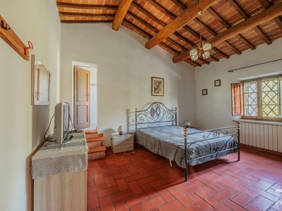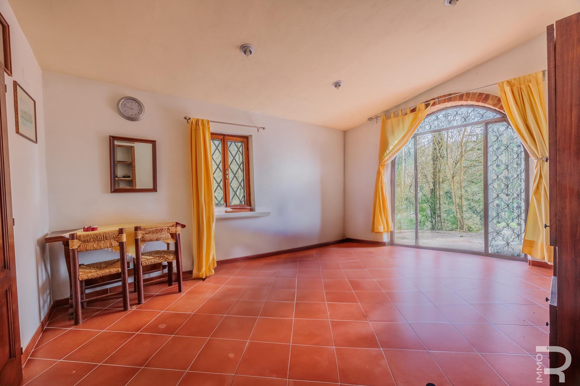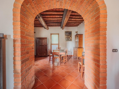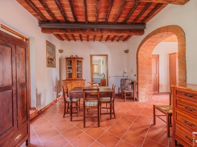 Gestalterisch präsentiert sich die Immobilie im typisch toskanischen Stil mit Terracottaböden und sichtbaren Holzbalken, die den Räumen eine warme und charaktervolle Ausstrahlung verleihen. Besonders hervorzuheben ist die großzügige Veranda beziehungsweise Terrasse, die rund um das Haus verläuft und zusätzlichen Wohnraum im Freien schafft – ideal für gemeinsame Mahlzeiten oder gesellige Stunden.