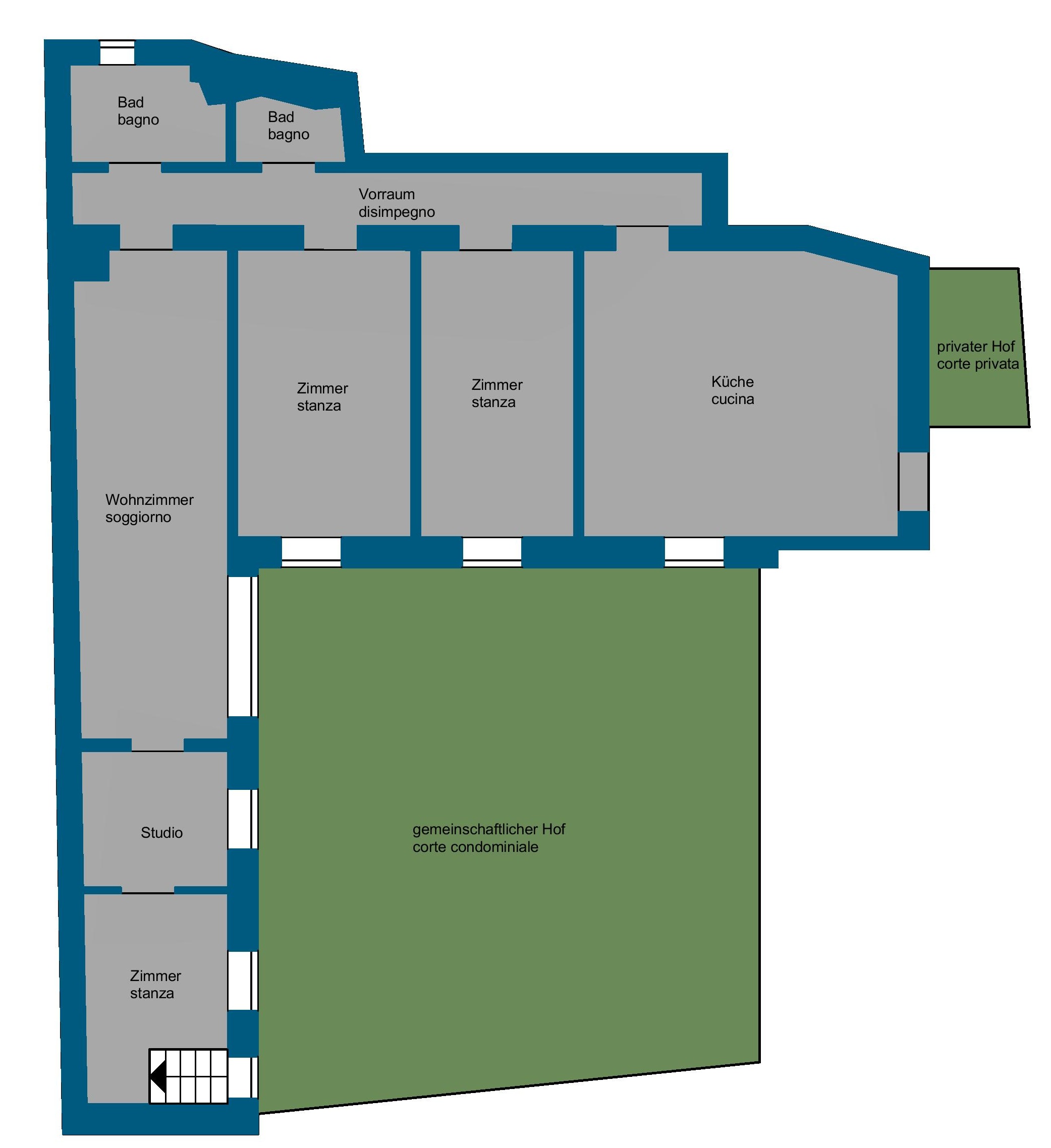 Sämtliche Fenster der Wohnung öffnen sich zum Innenhof der Anlage und sorgen für eine angenehme, geschützte Atmosphäre. Zusätzlich steht Ihnen ein kleiner, privater Innenhof zur Verfügung – ein exklusiver Außenbereich mitten in der Stadt, ideal für entspannte Stunden oder grüne Akzente.