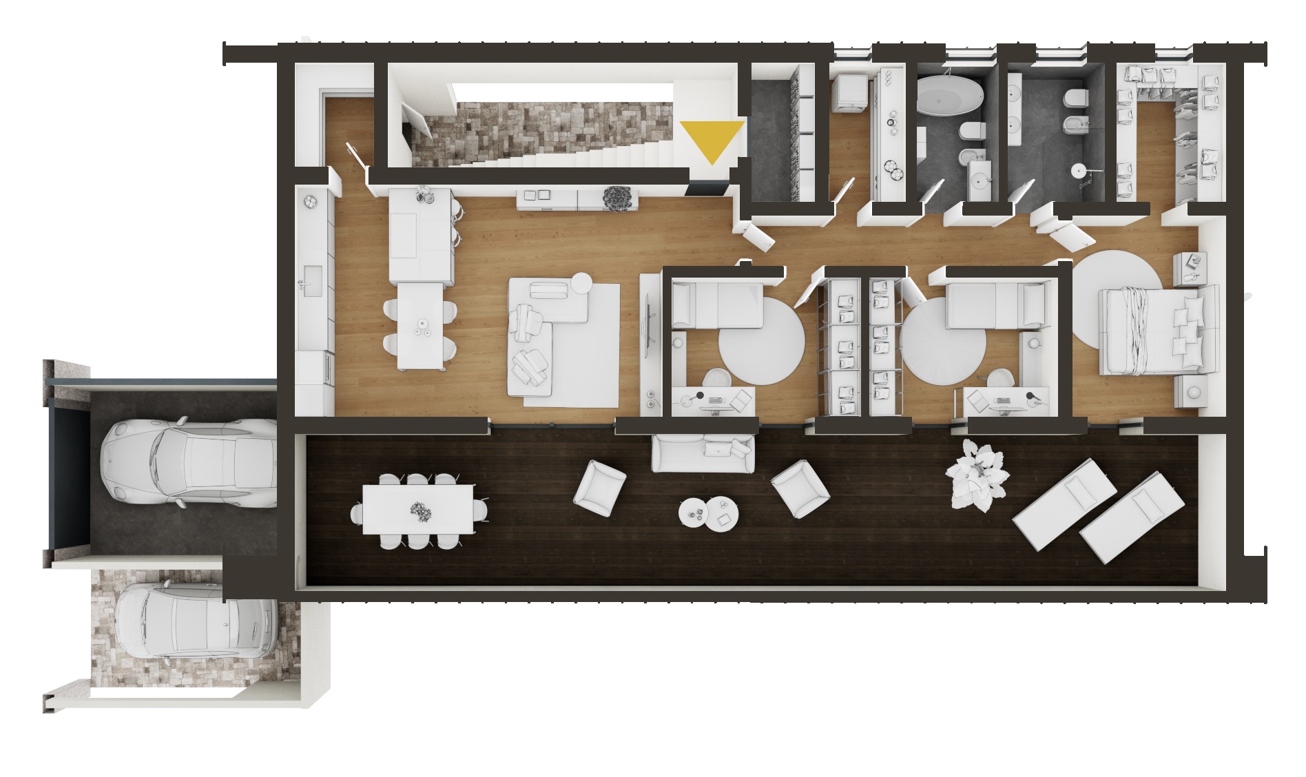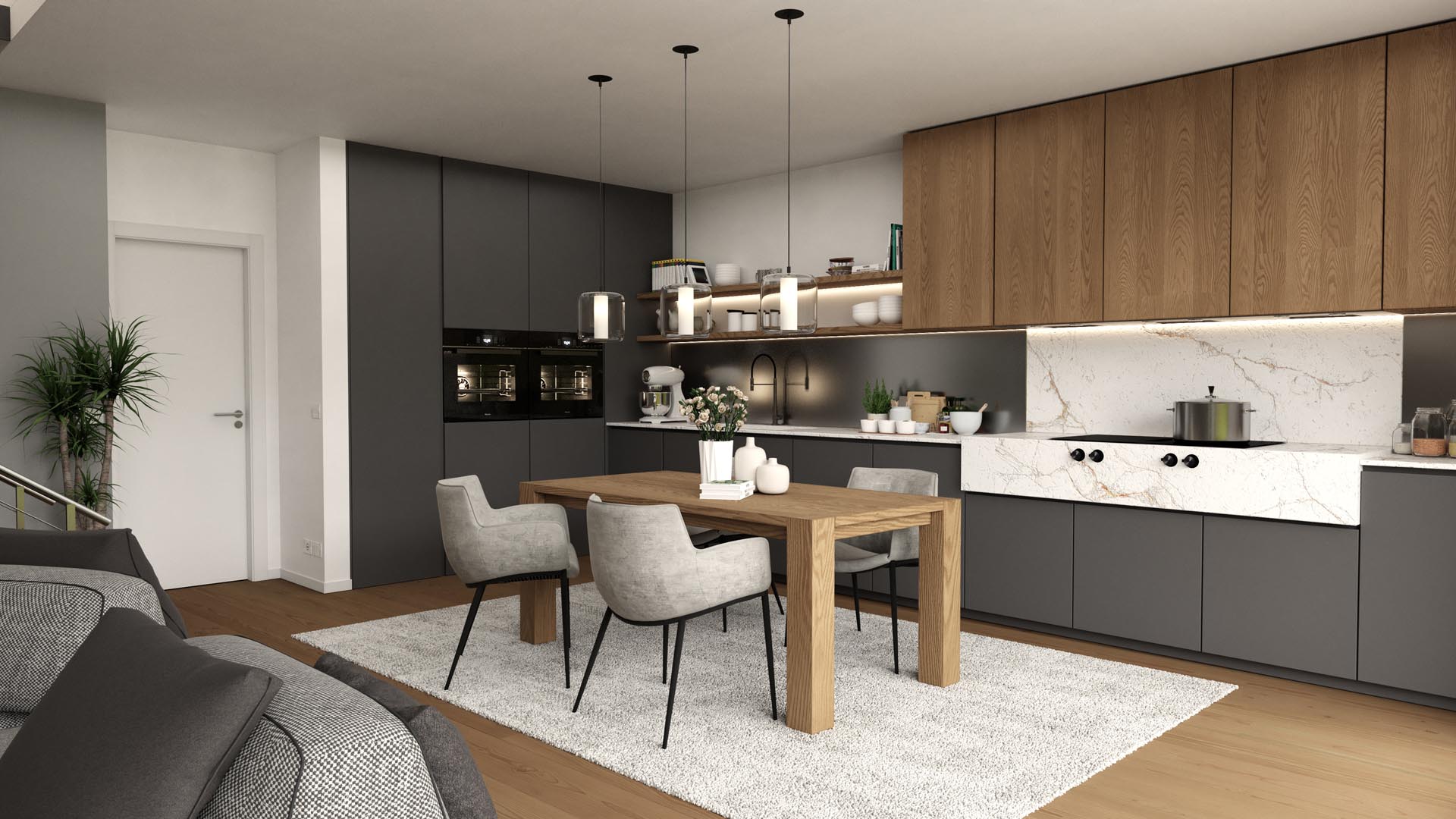 The villas are complemented by two 4-room apartments: one is on the ground floor, the other on the first floor. Both apartments have three bedrooms and two large bathrooms – ideal for couples with children or for anyone looking for a comfortable and practical living solution.