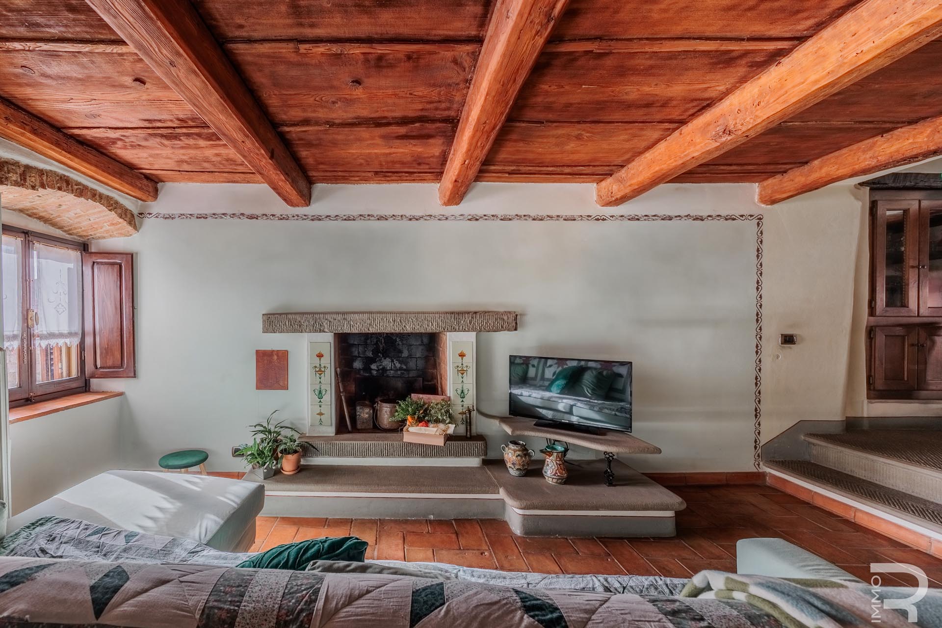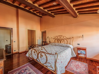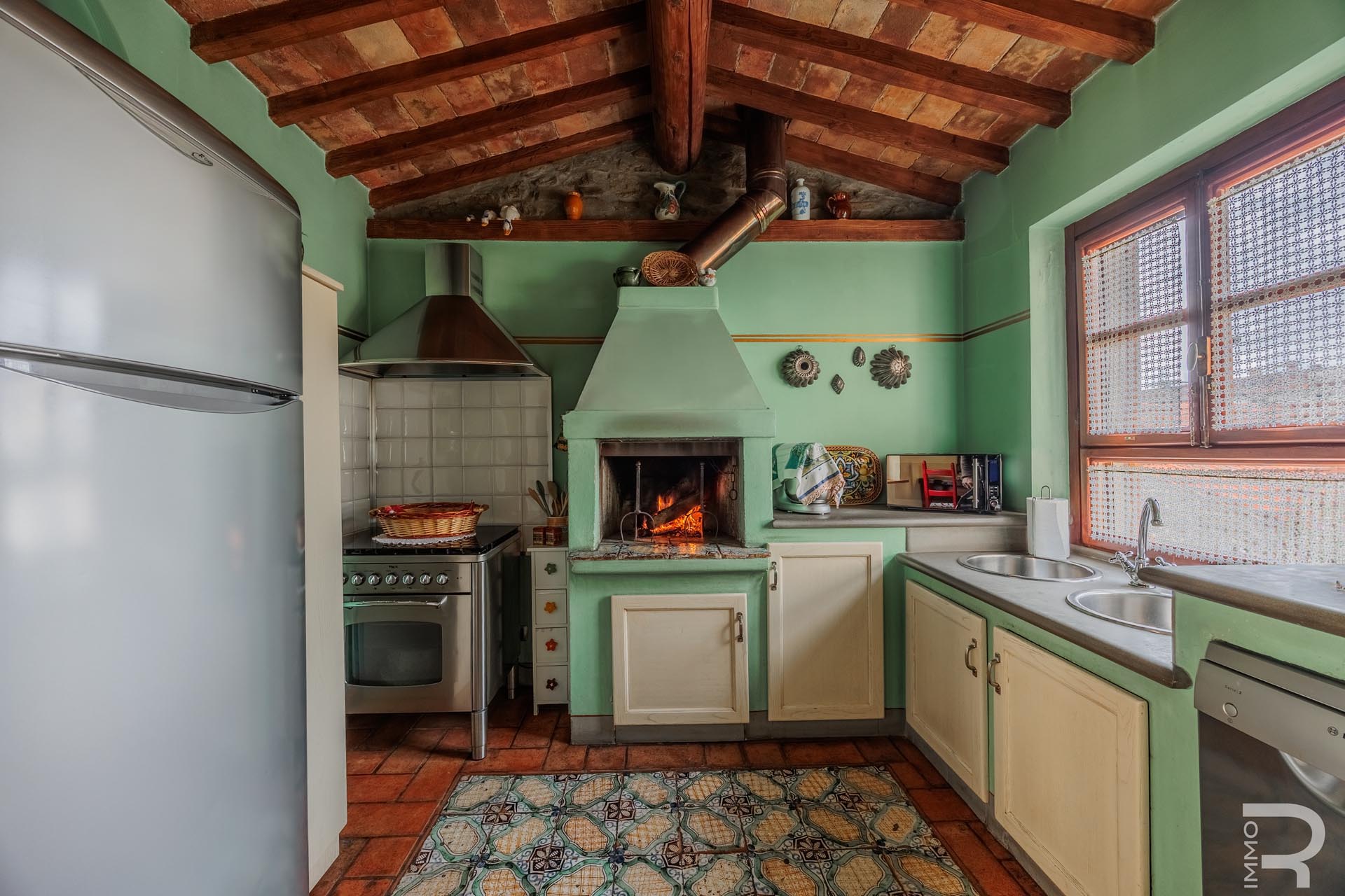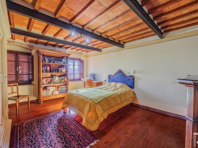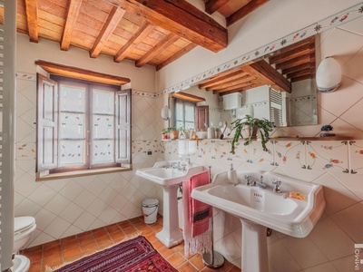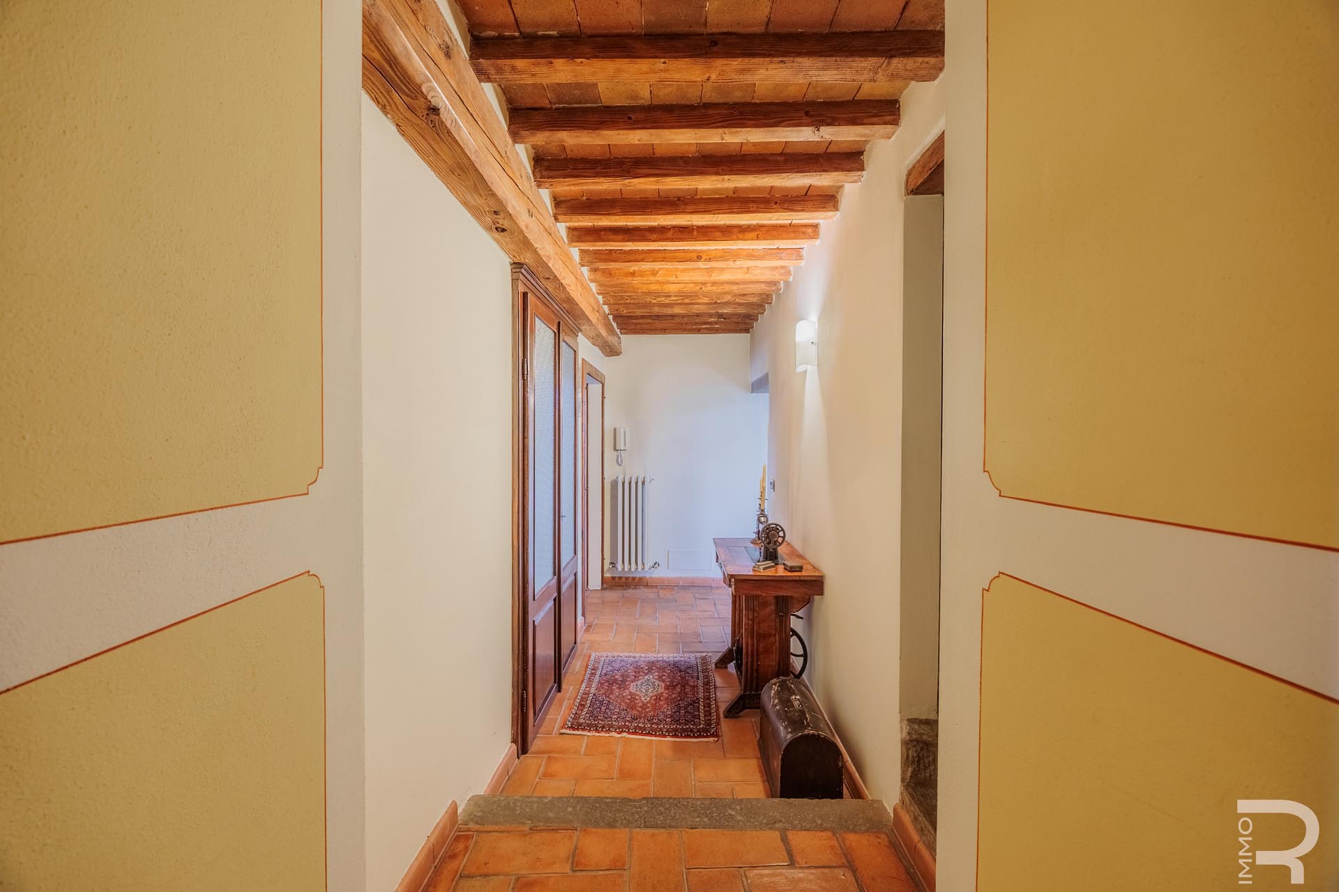 The careful restoration was carried out using fine, typical local materials: terracotta floors and chestnut parquet flooring run throughout the living areas, giving them a warm, authentic atmosphere. The ceilings are made of solid chestnut beams from Casentino, which give the house its distinctive character. A total of four fireplaces and a traditional wood-burning stove not only create a cozy atmosphere, but also emphasize the historical identity of the building.