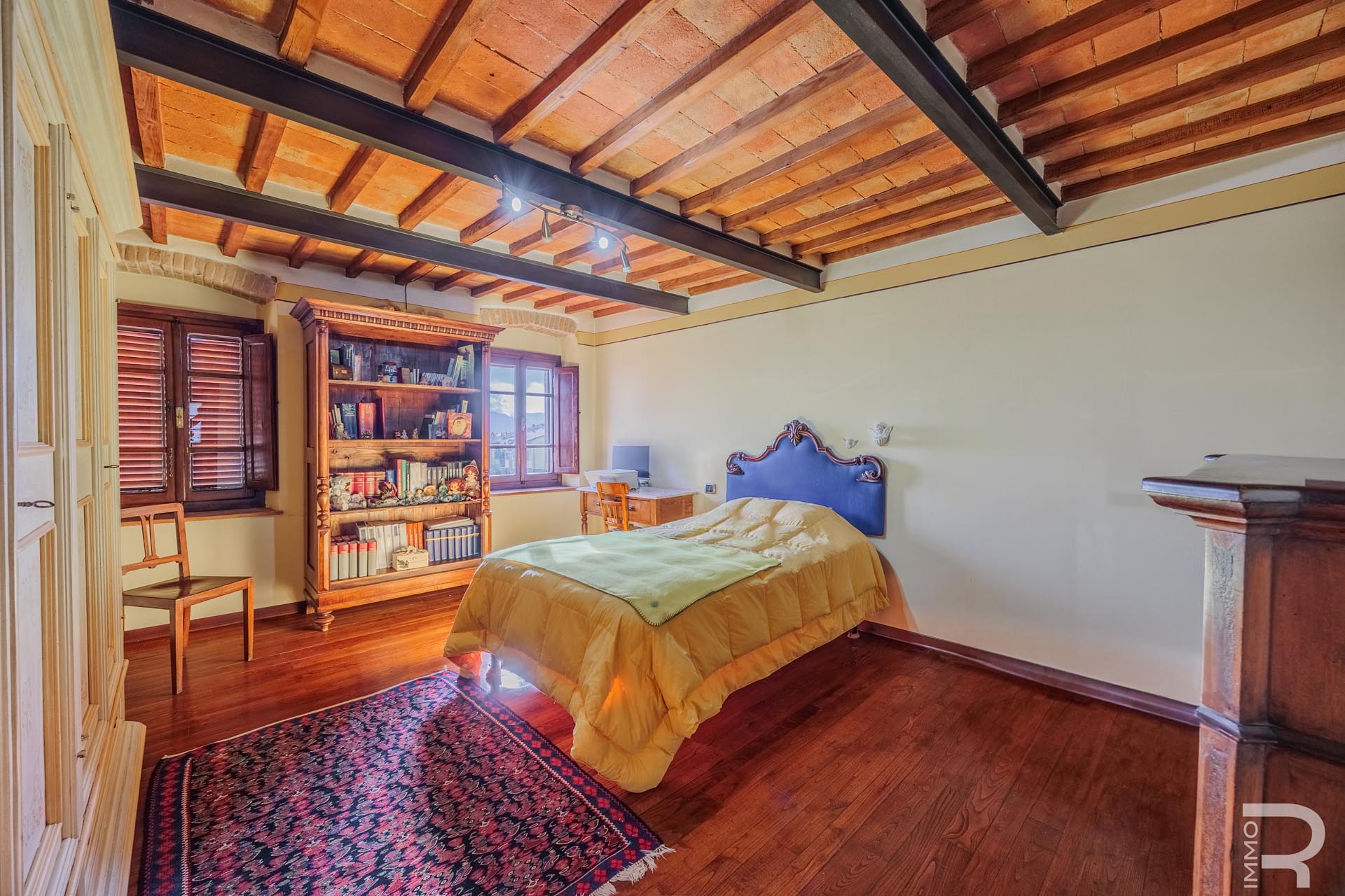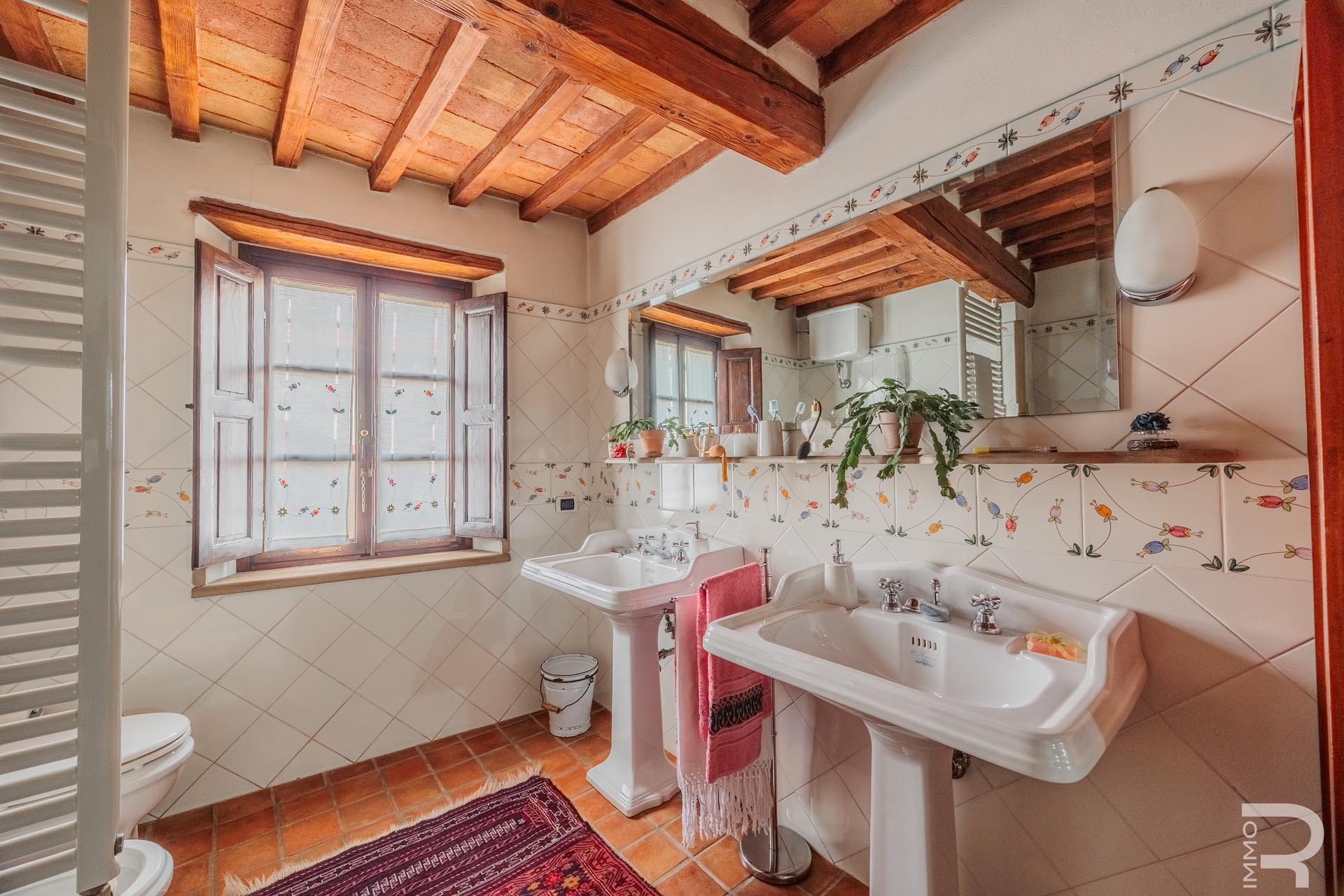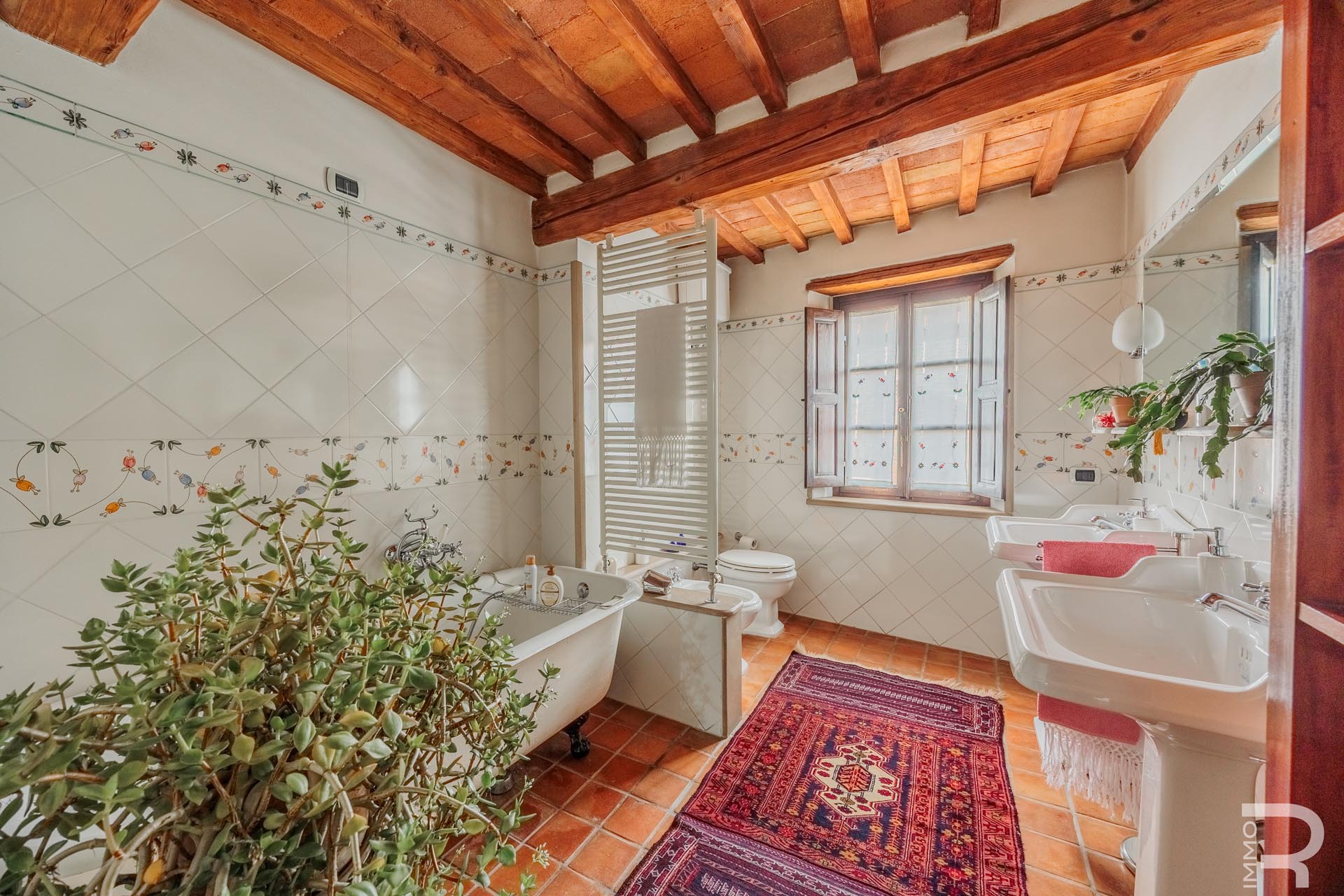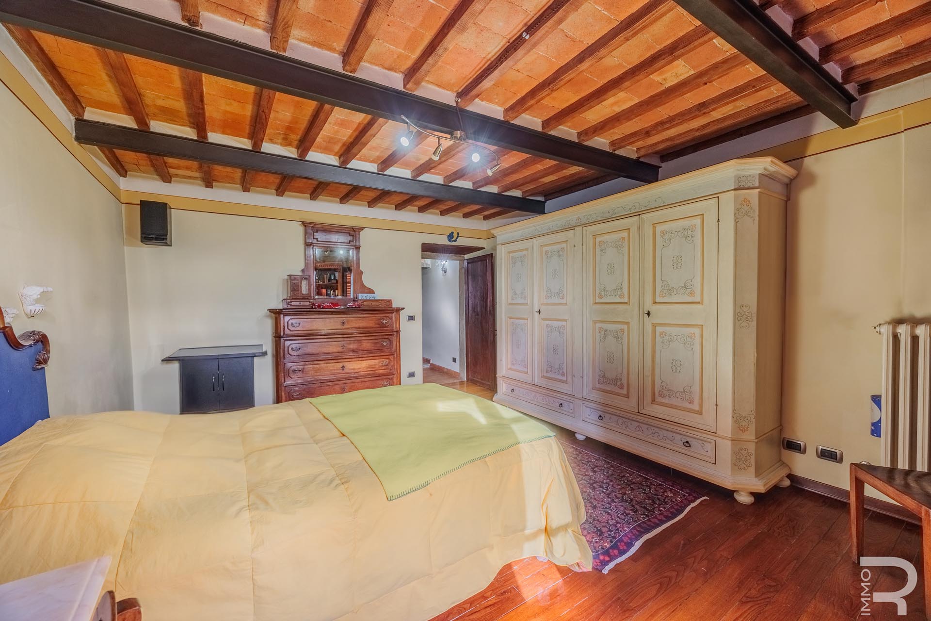 The careful restoration was carried out using fine, typical local materials: terracotta floors and chestnut parquet flooring run throughout the living areas, giving them a warm, authentic atmosphere. The ceilings are made of solid chestnut beams from Casentino, which give the house its distinctive character. A total of four fireplaces and a traditional wood-burning stove not only create a cozy atmosphere, but also emphasize the historical identity of the building.