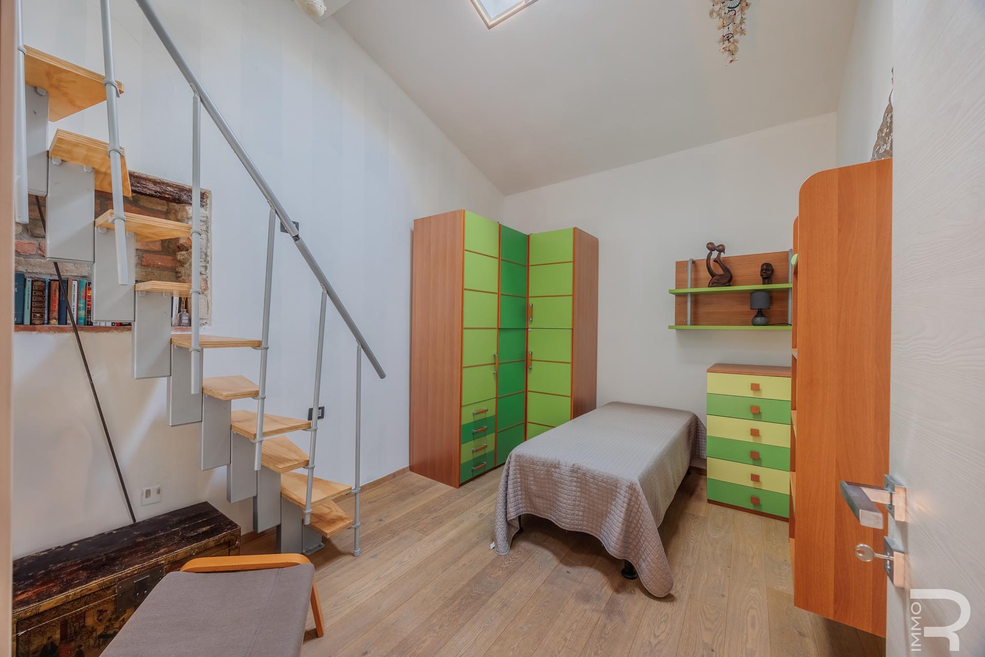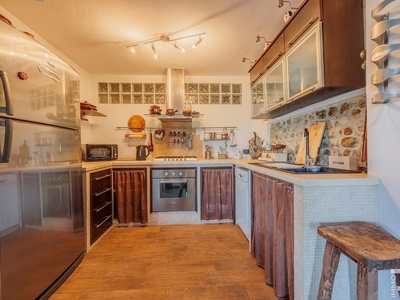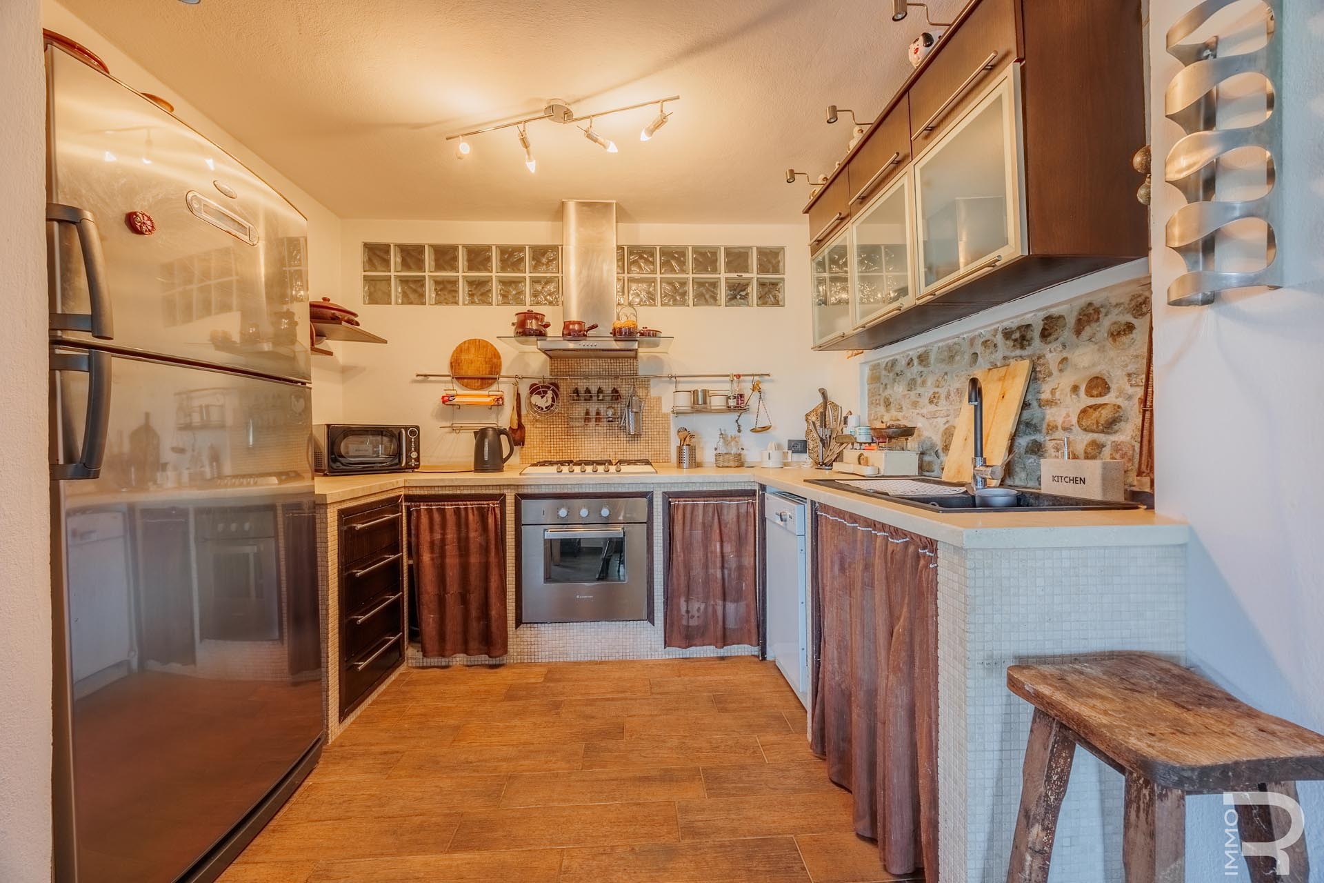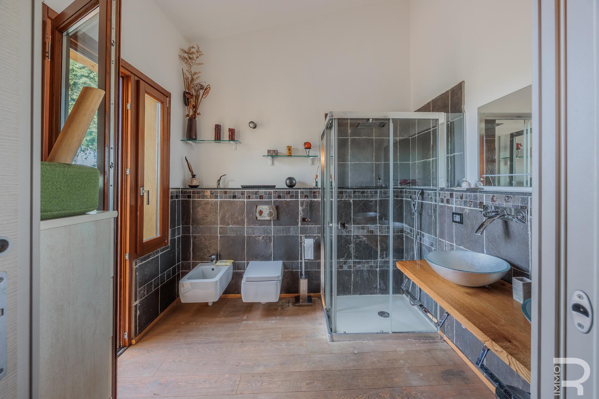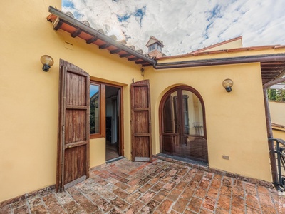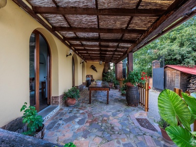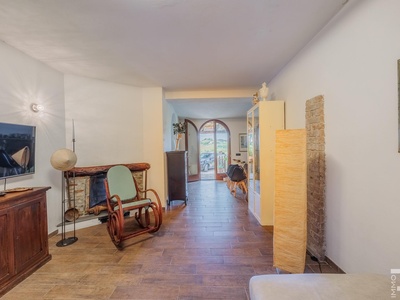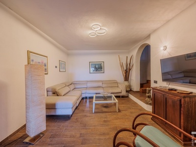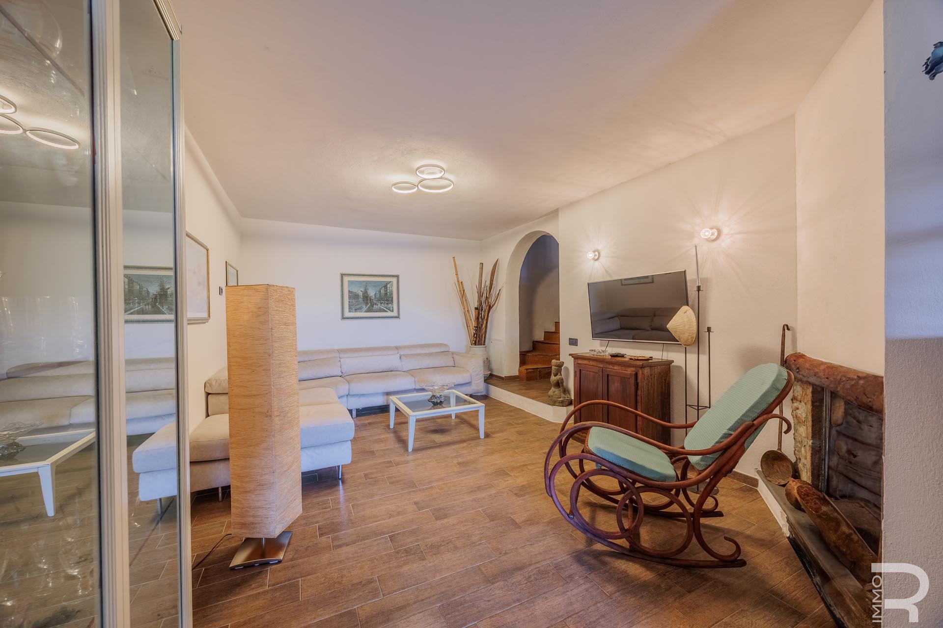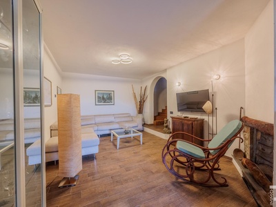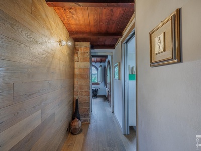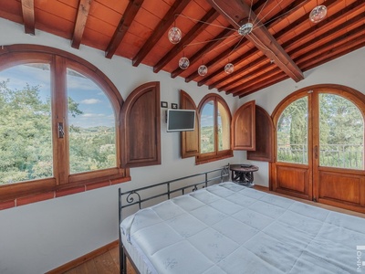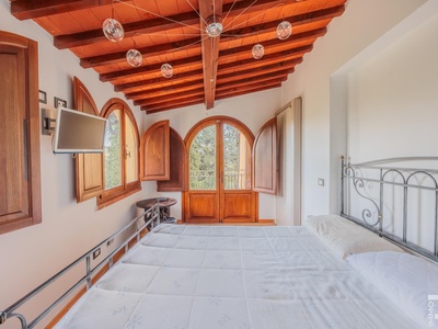 The ground floor features a cozy living area with bathroom, which is flooded with light thanks to large windows and offers direct access to the garden – ideal for a relaxed life in harmony with nature. The sleeping area extends over the first floor and the attic and has three bedrooms and another bathroom. The large terracotta-tiled terrace on the first floor is particularly charming, offering panoramic views of the garden and the surrounding hills.