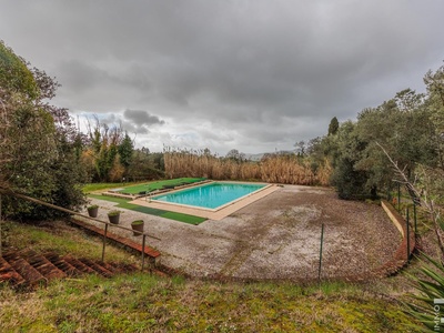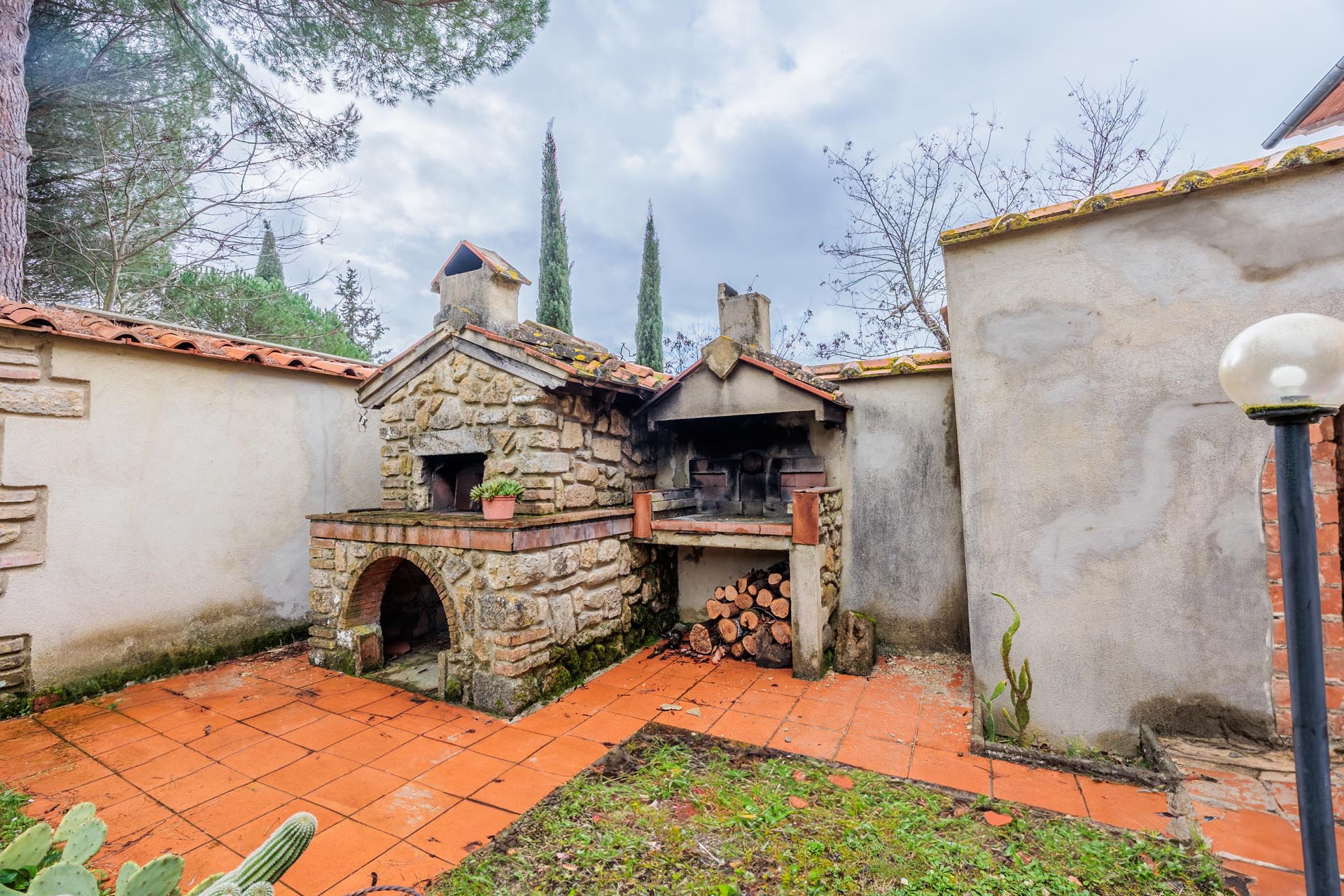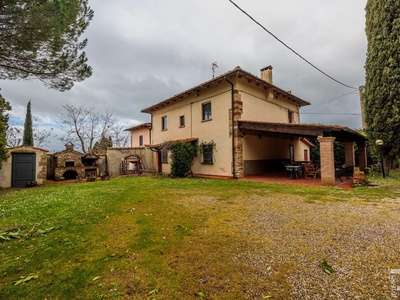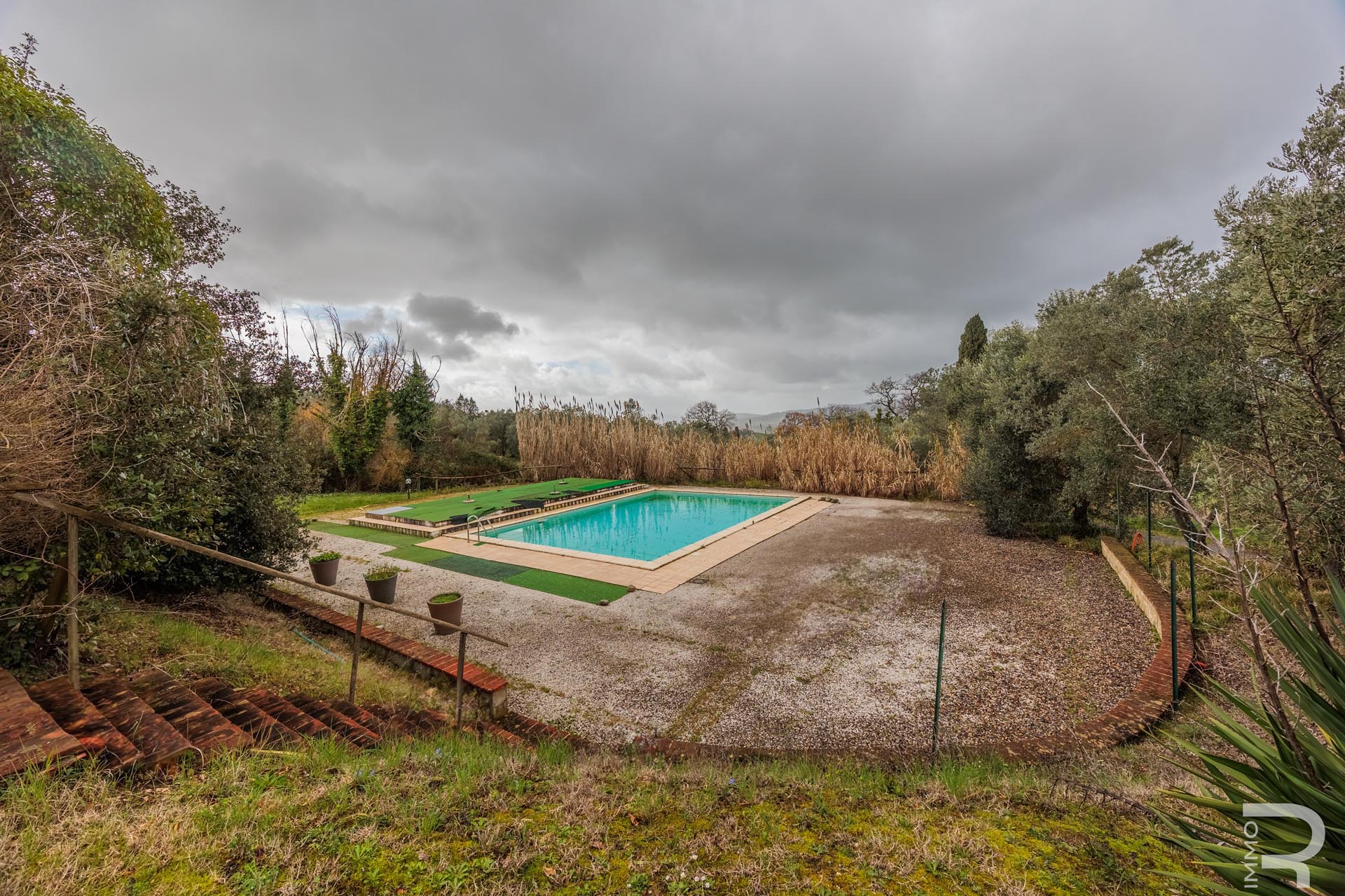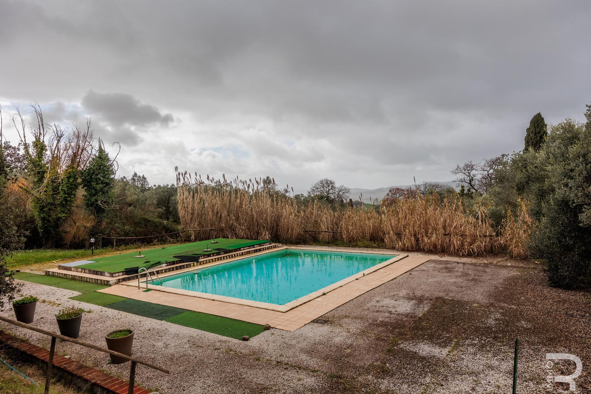 The outdoor area is another highlight: two swimming pools invite you to relax, while the well-kept garden with a wood-burning stove offers additional opportunities for socializing outdoors. The property covers a total of 7 hectares of land, including olive groves, farmland, and natural grounds that underscore the typical flair of the Tuscan hills.