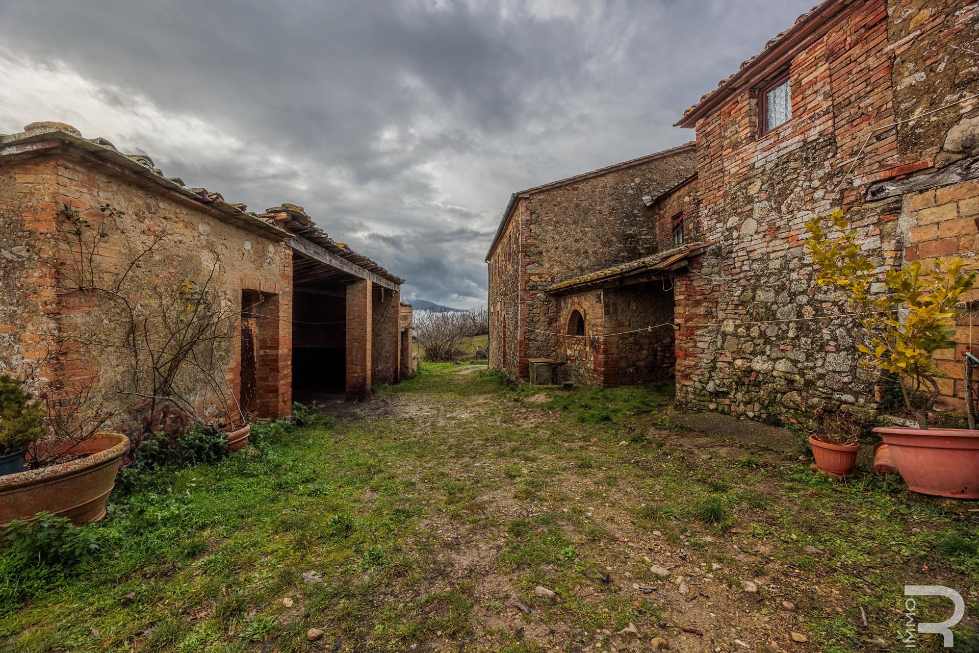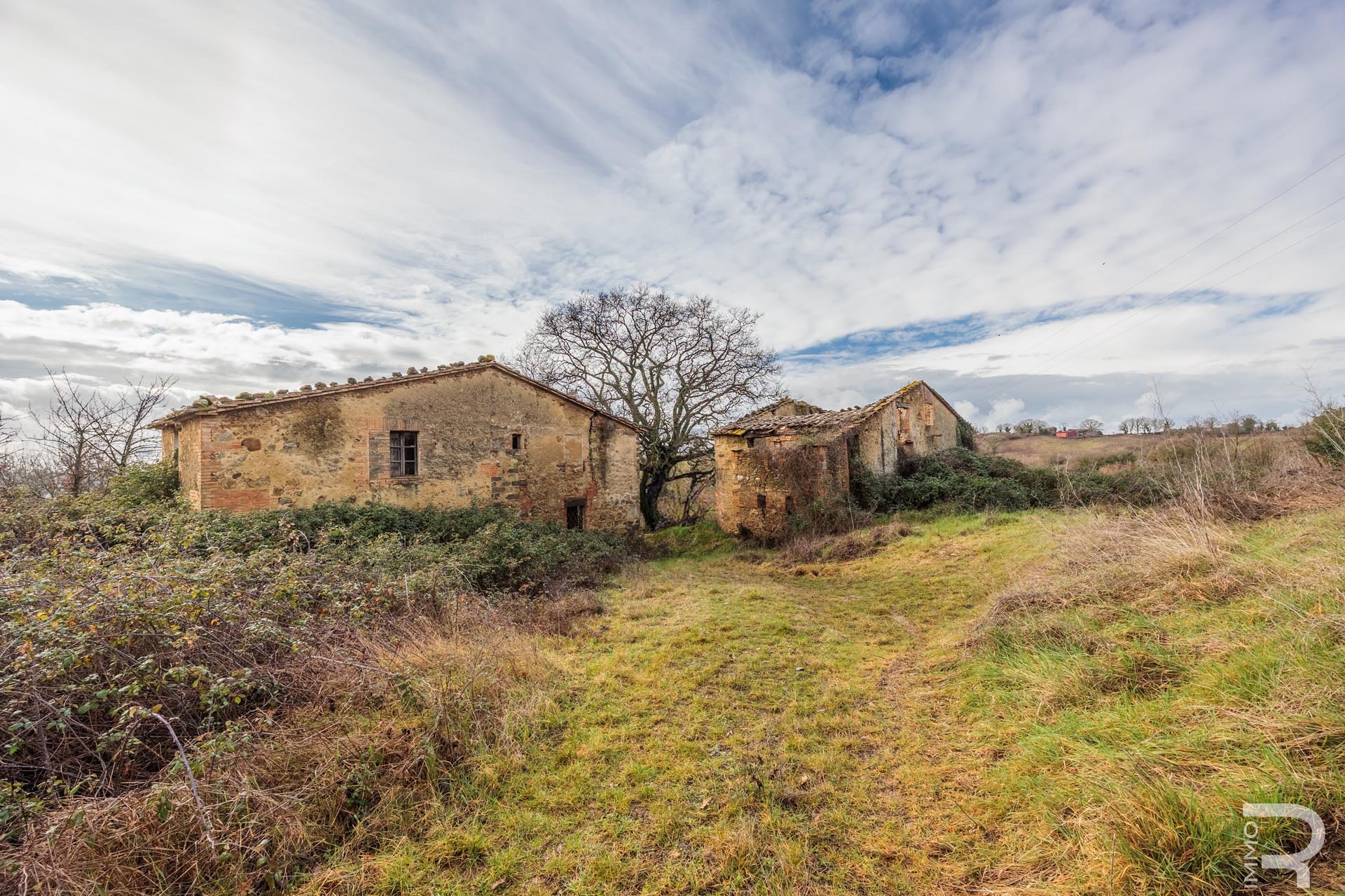 All buildings are in need of renovation. One of the farmhouses has stable exterior walls and a well-preserved roof, but still requires complete renovation of the interior. The second farmhouse is badly damaged and needs to be demolished, opening up new structural design possibilities. The existing outbuildings offer additional development potential.