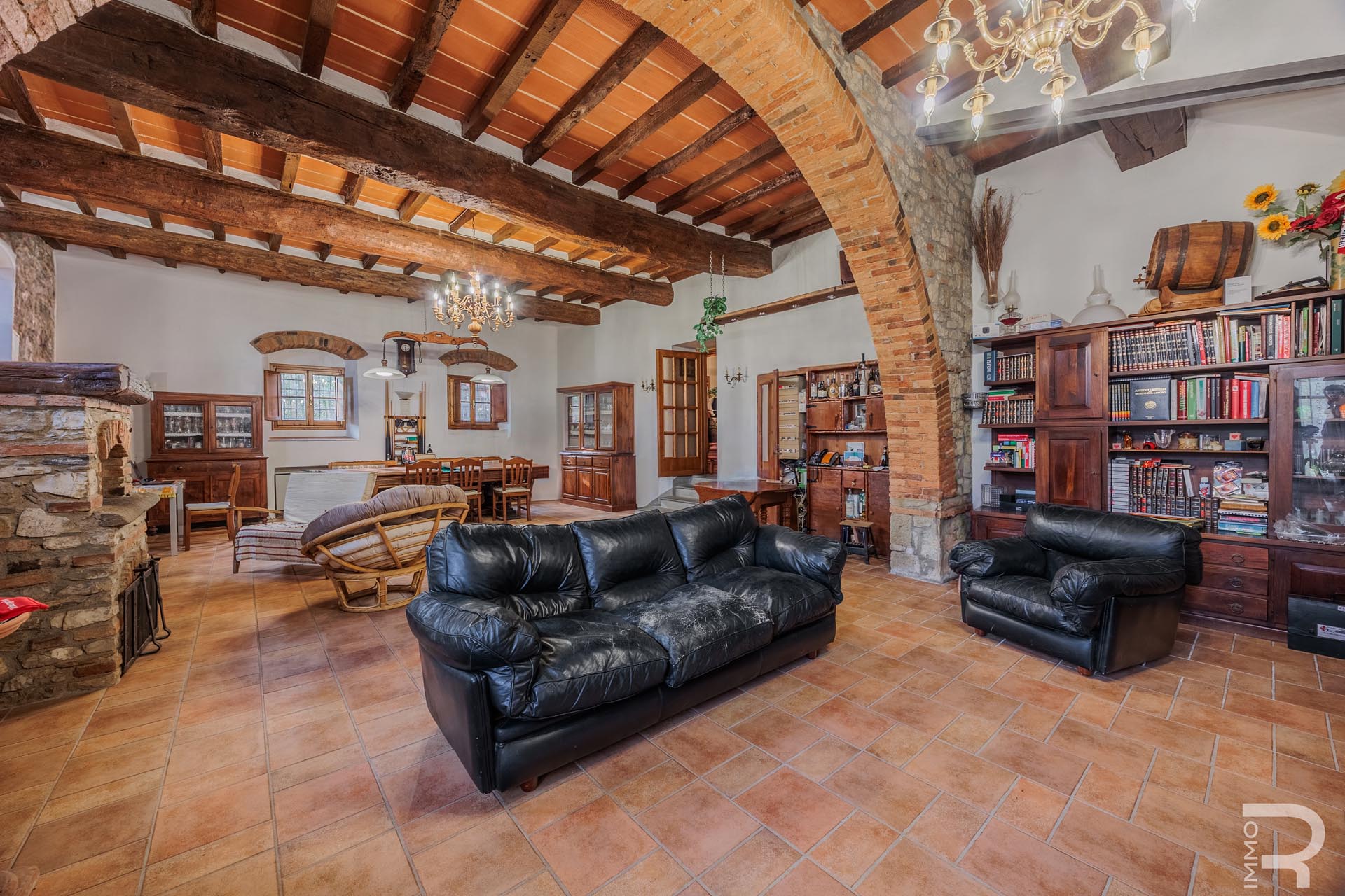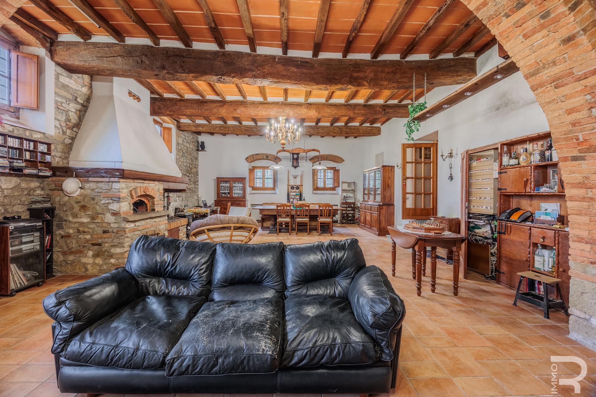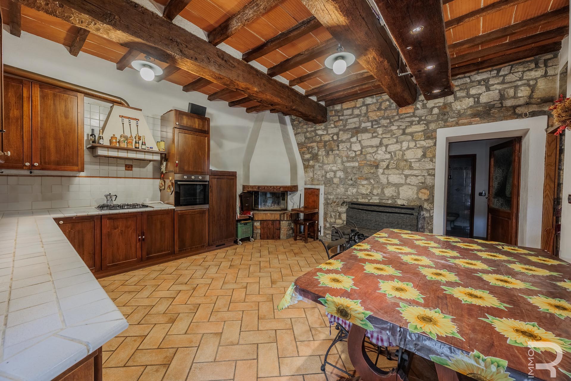The farmhouse, built of solid stone, retains its original character and impresses with its solid construction and spacious, bright rooms. A large salon with a fireplace forms the heart of the house and creates a warm, inviting atmosphere. The spacious rooms offer plenty of space and underline the authentic charm of this historic property.