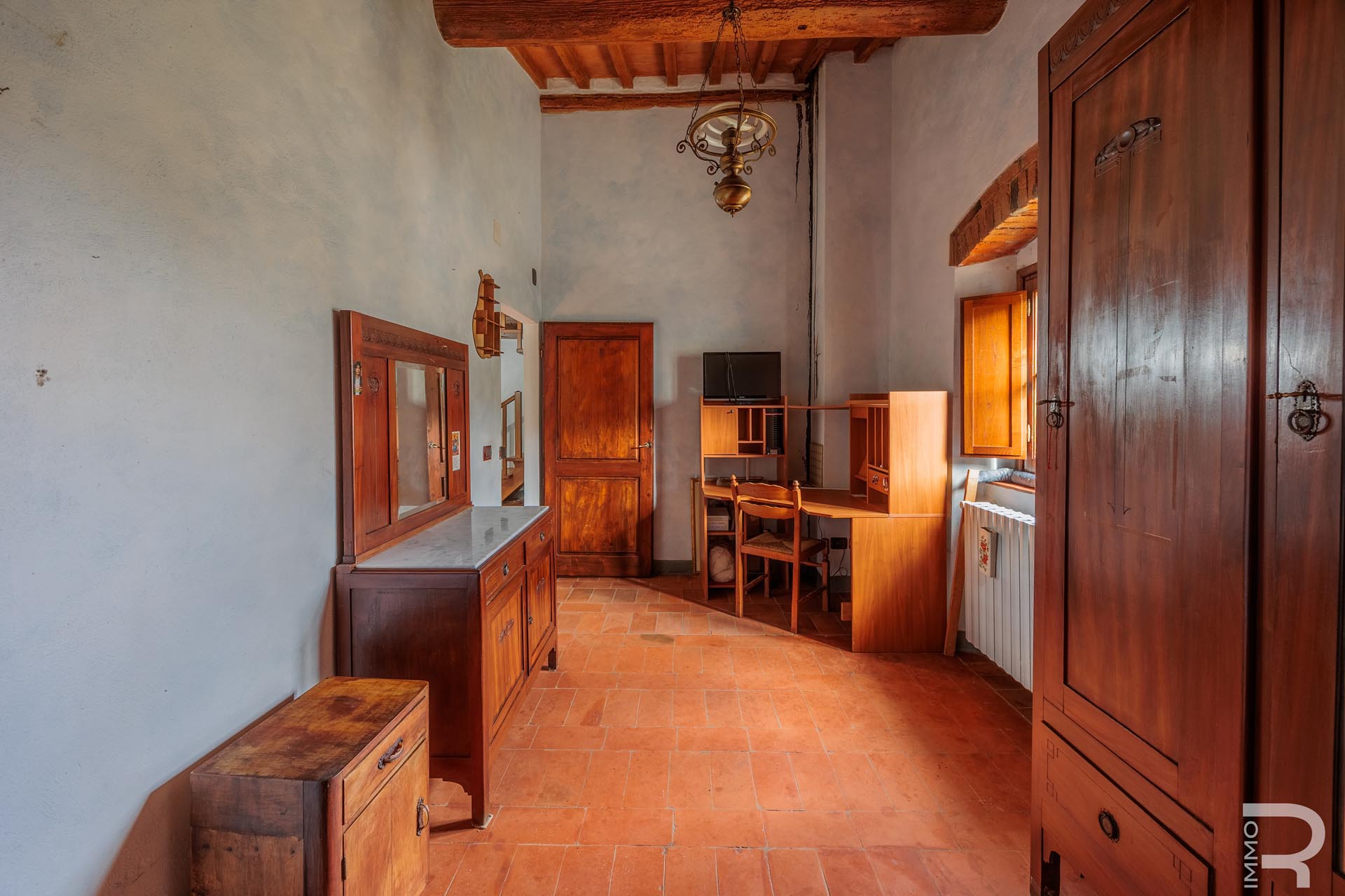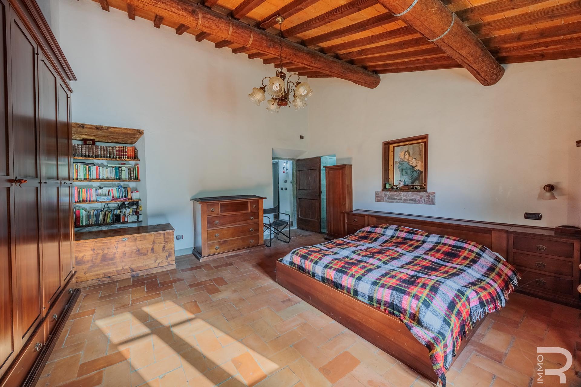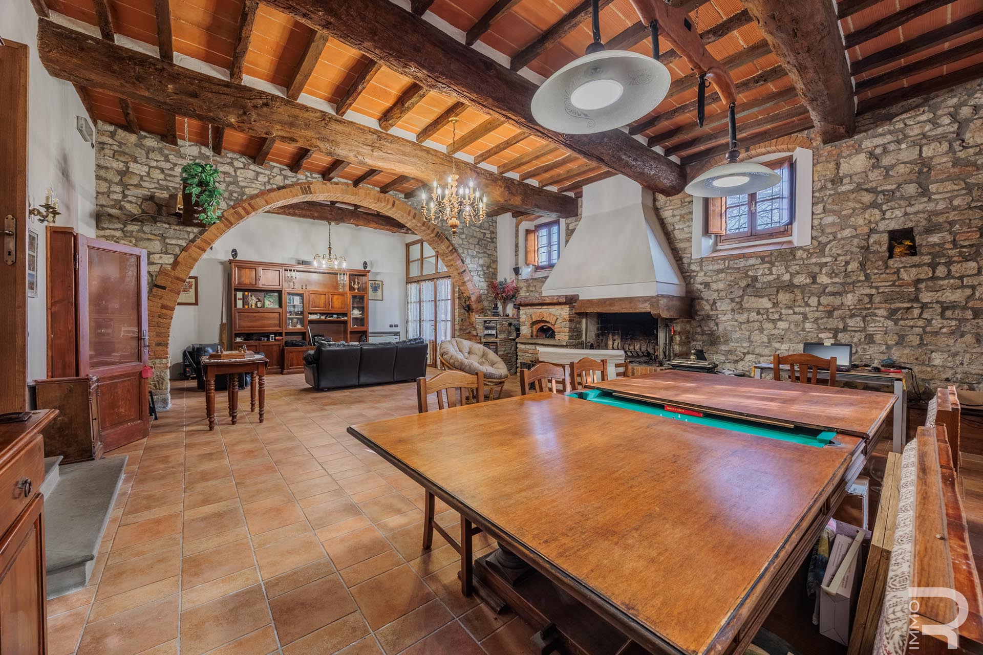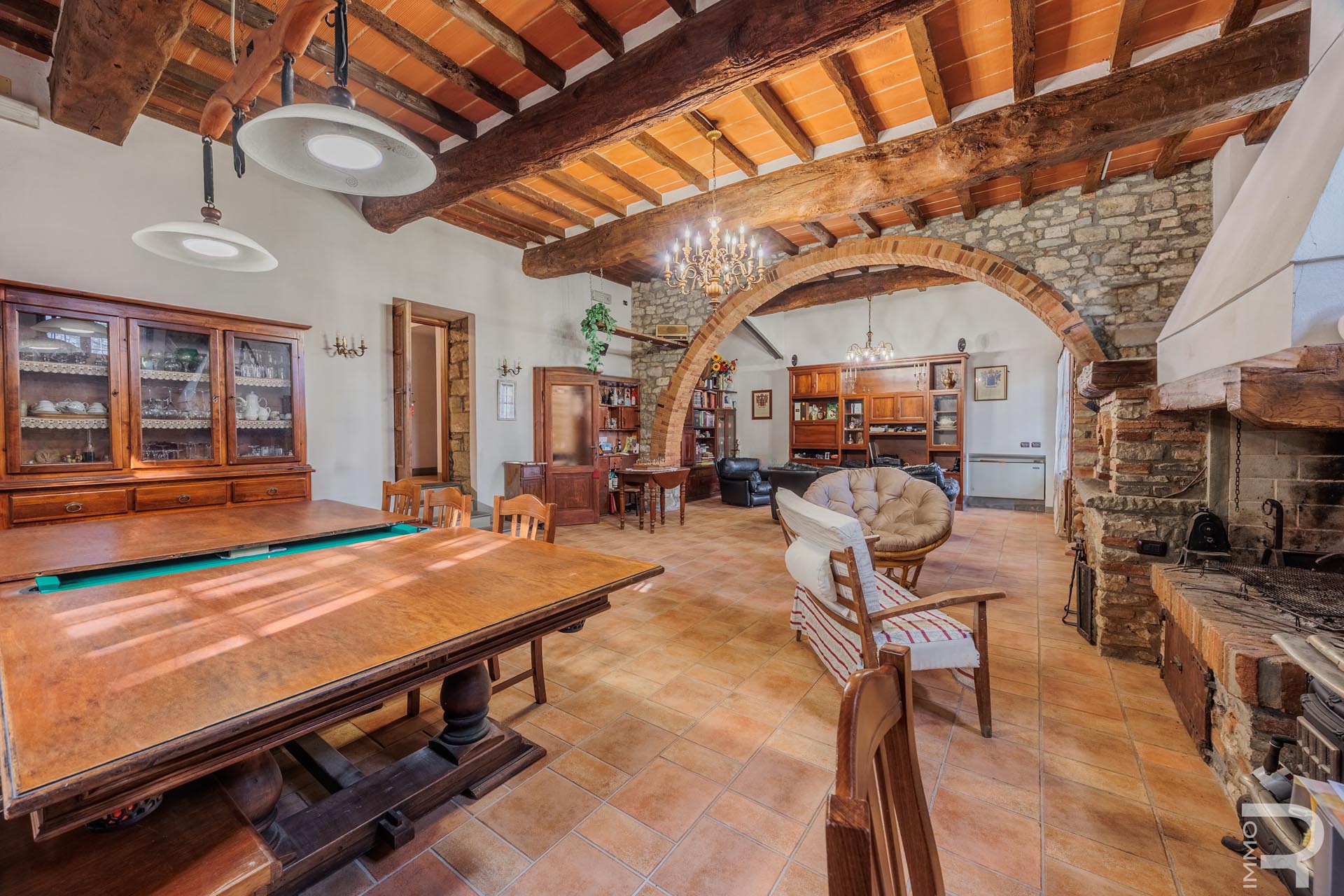 The farmhouse, built of solid stone, retains its original character and impresses with its solid construction and spacious, bright rooms. A large salon with a fireplace forms the heart of the house and creates a warm, inviting atmosphere. The spacious rooms offer plenty of space and underline the authentic charm of this historic property.