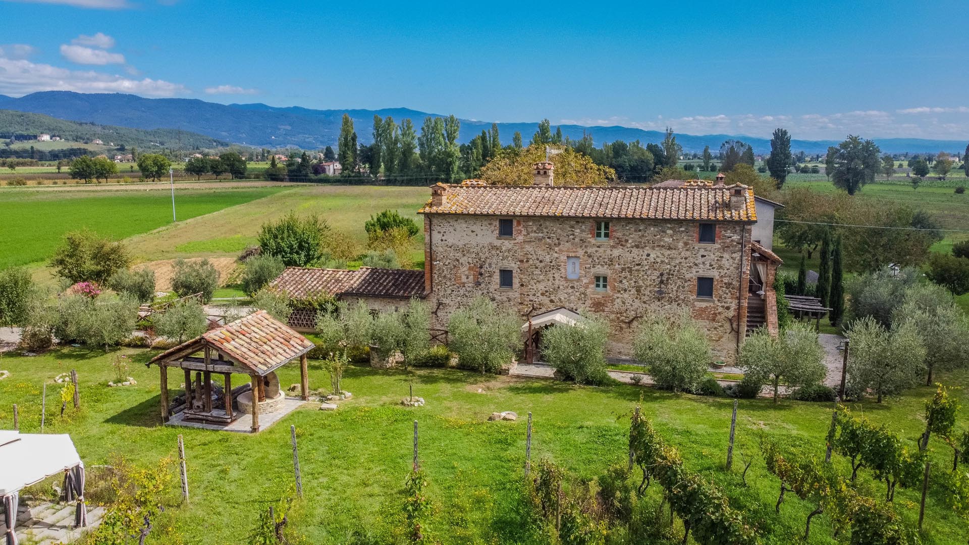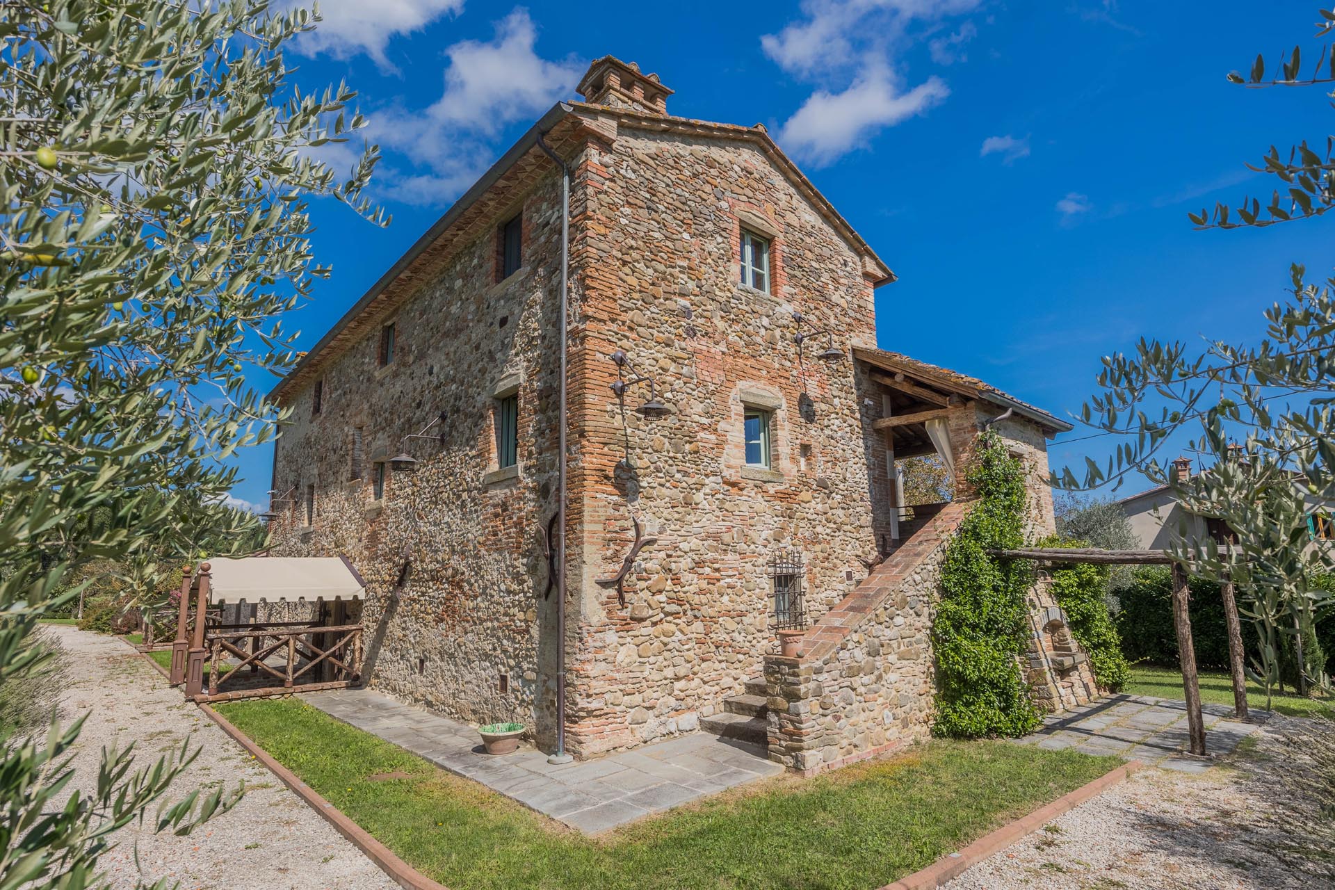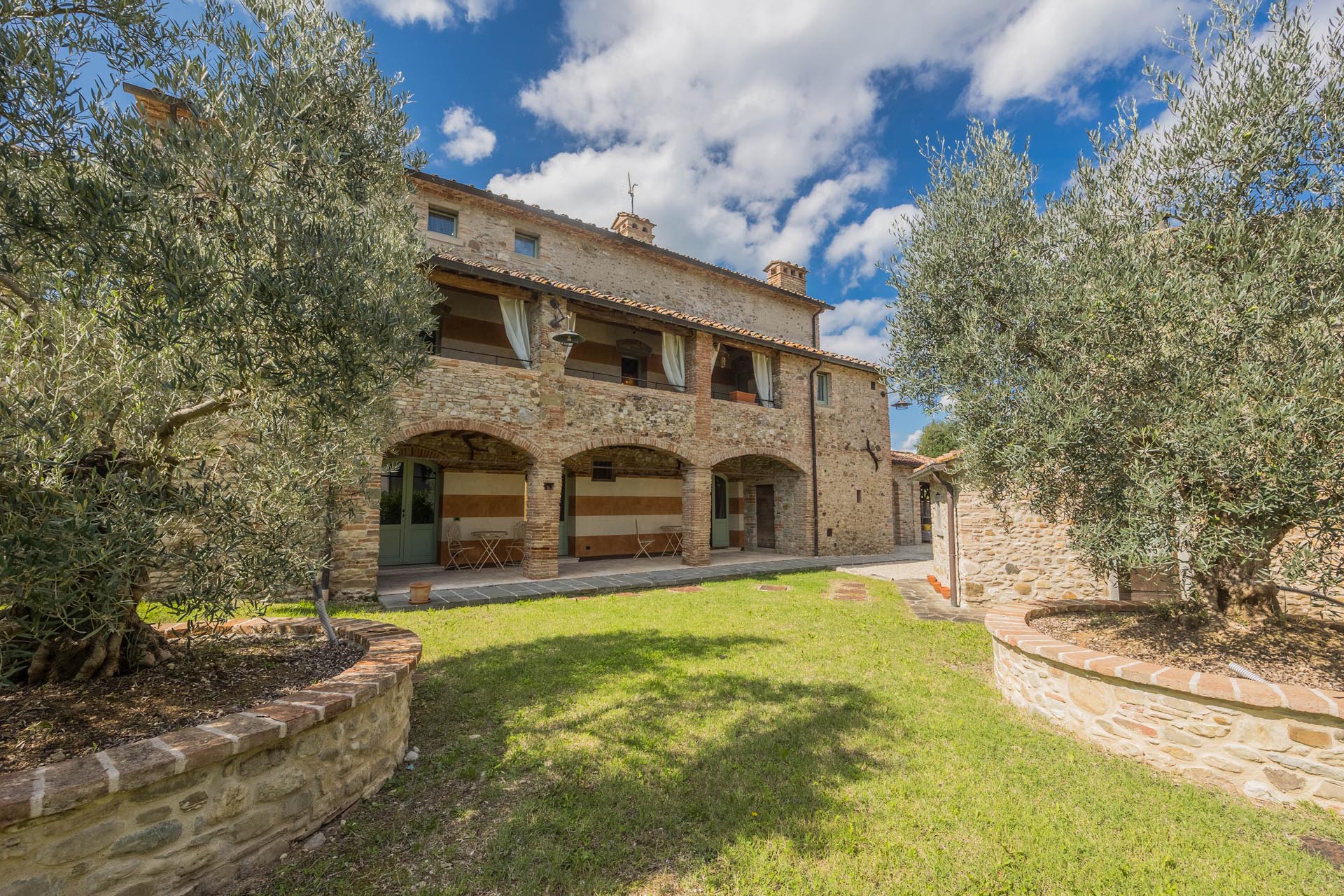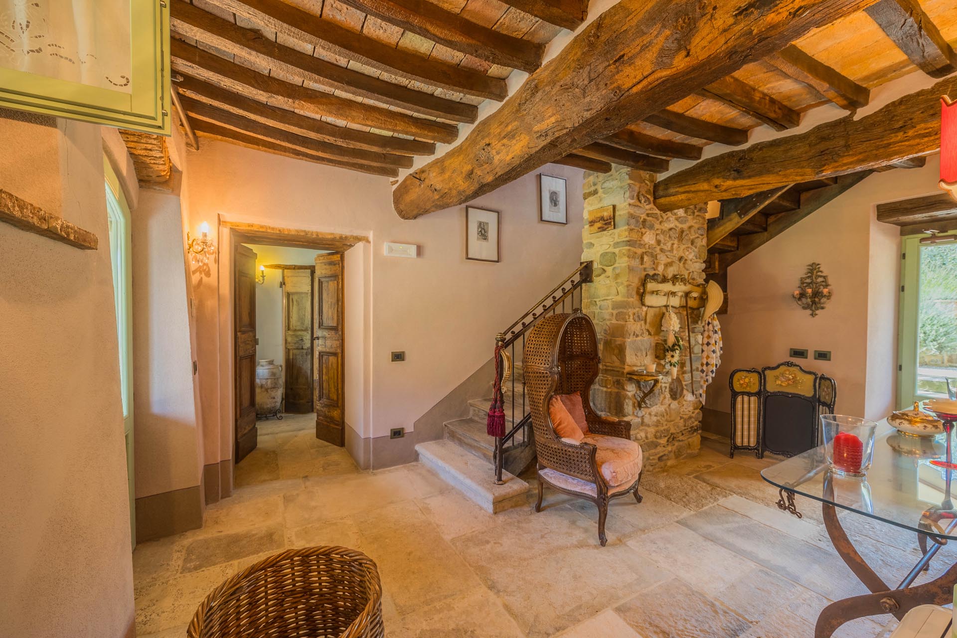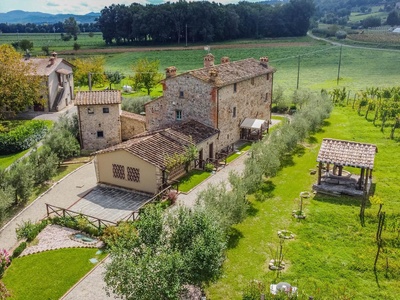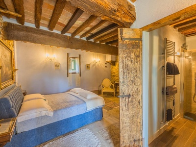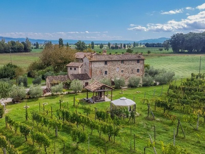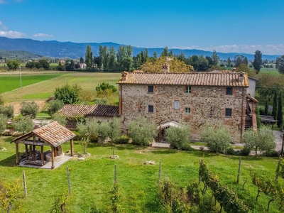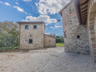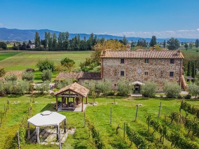 This exceptionally renovated casale is located in one of the most sought-after locations around Anghiari: just a few minutes from the historic town center, yet completely quiet and secluded. As soon as you drive up, you can feel the special atmosphere of the property, which is surrounded by flat land, olive trees, and grapevines, immediately conveying a sense of arrival and relaxation.