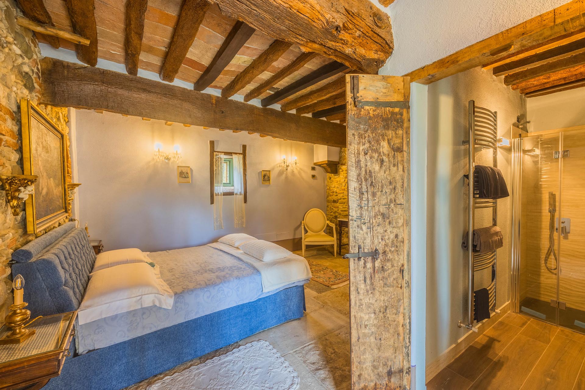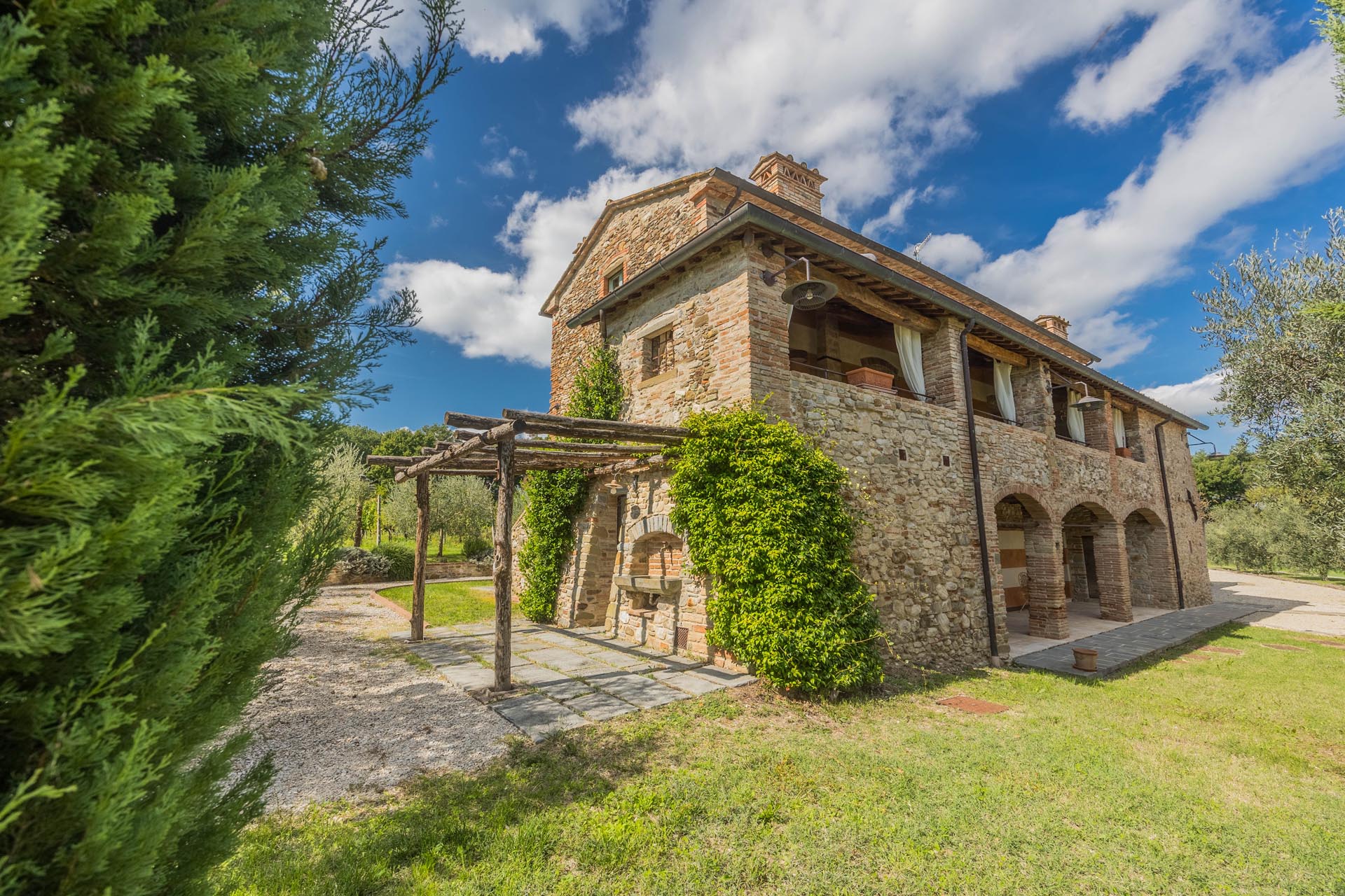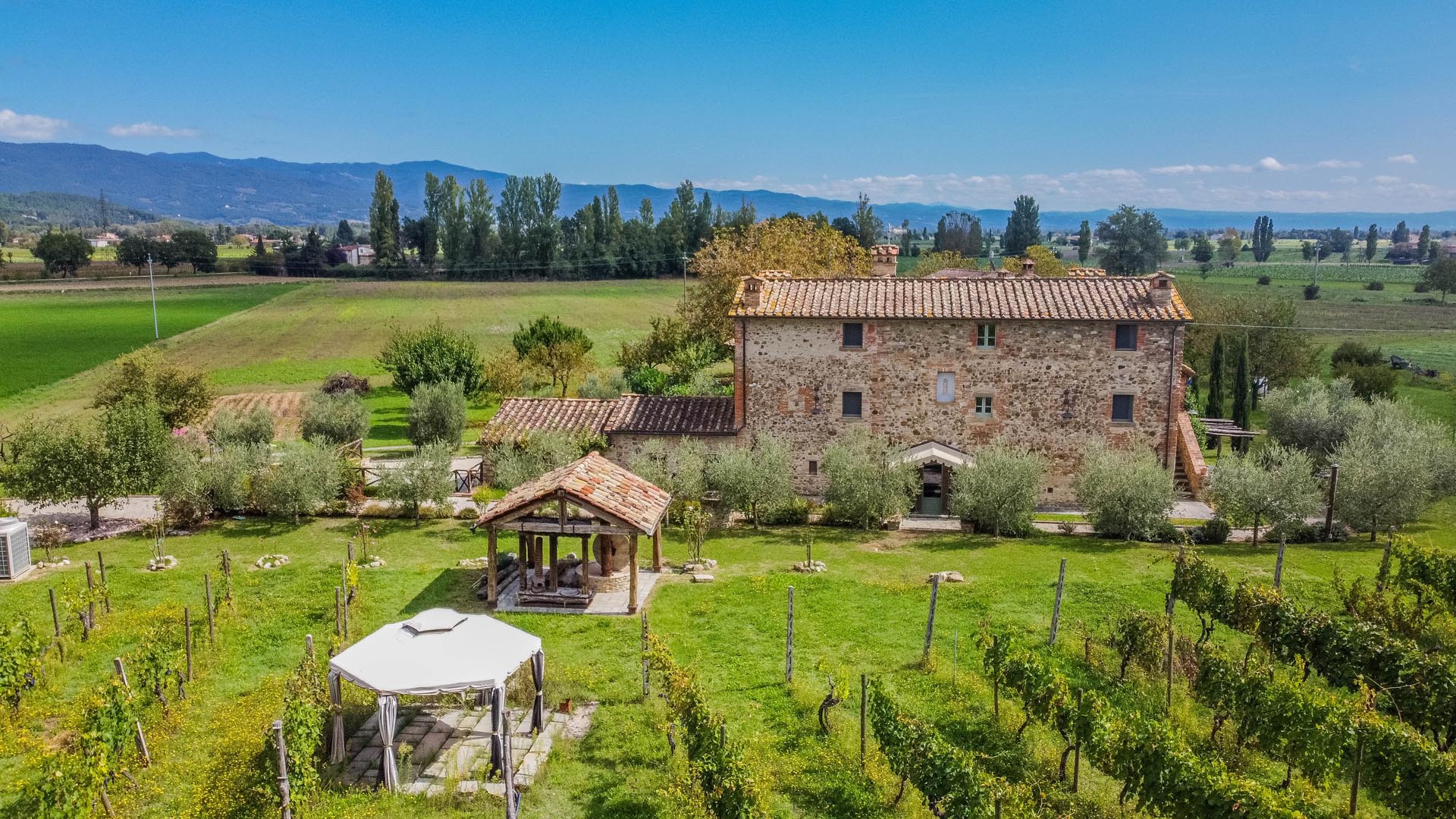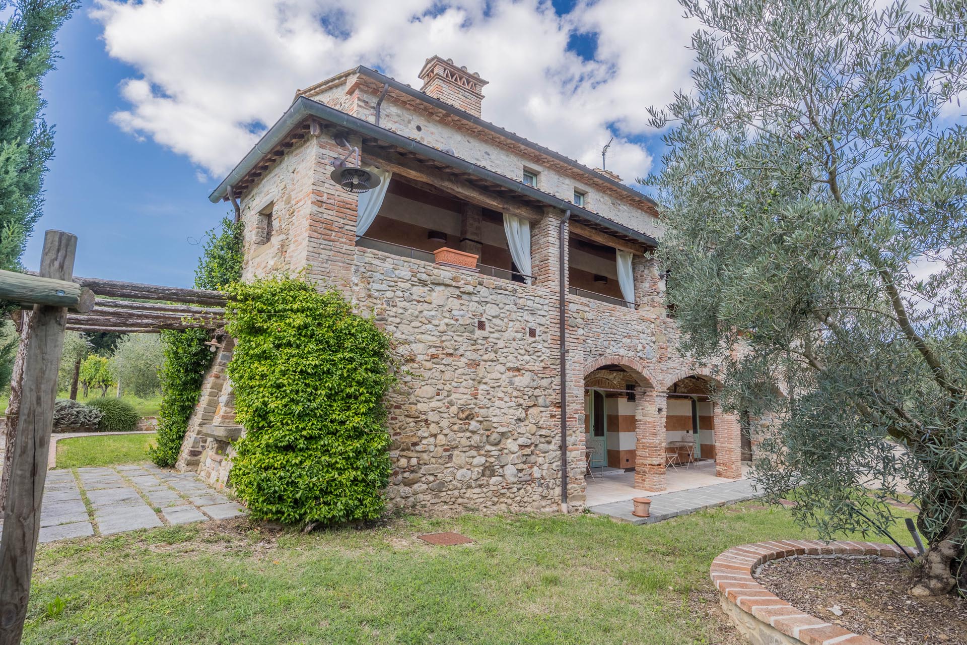 This exceptionally renovated casale is located in one of the most sought-after locations around Anghiari: just a few minutes from the historic town center, yet completely quiet and secluded. As soon as you drive up, you can feel the special atmosphere of the property, which is surrounded by flat land, olive trees, and grapevines, immediately conveying a sense of arrival and relaxation.