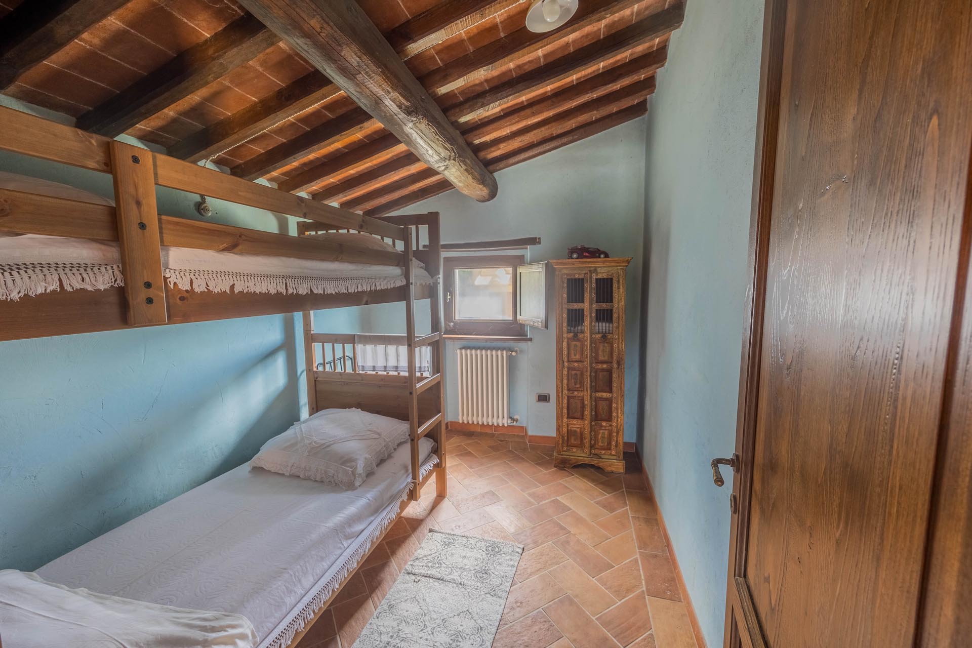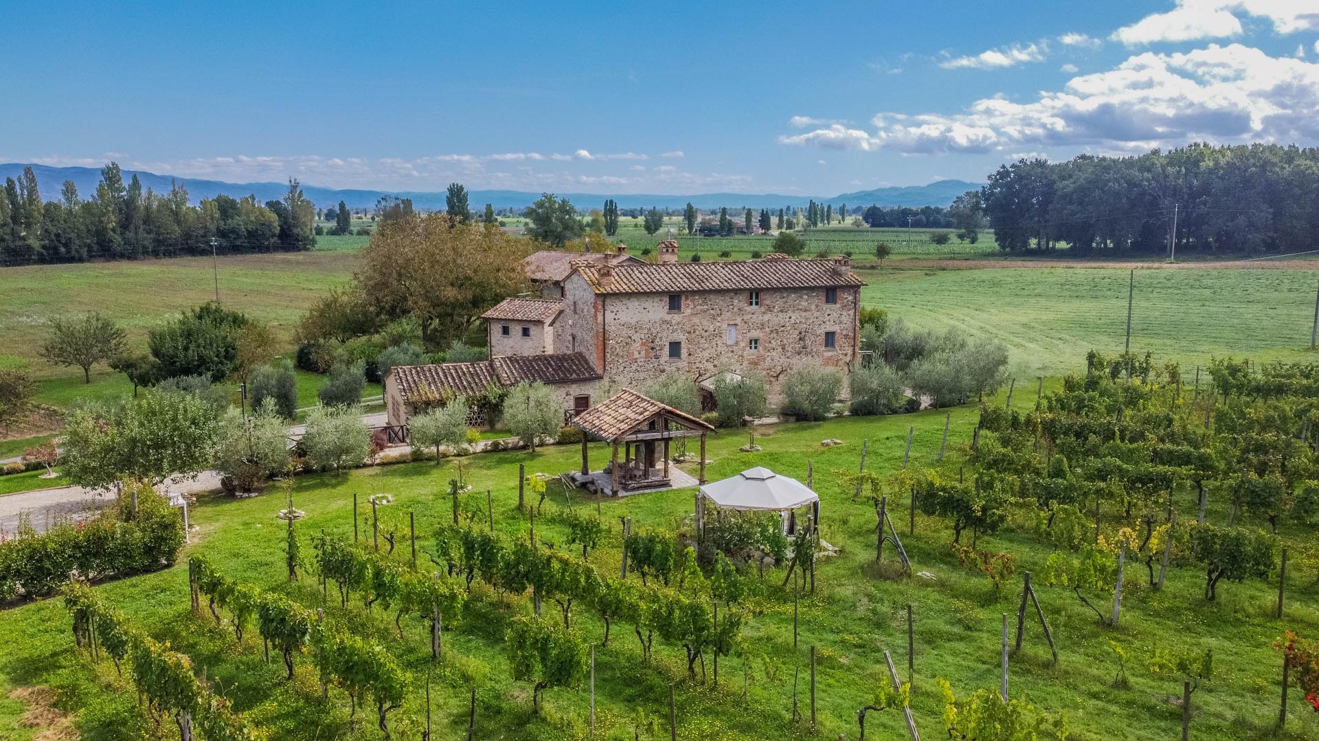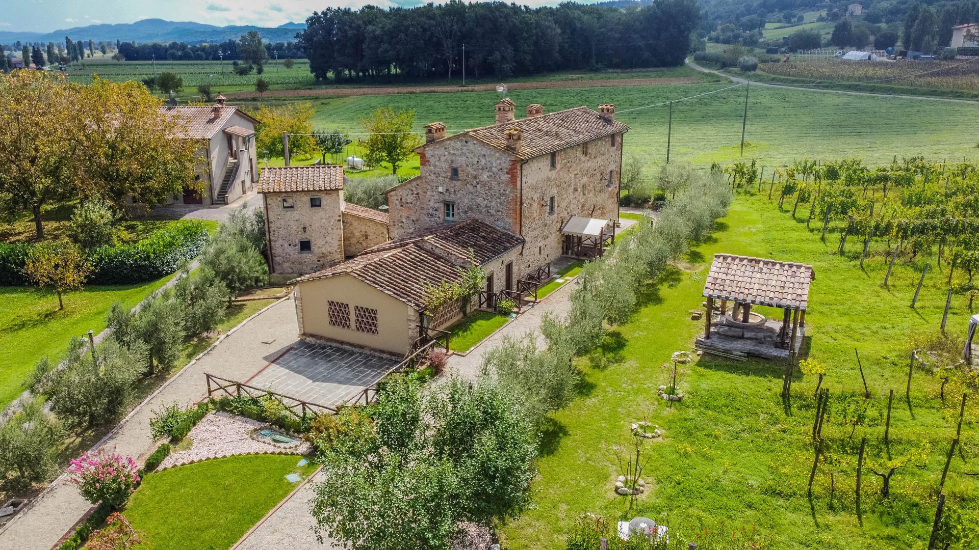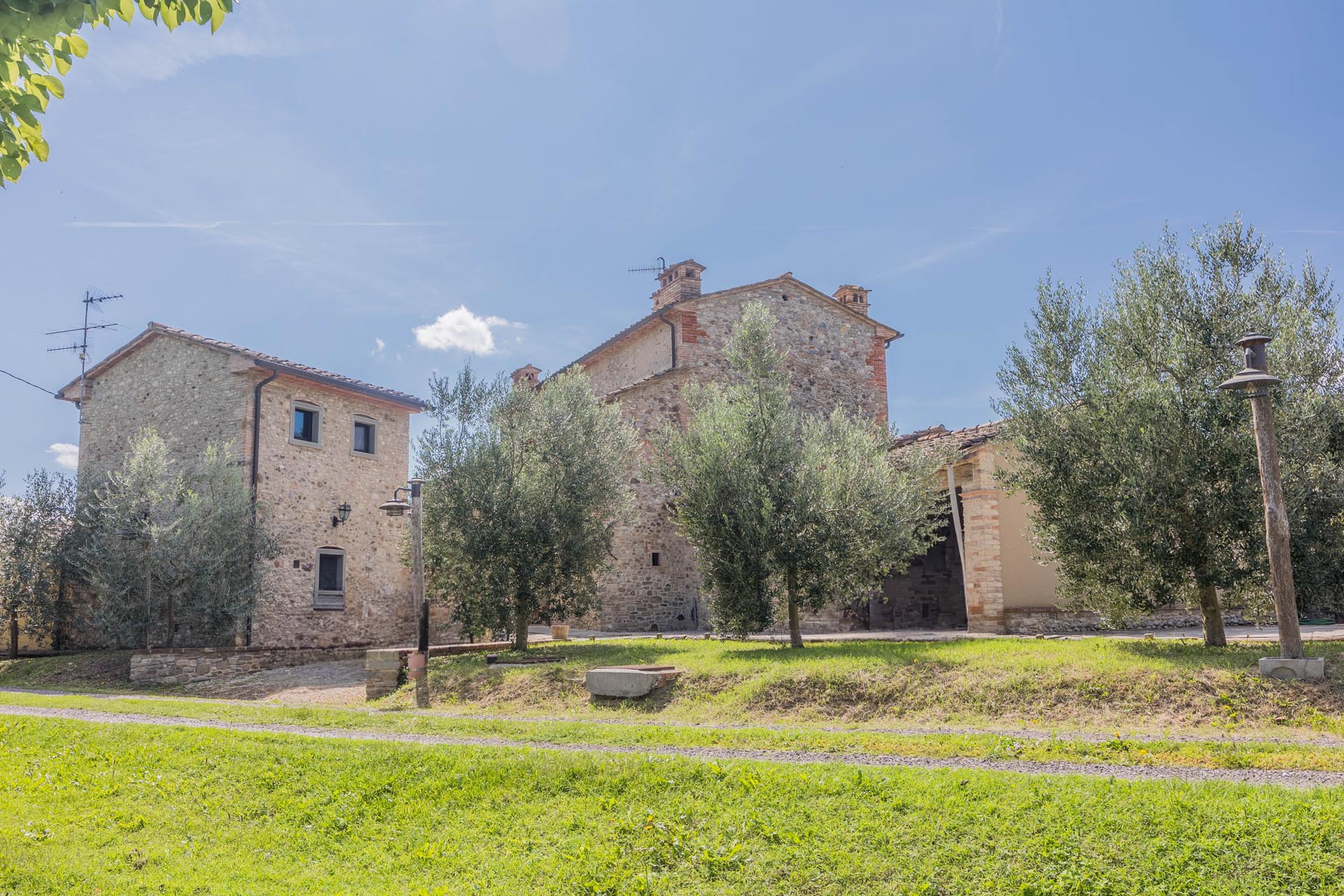 This exceptionally renovated casale is located in one of the most sought-after locations around Anghiari: just a few minutes from the historic town center, yet completely quiet and secluded. As soon as you drive up, you can feel the special atmosphere of the property, which is surrounded by flat land, olive trees, and grapevines, immediately conveying a sense of arrival and relaxation.