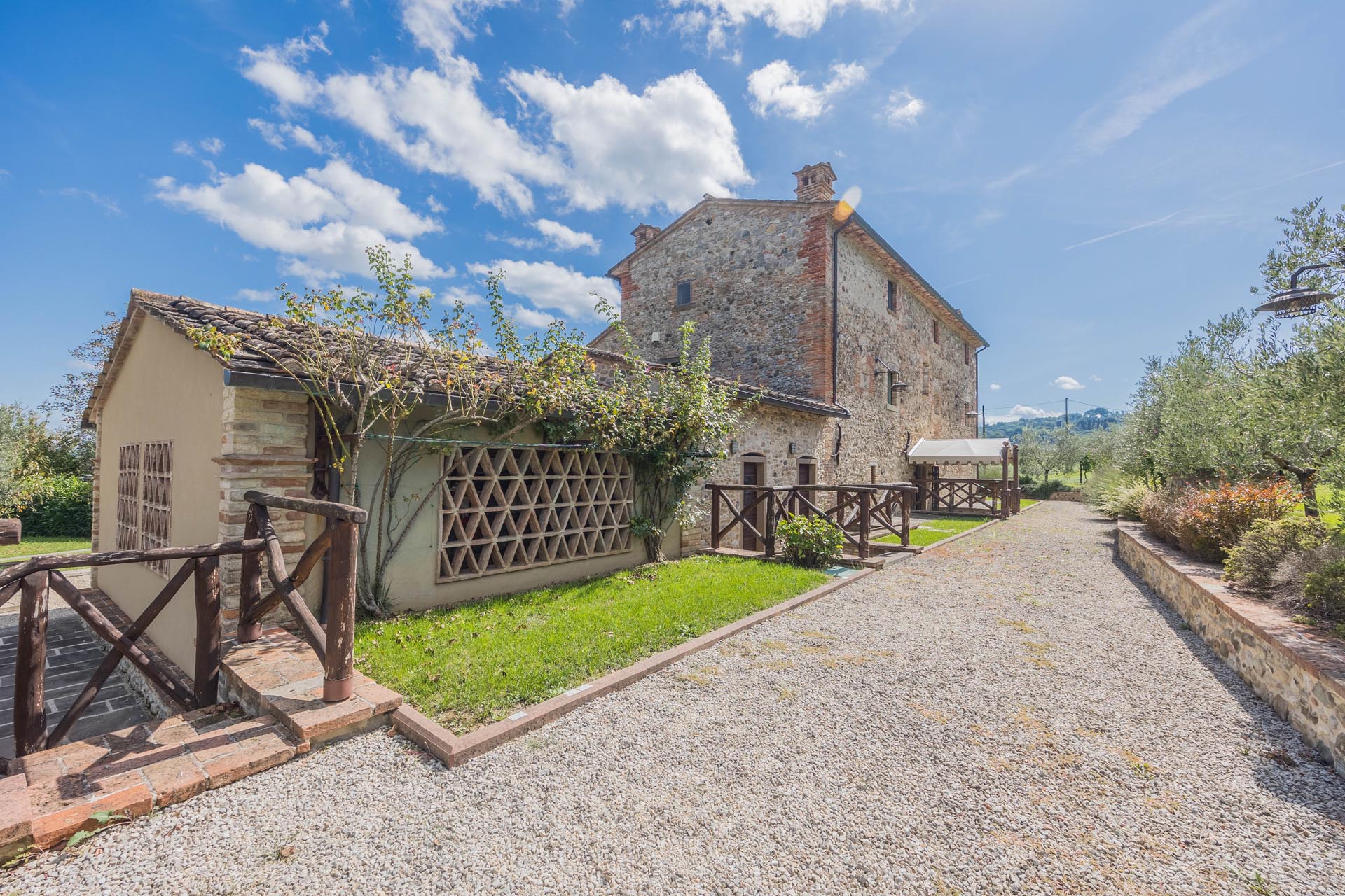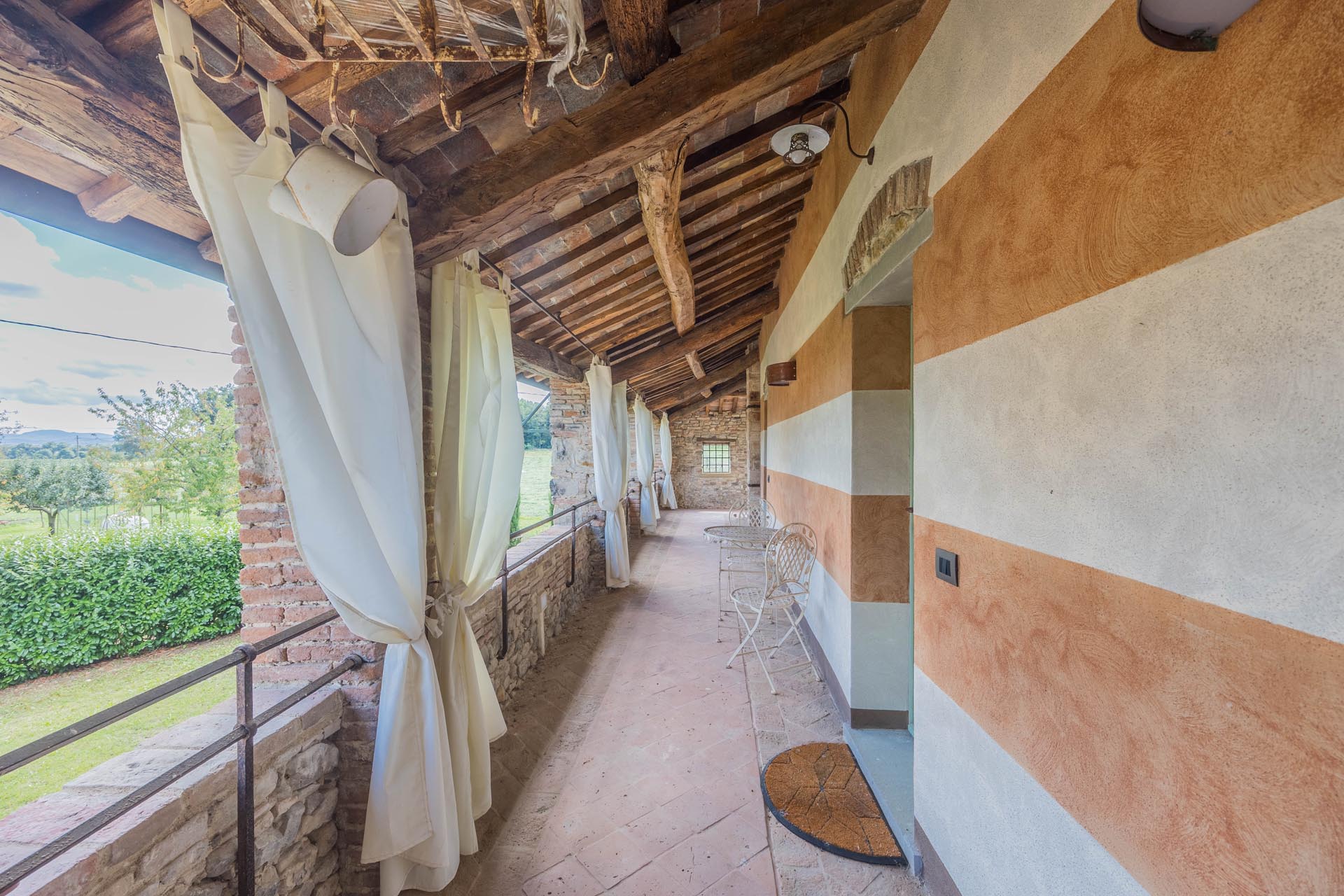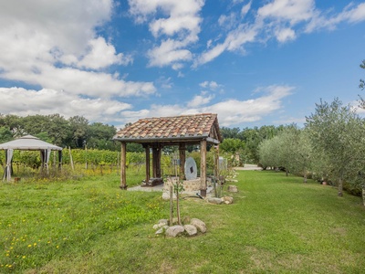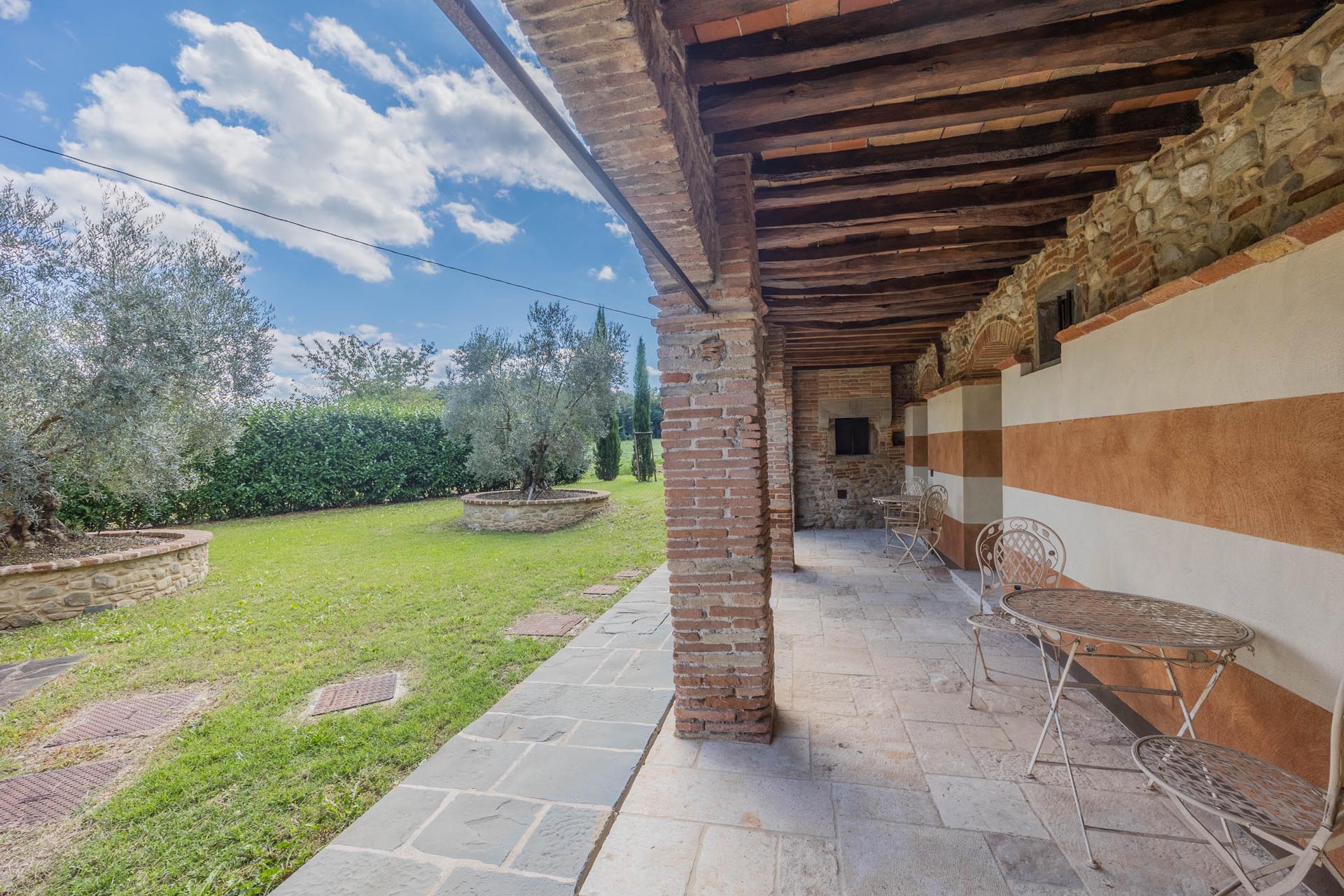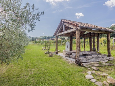 The casale is also state-of-the-art in terms of technology. Energy class A, a photovoltaic system, heat pump heating, comprehensive facade insulation, an automatic entrance gate, and its own deep well ensure efficiency, comfort, and sustainability. The house is surrounded by well-maintained grounds with beautiful loggias and terraces that invite you to linger outdoors and create a true oasis of calm. There is also the option of installing a pool to further enhance the property.