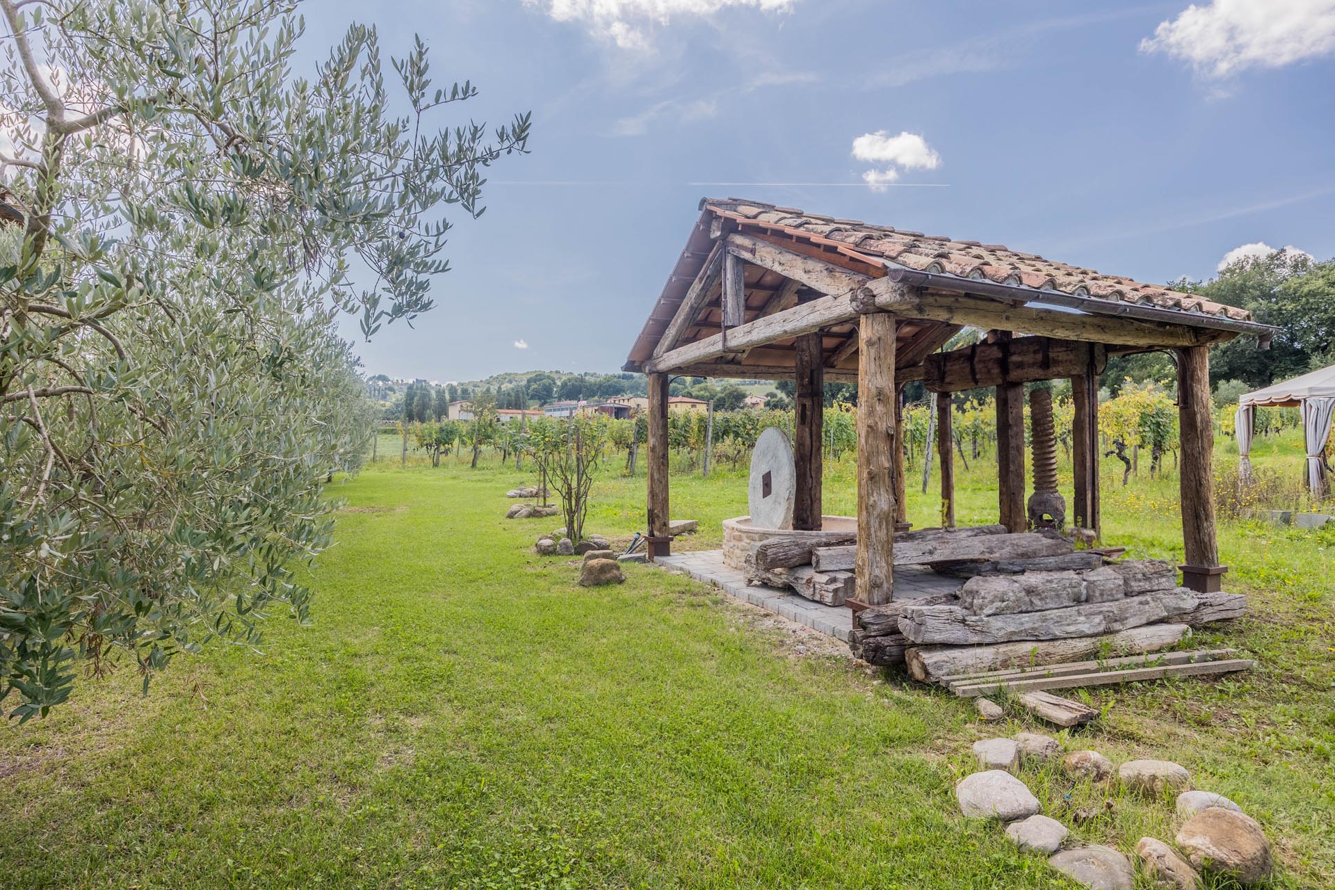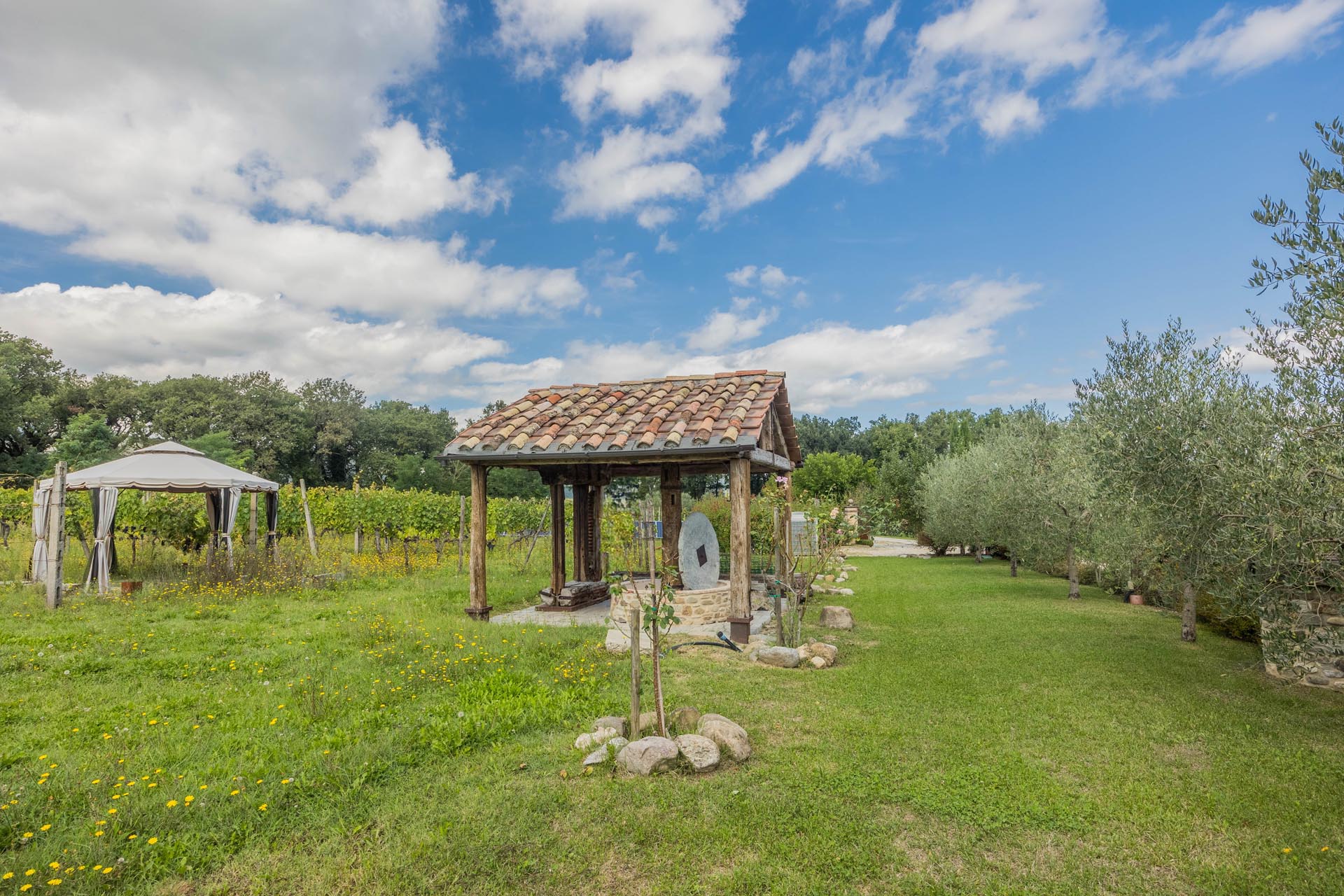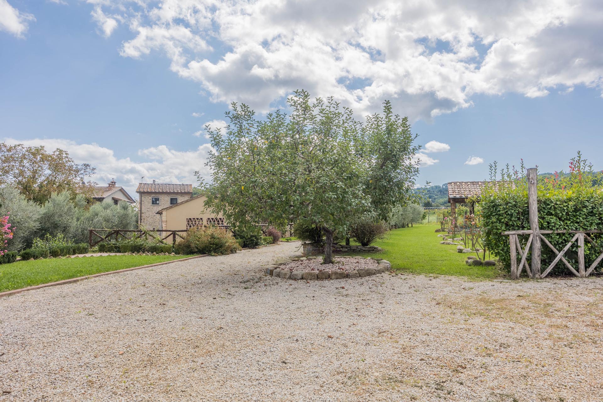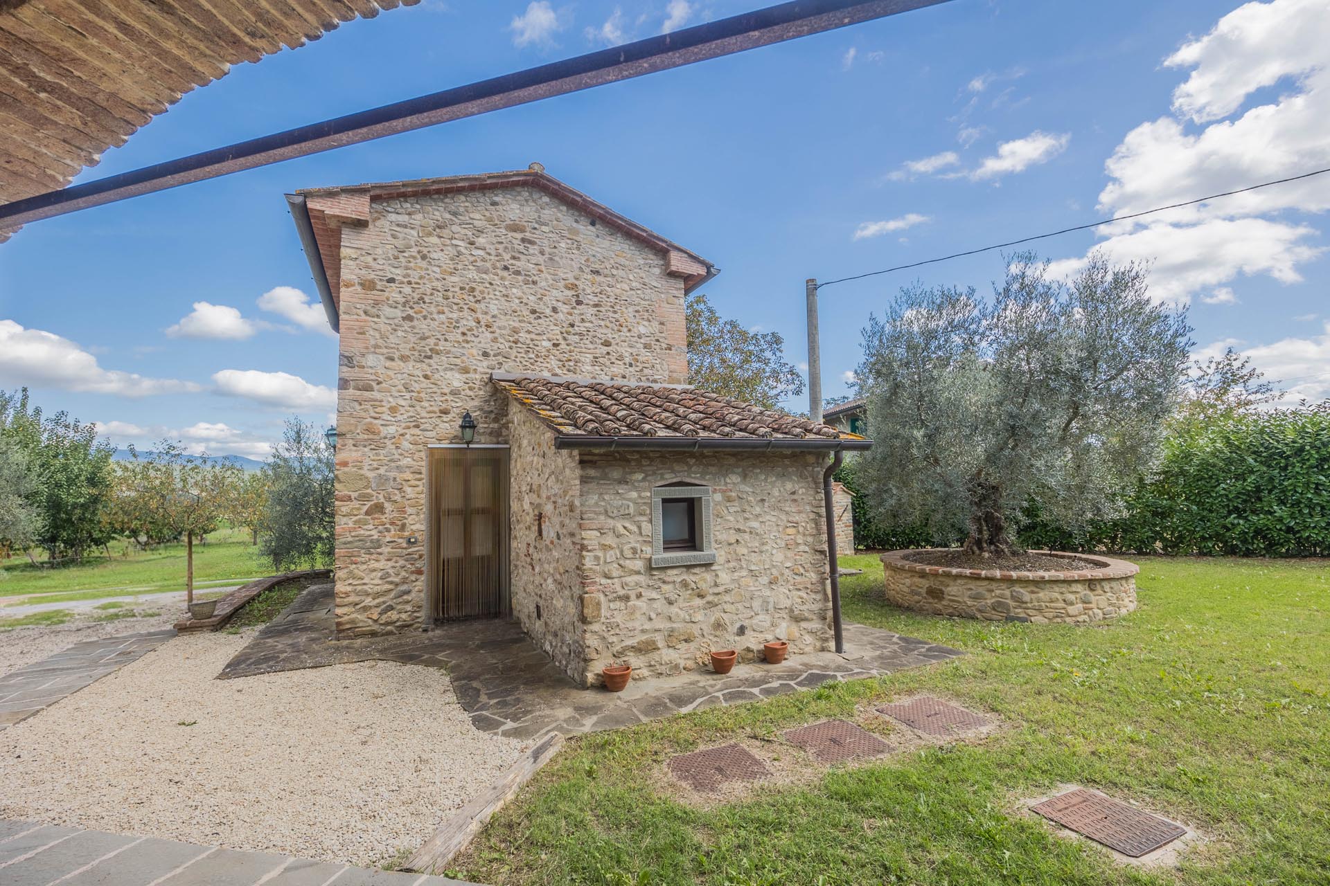 The casale is also state-of-the-art in terms of technology. Energy class A, a photovoltaic system, heat pump heating, comprehensive facade insulation, an automatic entrance gate, and its own deep well ensure efficiency, comfort, and sustainability. The house is surrounded by well-maintained grounds with beautiful loggias and terraces that invite you to linger outdoors and create a true oasis of calm. There is also the option of installing a pool to further enhance the property.
