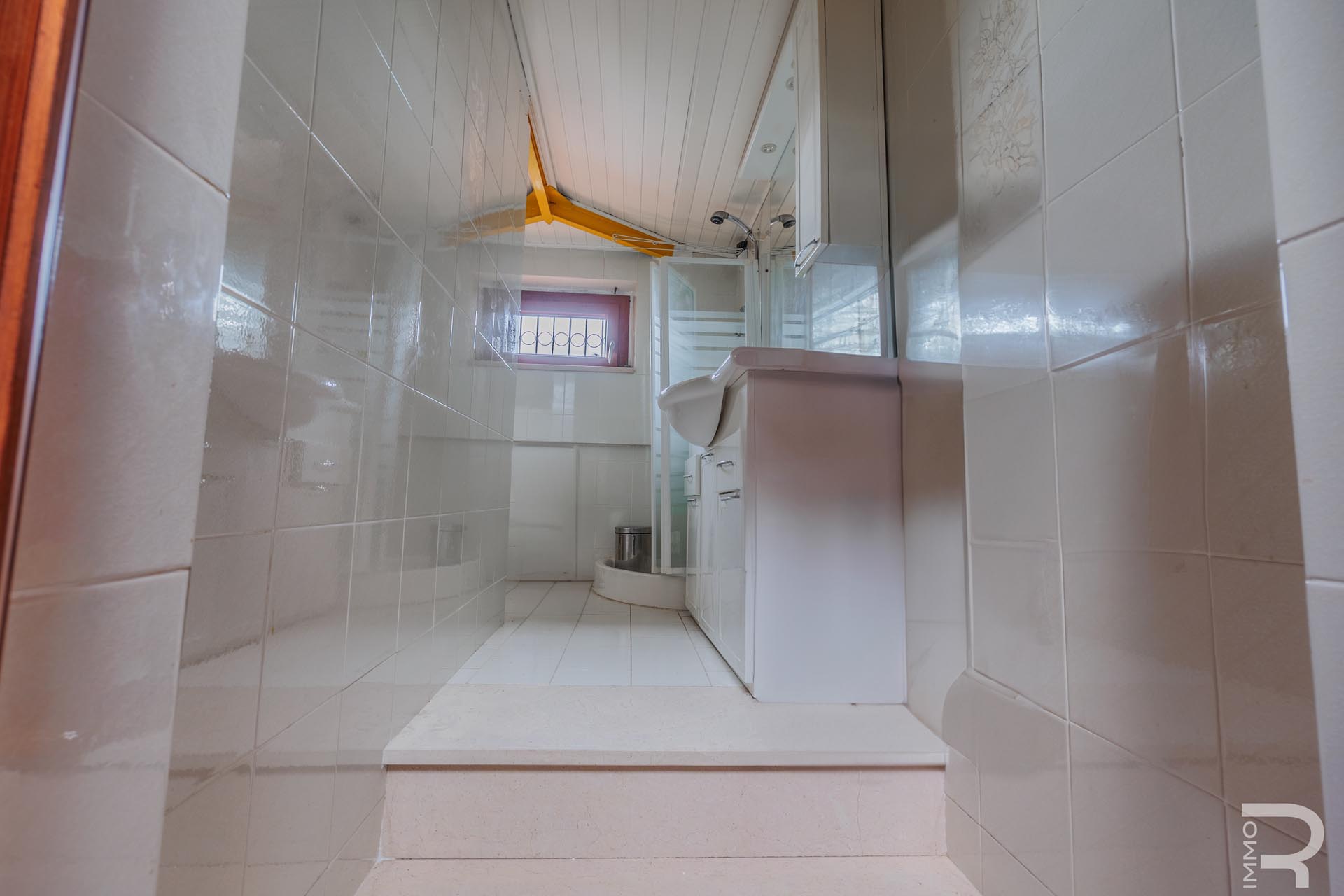 The living area on the ground floor consists of an inviting kitchen and a cozy living room, ideal for social evenings or relaxing hours. Generous windows provide plenty of daylight and a direct connection to the greenery outside. On the first floor, there are two bedrooms and two bathrooms, making this area a comfortable and private living space.