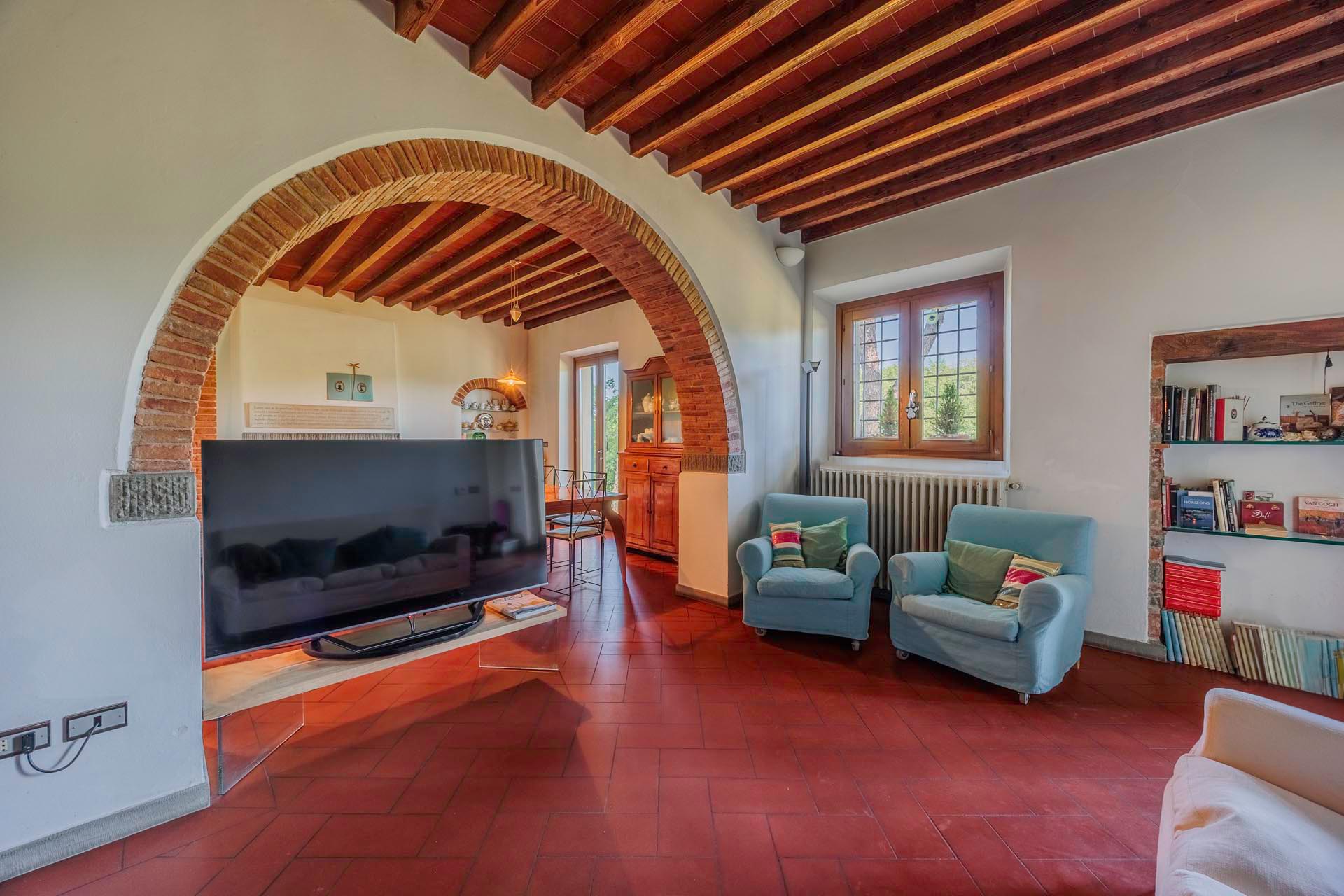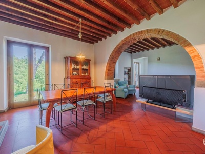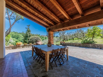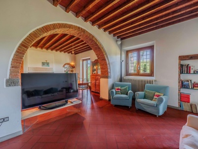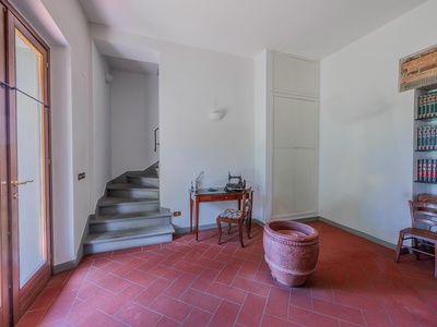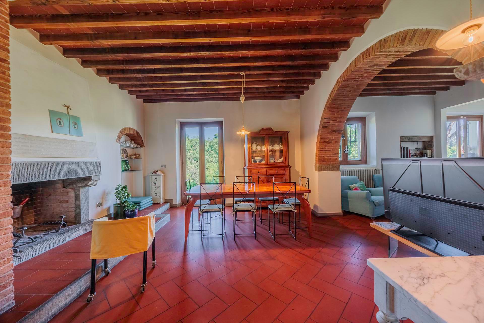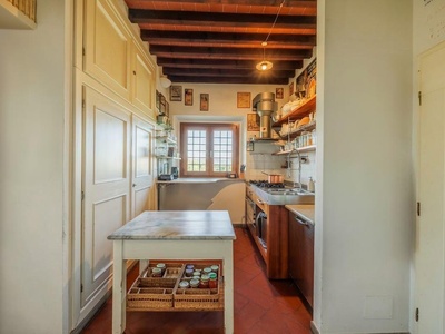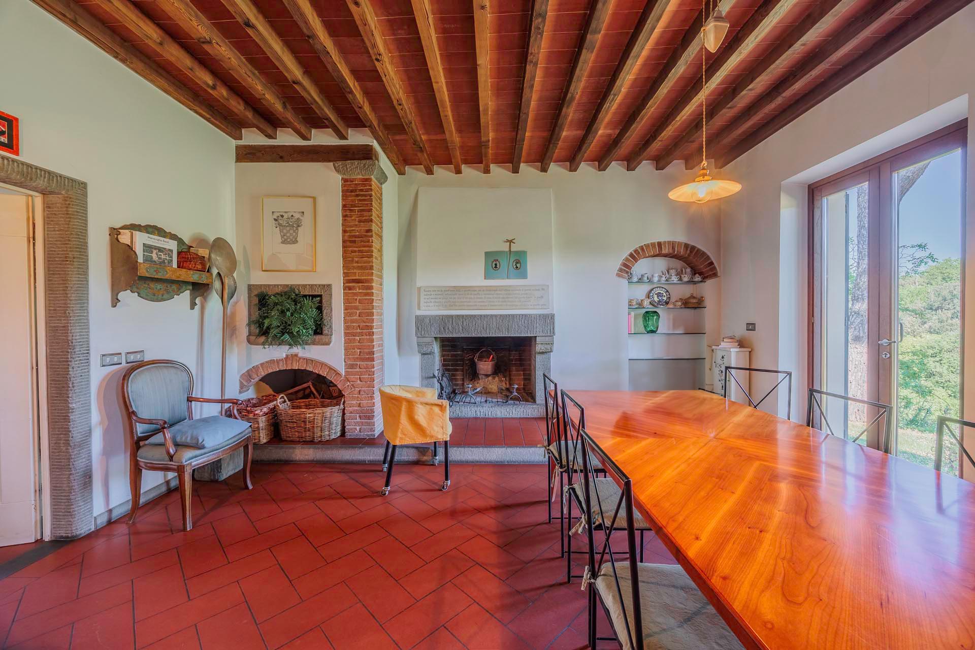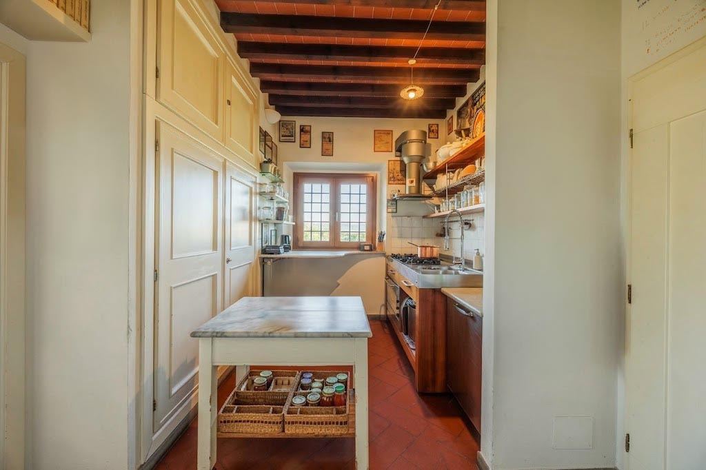The property was renovated in 1996 using high-quality materials and captivates with its authentic Tuscan style. Inside, terracotta floors, exposed wooden beams, and elegant “Pietra Serena” stone cladding create a stylish yet warm ambiance that underscores the home’s character.