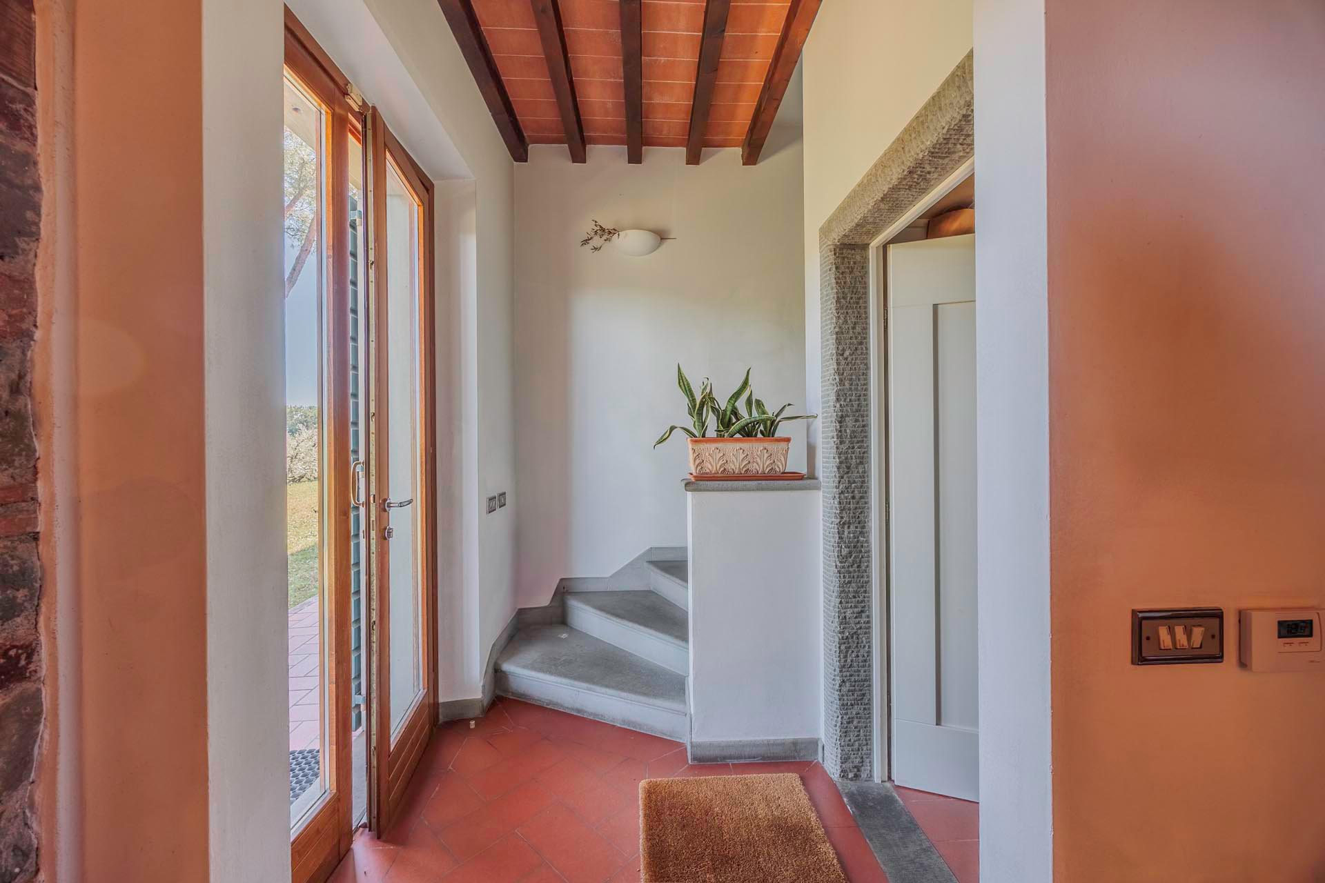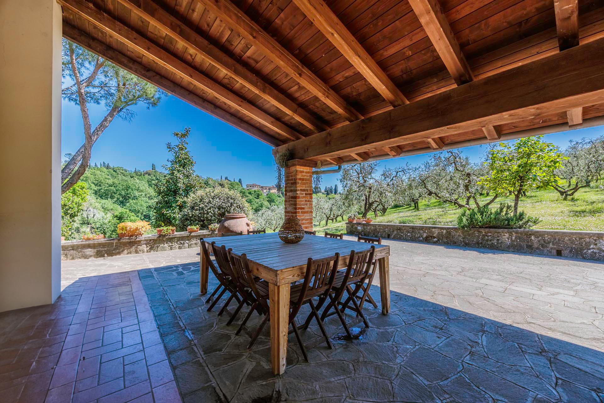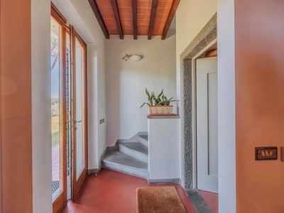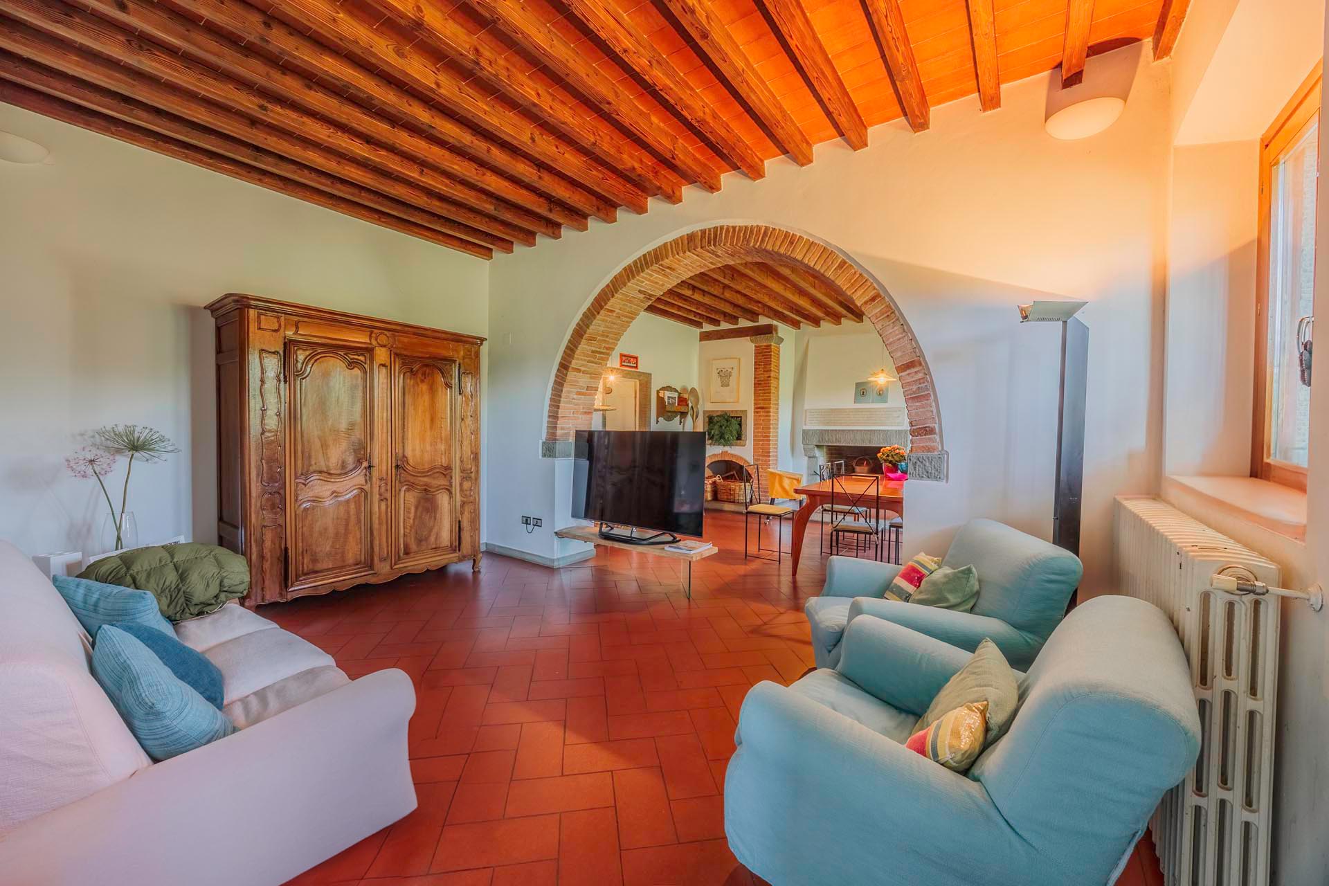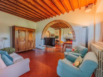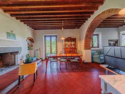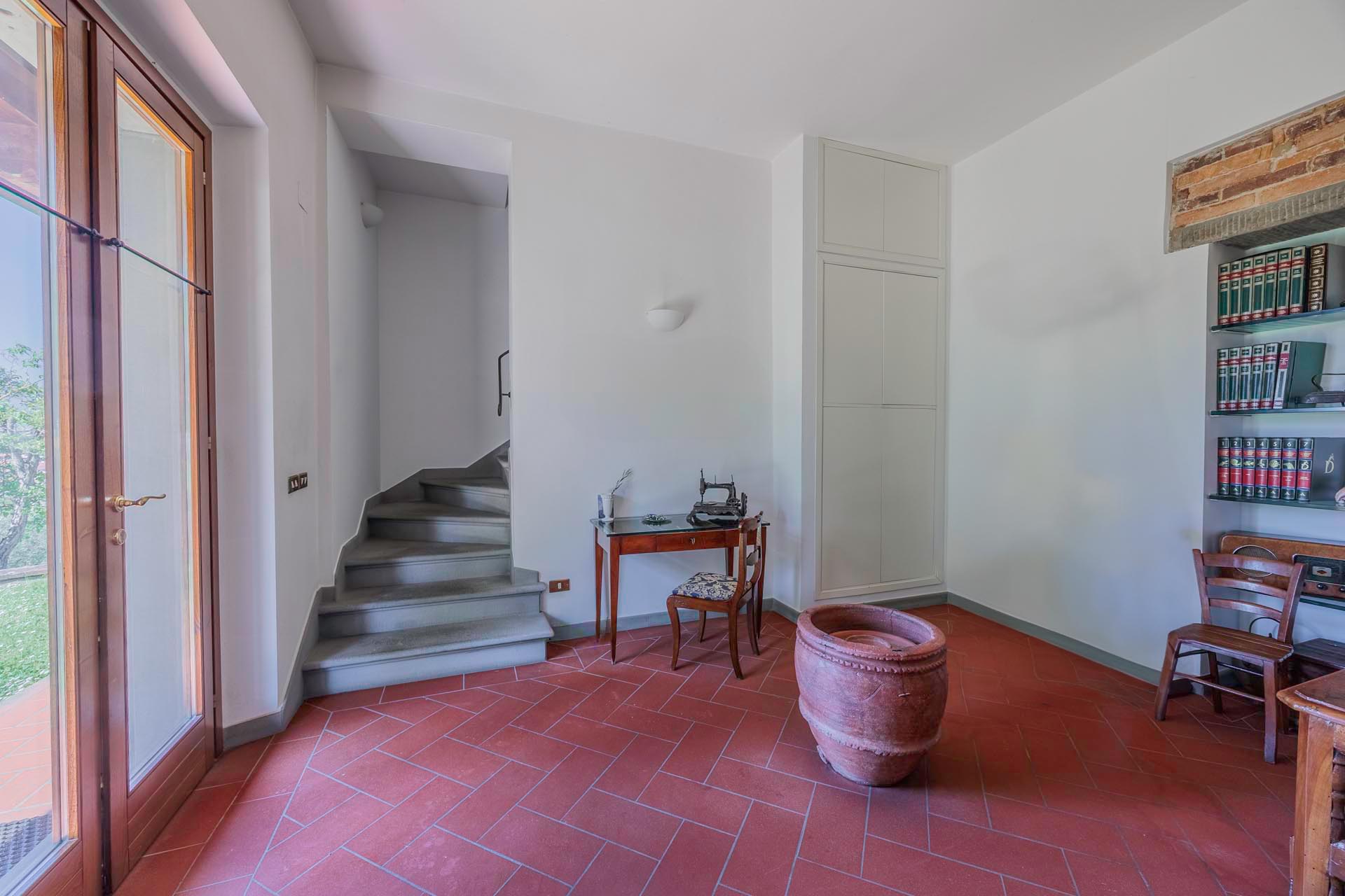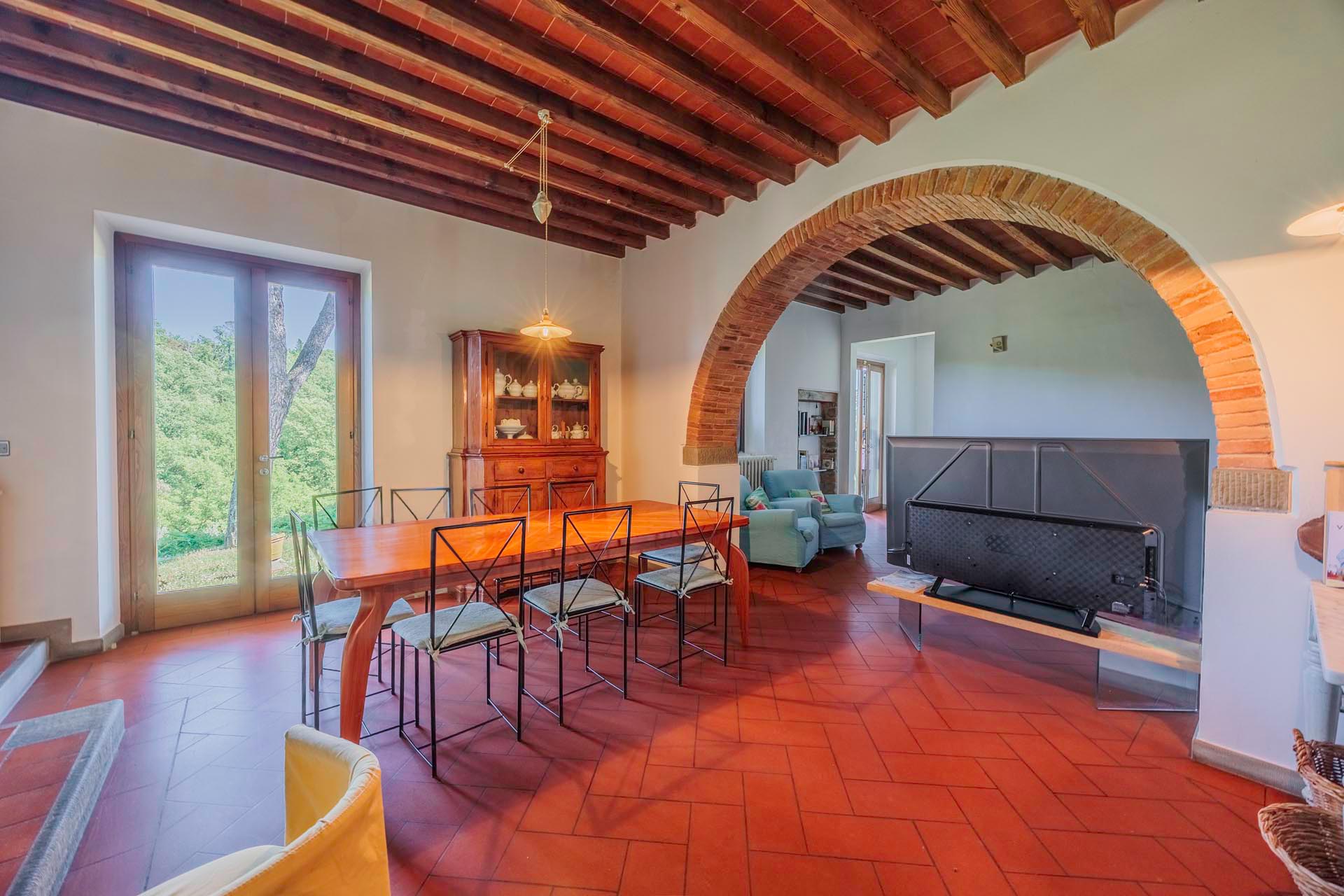 The property was renovated in 1996 using high-quality materials and captivates with its authentic Tuscan style. Inside, terracotta floors, exposed wooden beams, and elegant “Pietra Serena” stone cladding create a stylish yet warm ambiance that underscores the home’s character.