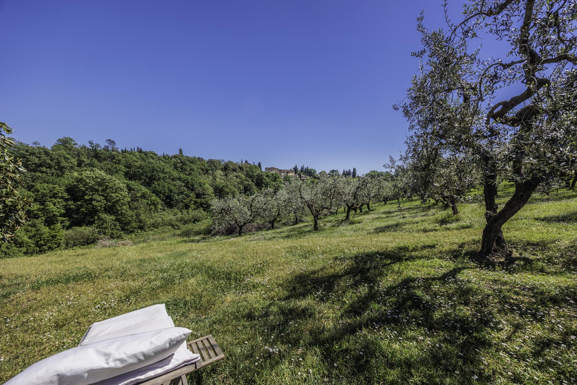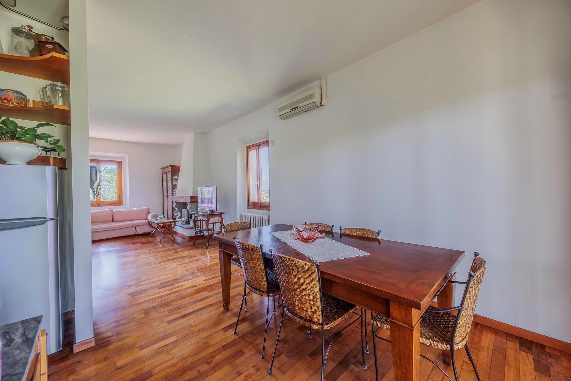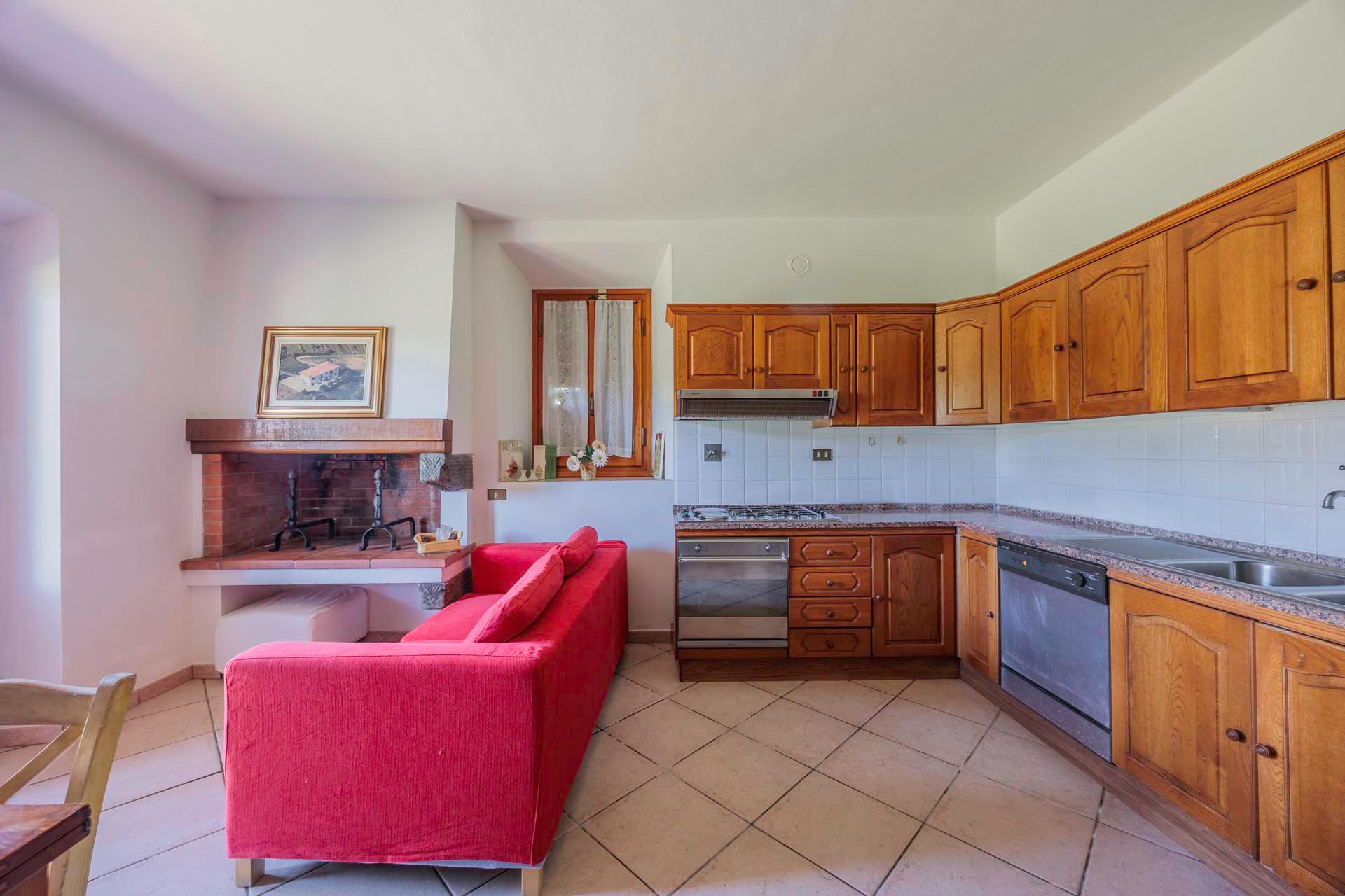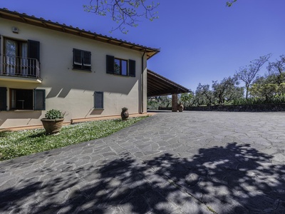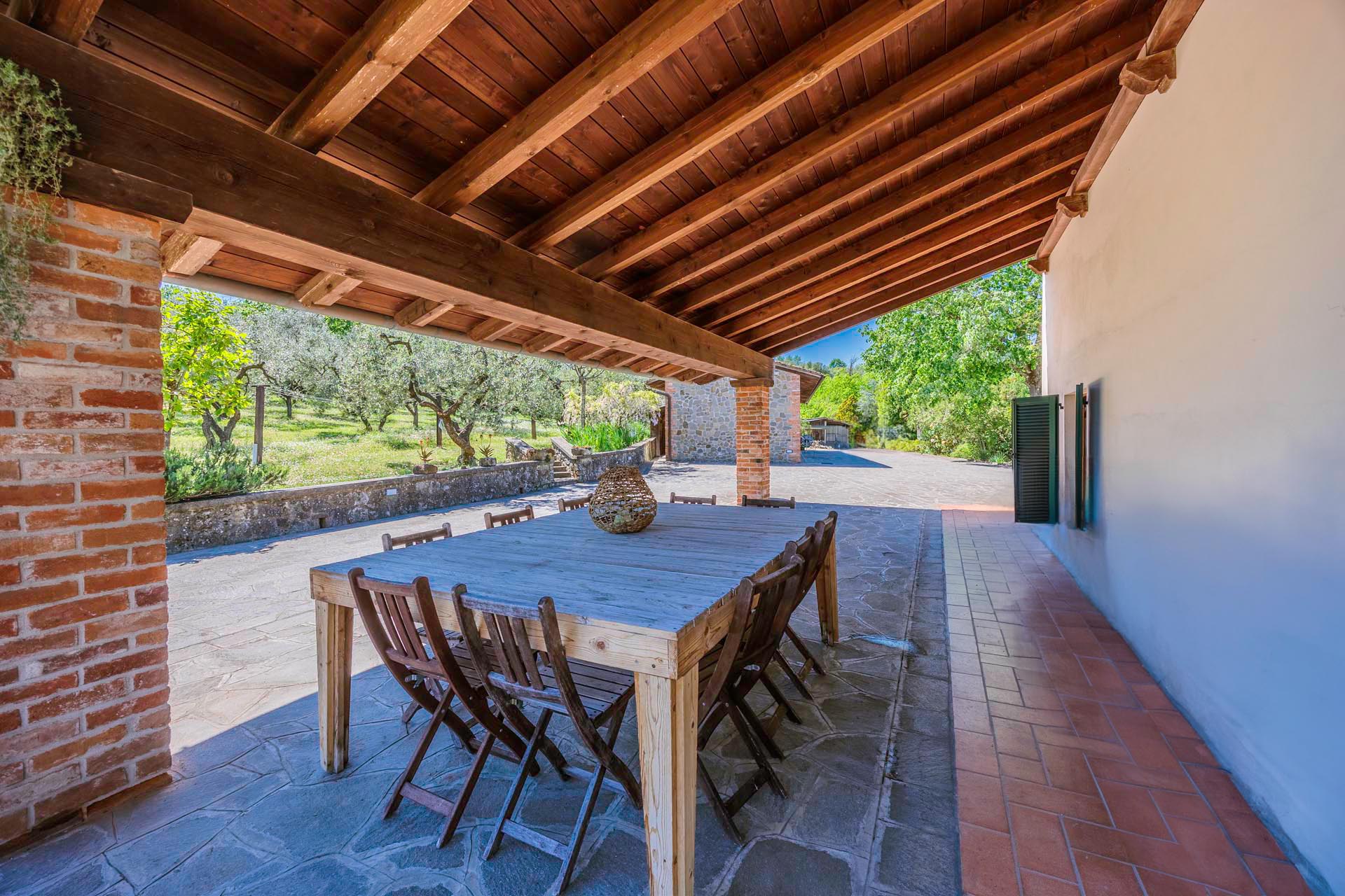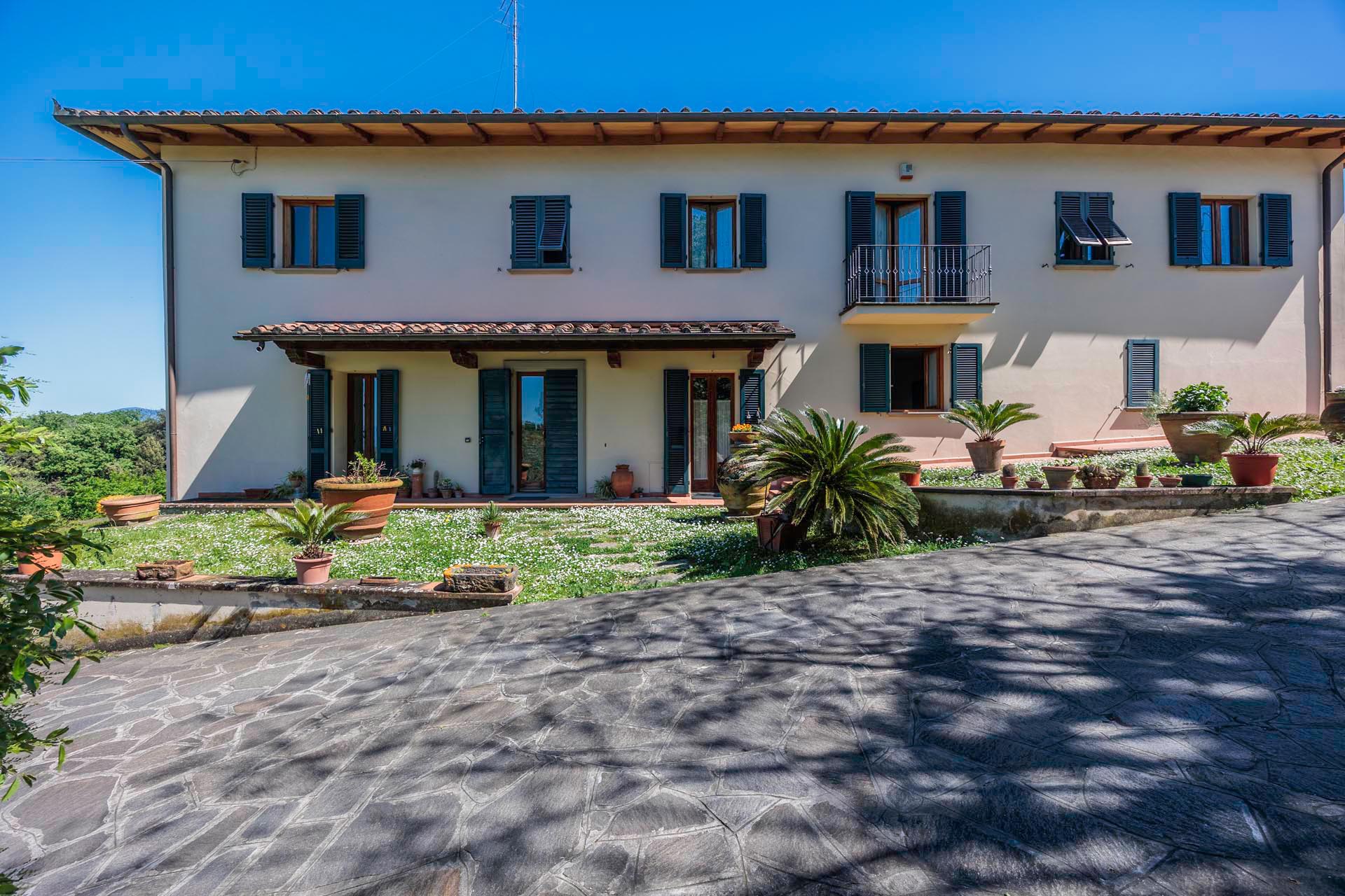 The property was renovated in 1996 using high-quality materials and captivates with its authentic Tuscan style. Inside, terracotta floors, exposed wooden beams, and elegant “Pietra Serena” stone cladding create a stylish yet warm ambiance that underscores the home’s character.