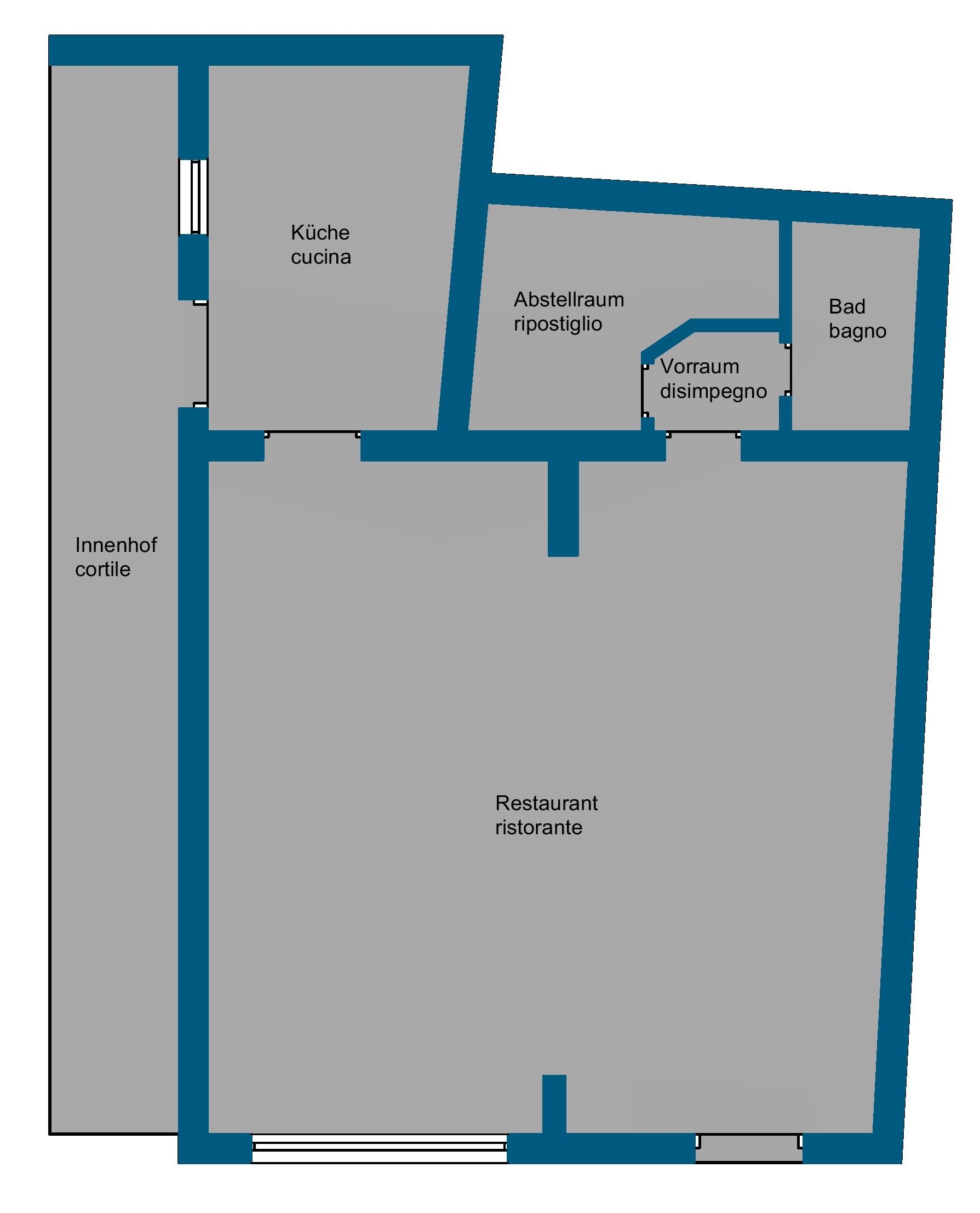 Gli interni sono parzialmente arredati, quindi una parte dell'arredamento può essere già rilevata. Ciò offre una base ideale per adattare il locale alle proprie esigenze o al concetto gastronomico desiderato senza grandi sforzi. Allo stesso tempo, rimane spazio sufficiente per possibilità di personalizzazione.