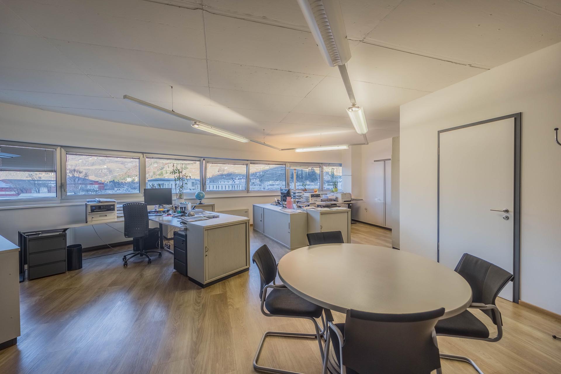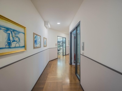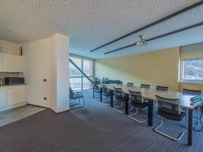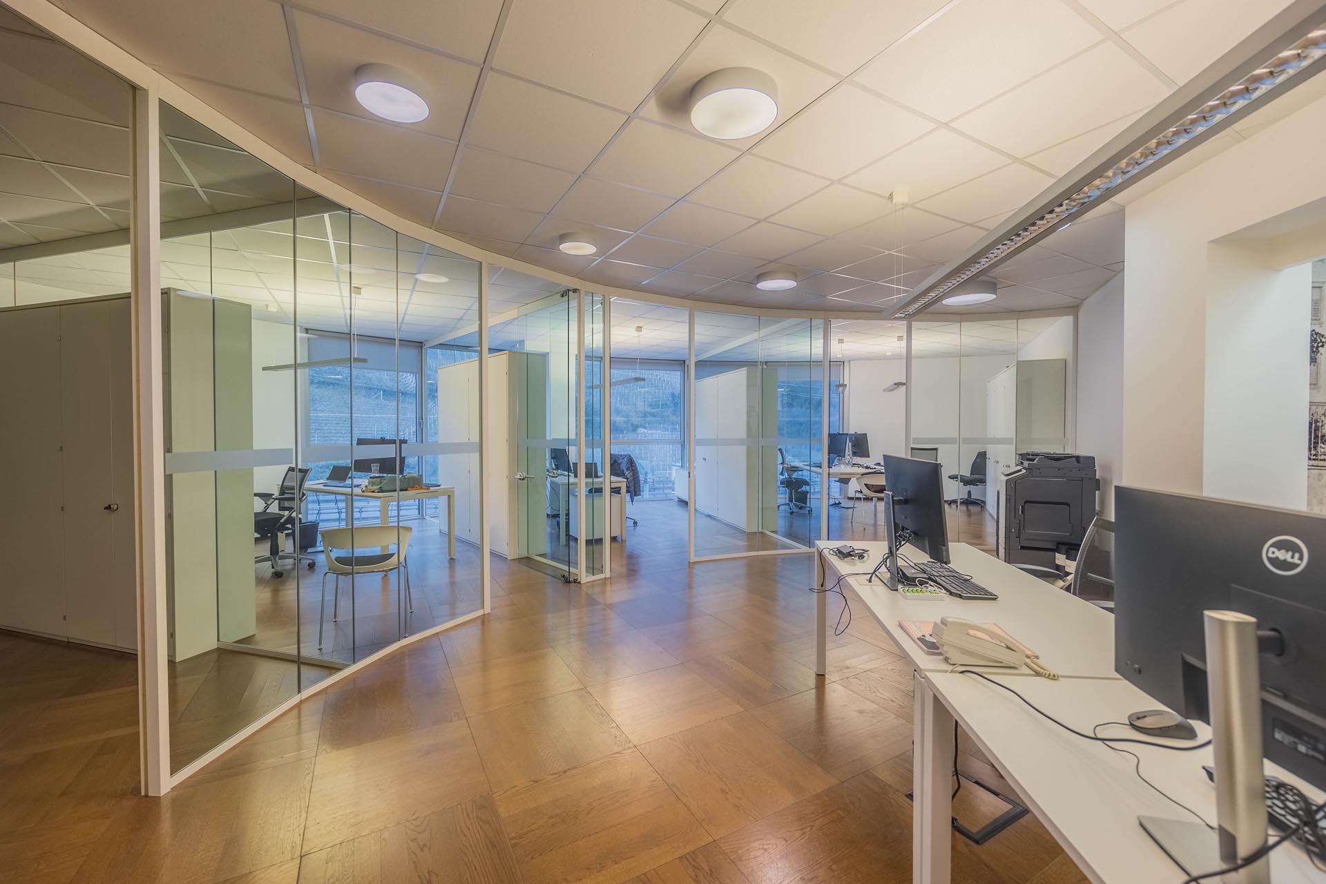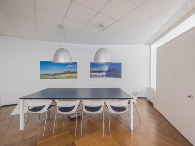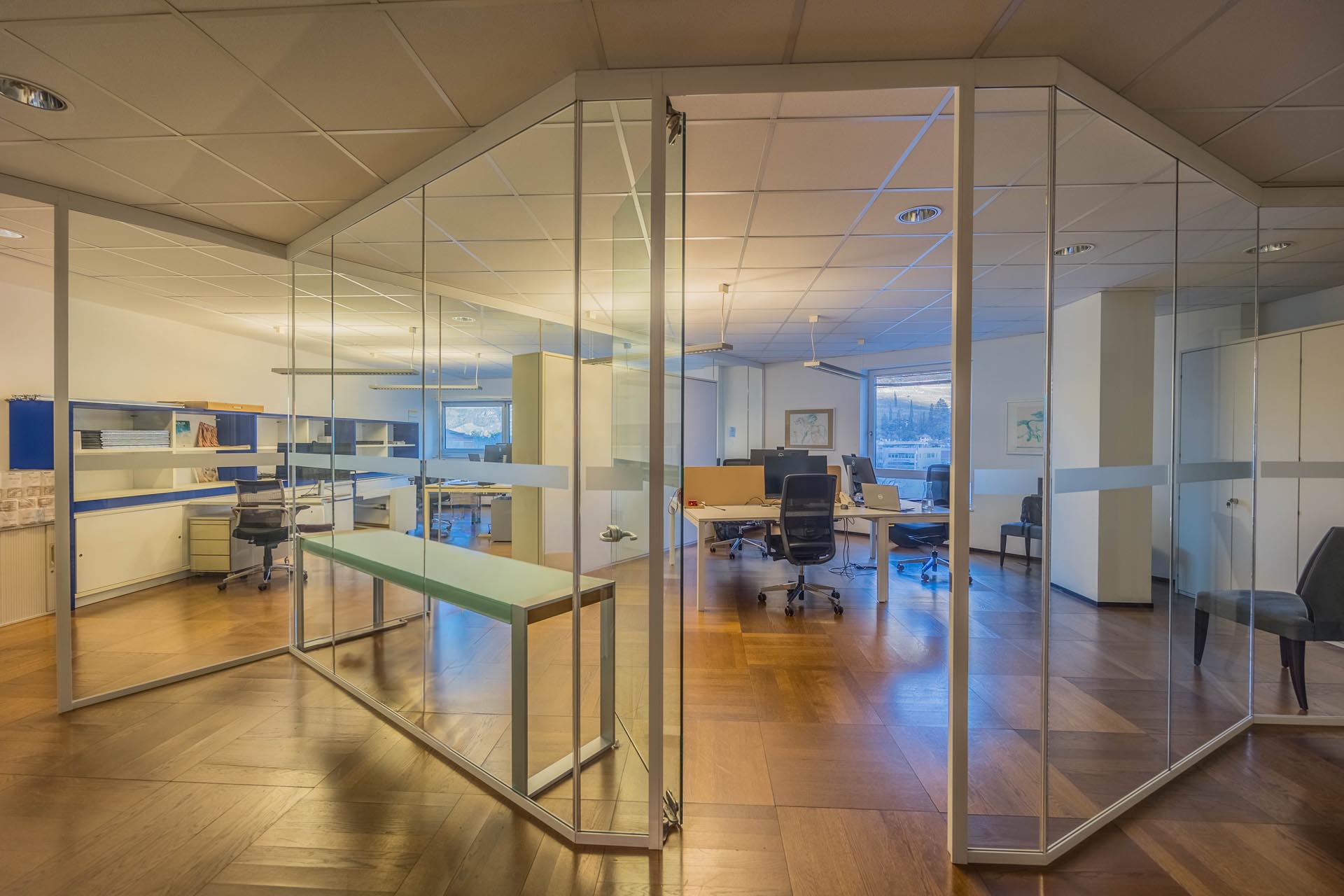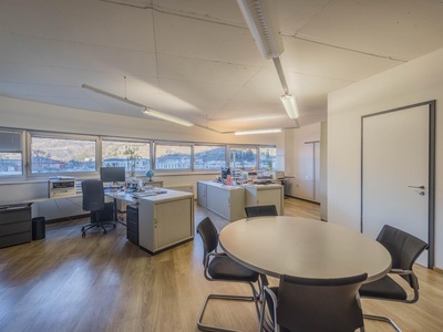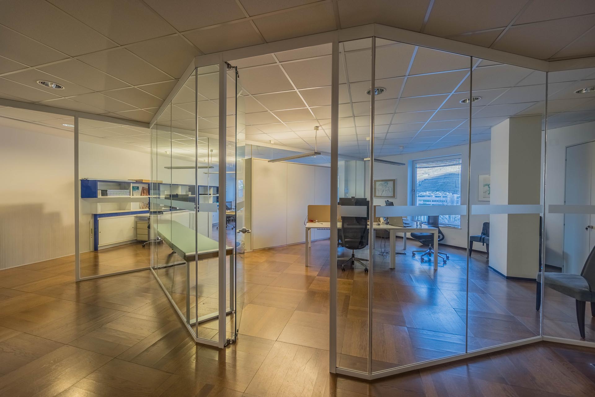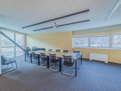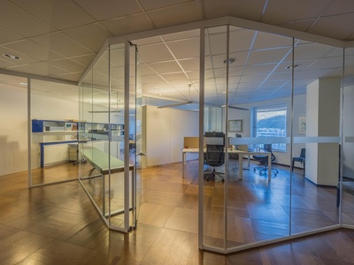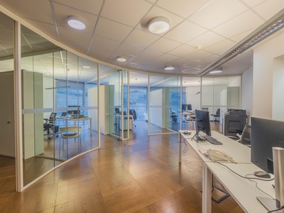 Le ampie superfici vetrate garantiscono molta luce naturale e creano un'atmosfera di lavoro luminosa e piacevole, che favorisce la produttività e il comfort. L'arredamento è di alta qualità e contemporaneo, il che conferisce all'ufficio un aspetto professionale sia dal punto di vista funzionale che estetico.