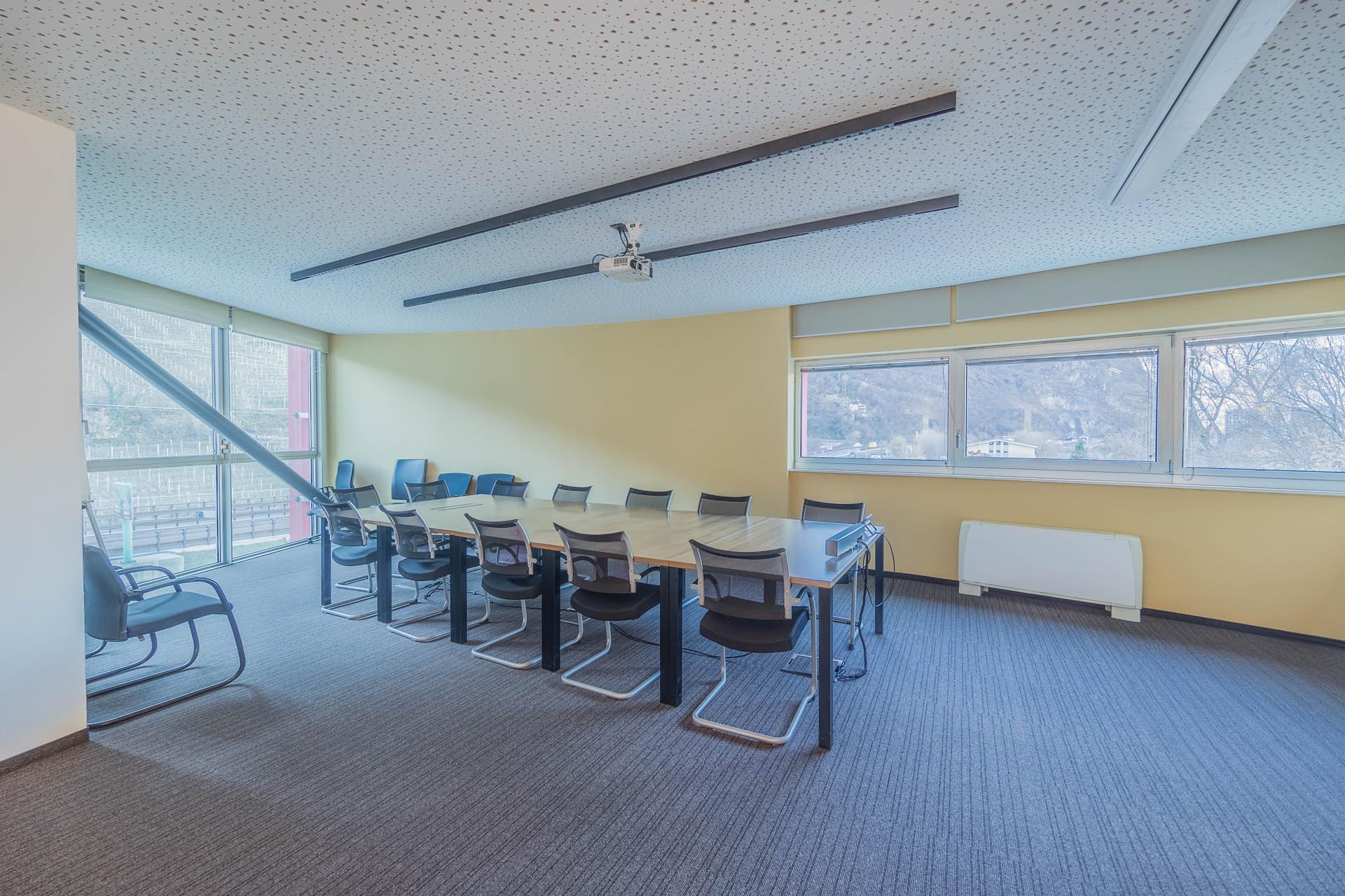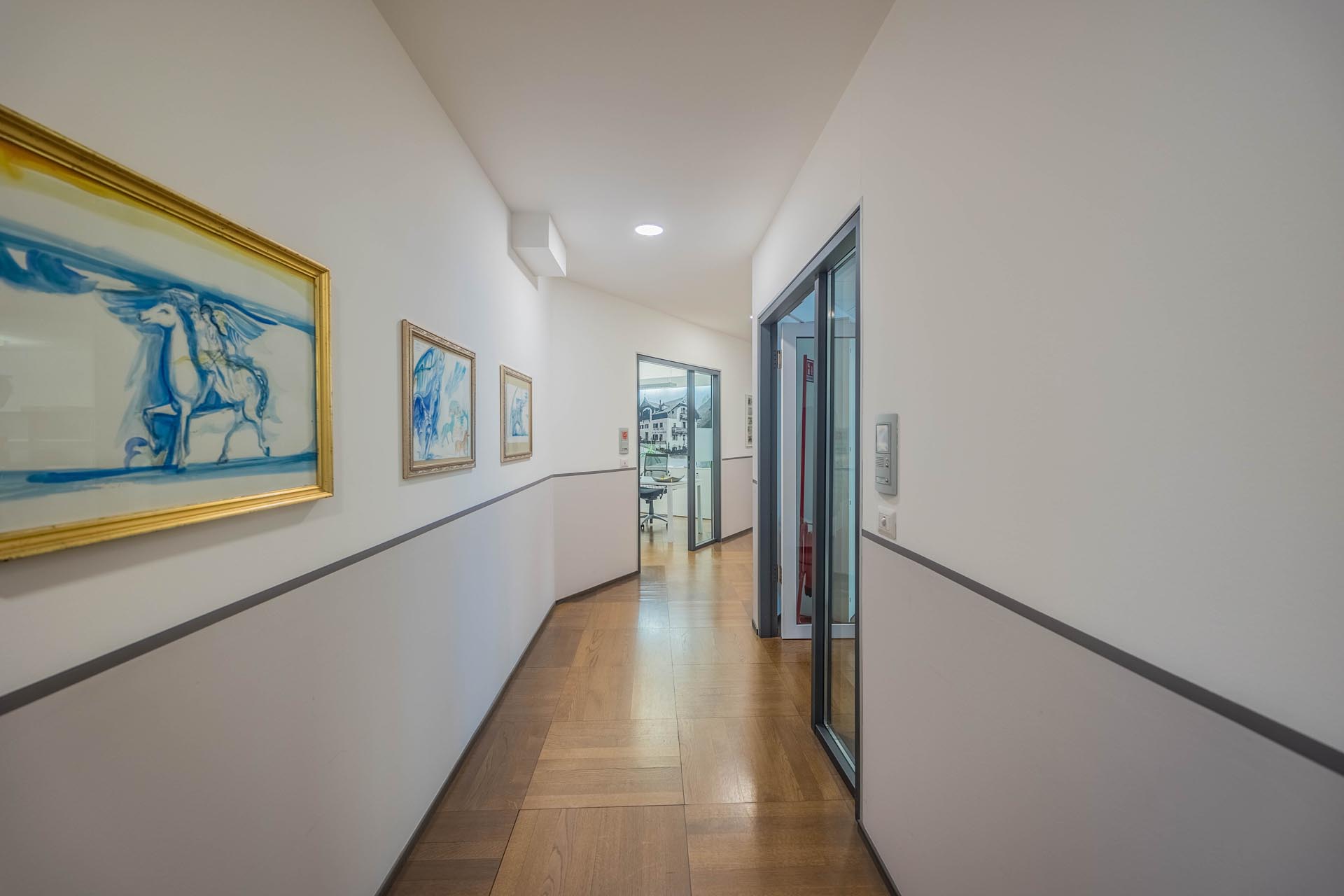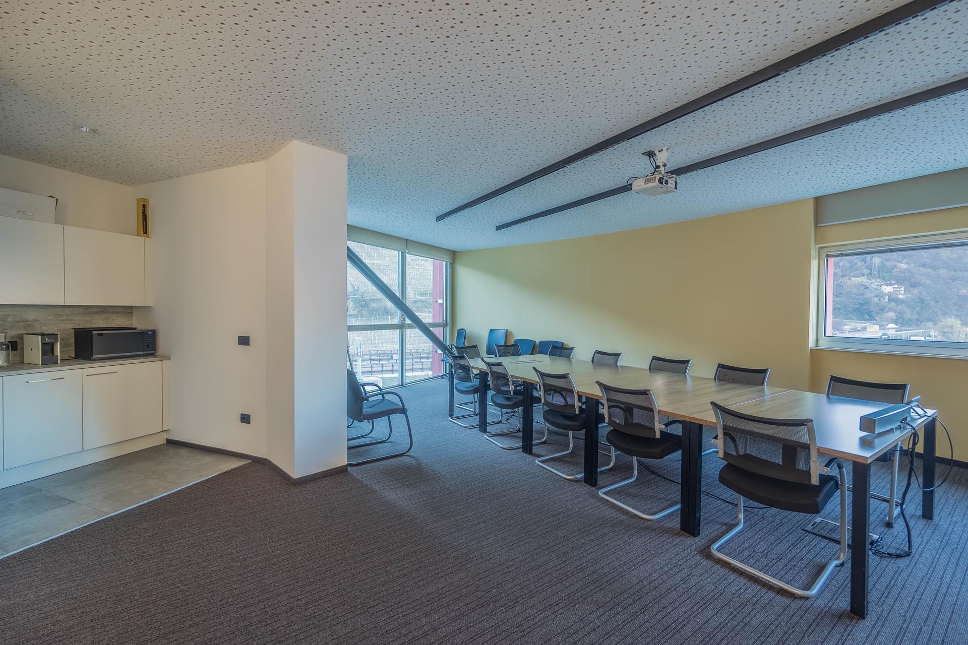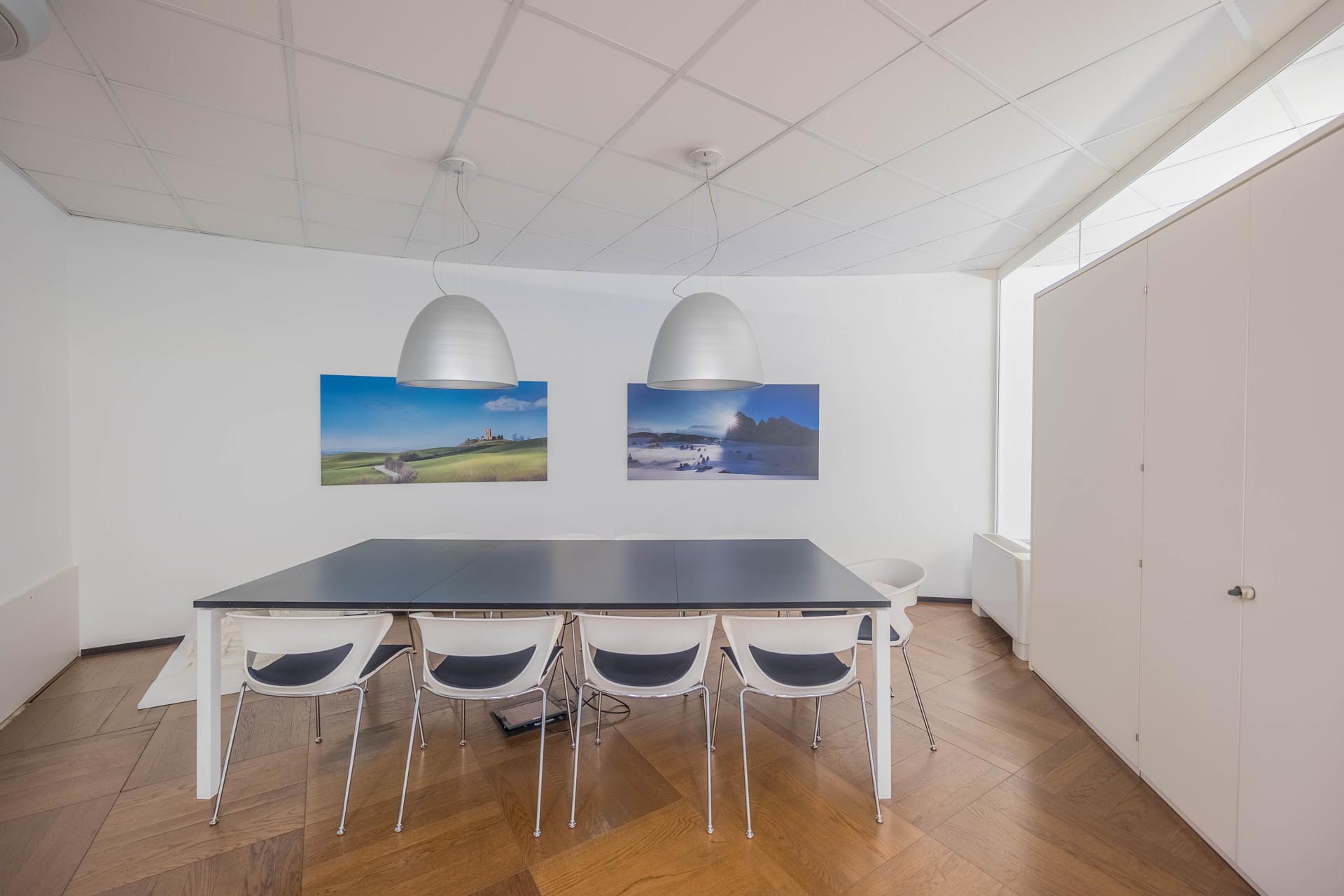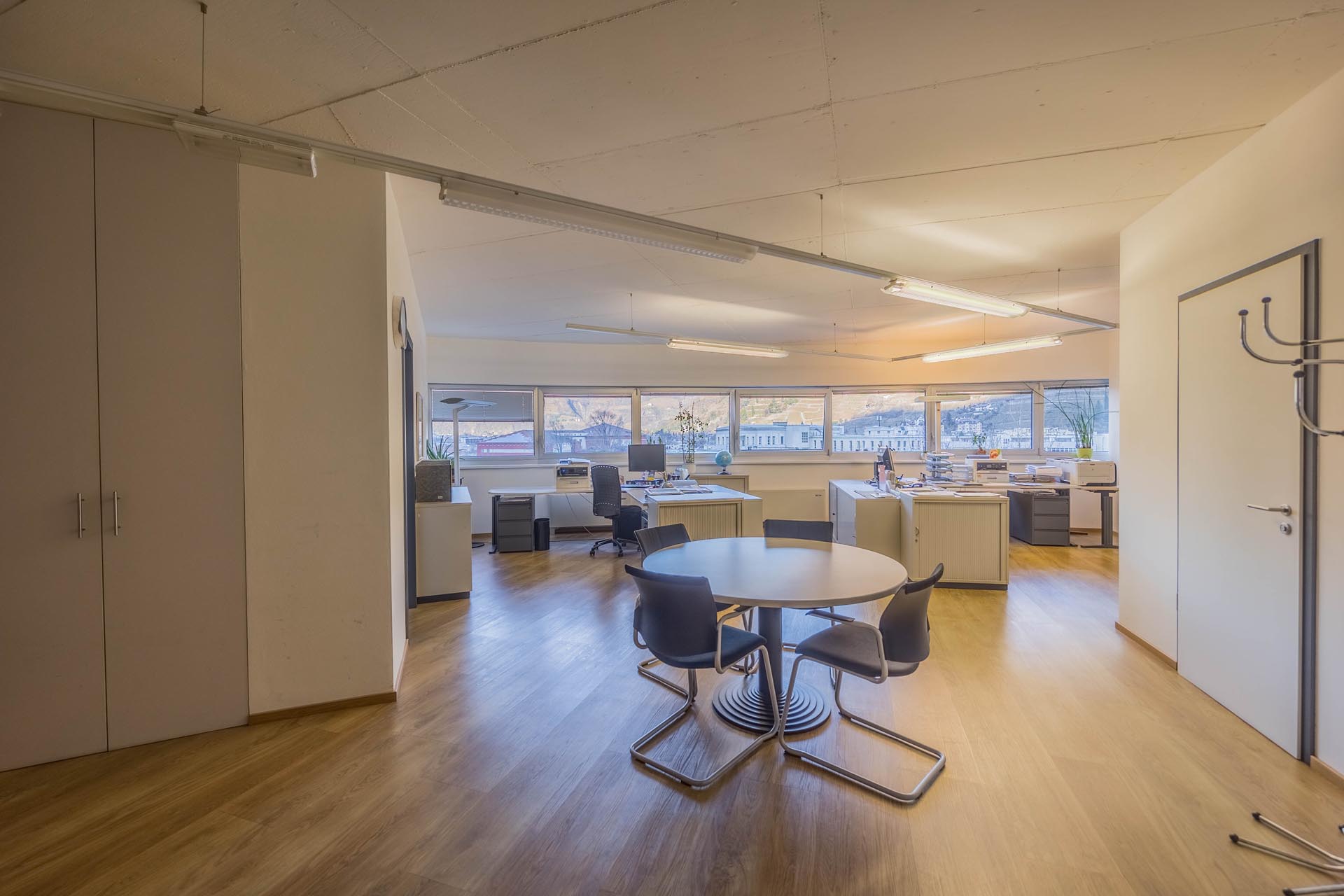 Le ampie superfici vetrate garantiscono molta luce naturale e creano un'atmosfera di lavoro luminosa e piacevole, che favorisce la produttività e il comfort. L'arredamento è di alta qualità e contemporaneo, il che conferisce all'ufficio un aspetto professionale sia dal punto di vista funzionale che estetico.