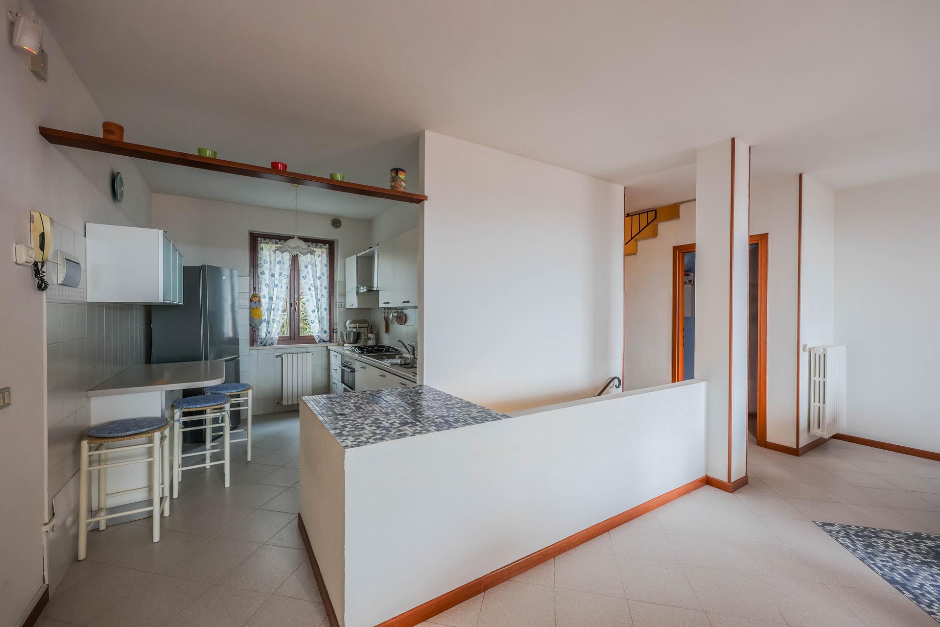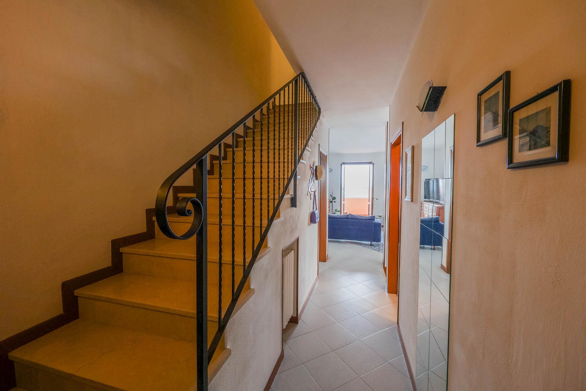 La casa si sviluppa su tre piani e presenta una disposizione degli spazi pratica e versatile. Al piano interrato si trovano un'accogliente taverna, che può essere utilizzata anche come camera da letto aggiuntiva, una funzionale lavanderia e una cantina. I piani superiori ospitano la zona giorno e la zona notte, particolarmente accoglienti grazie alla loro luminosità e alla vista.