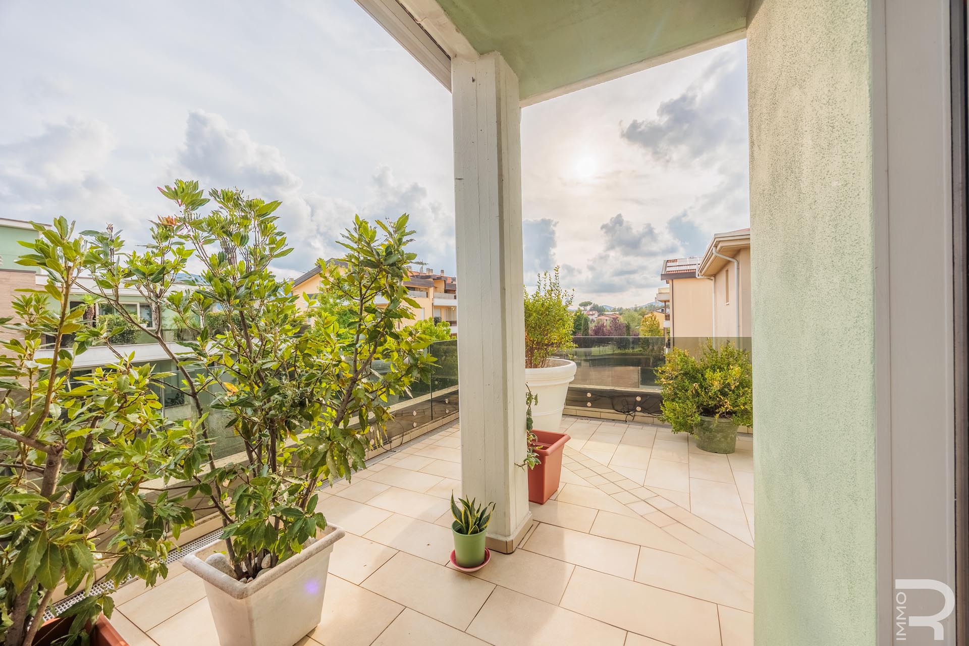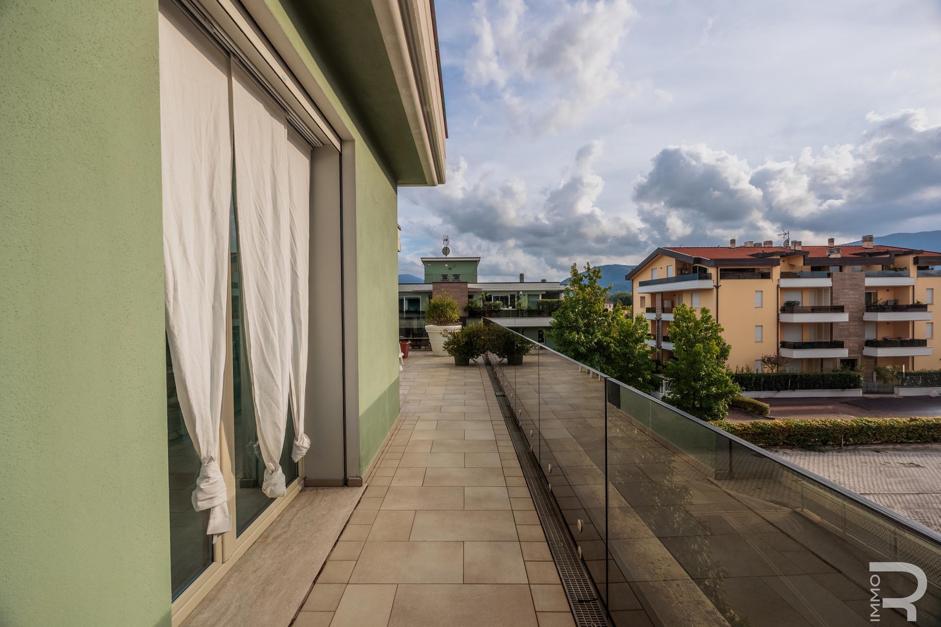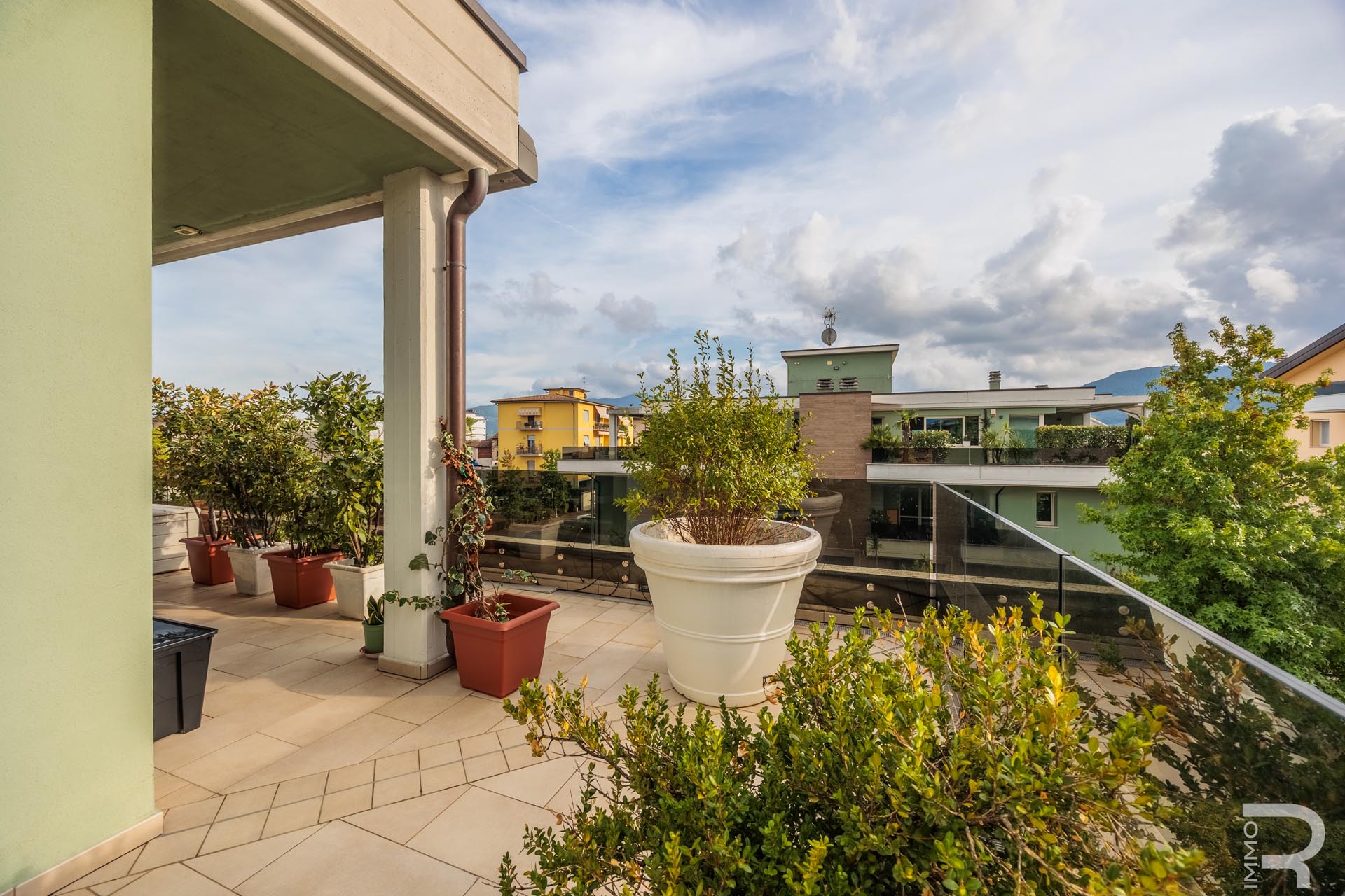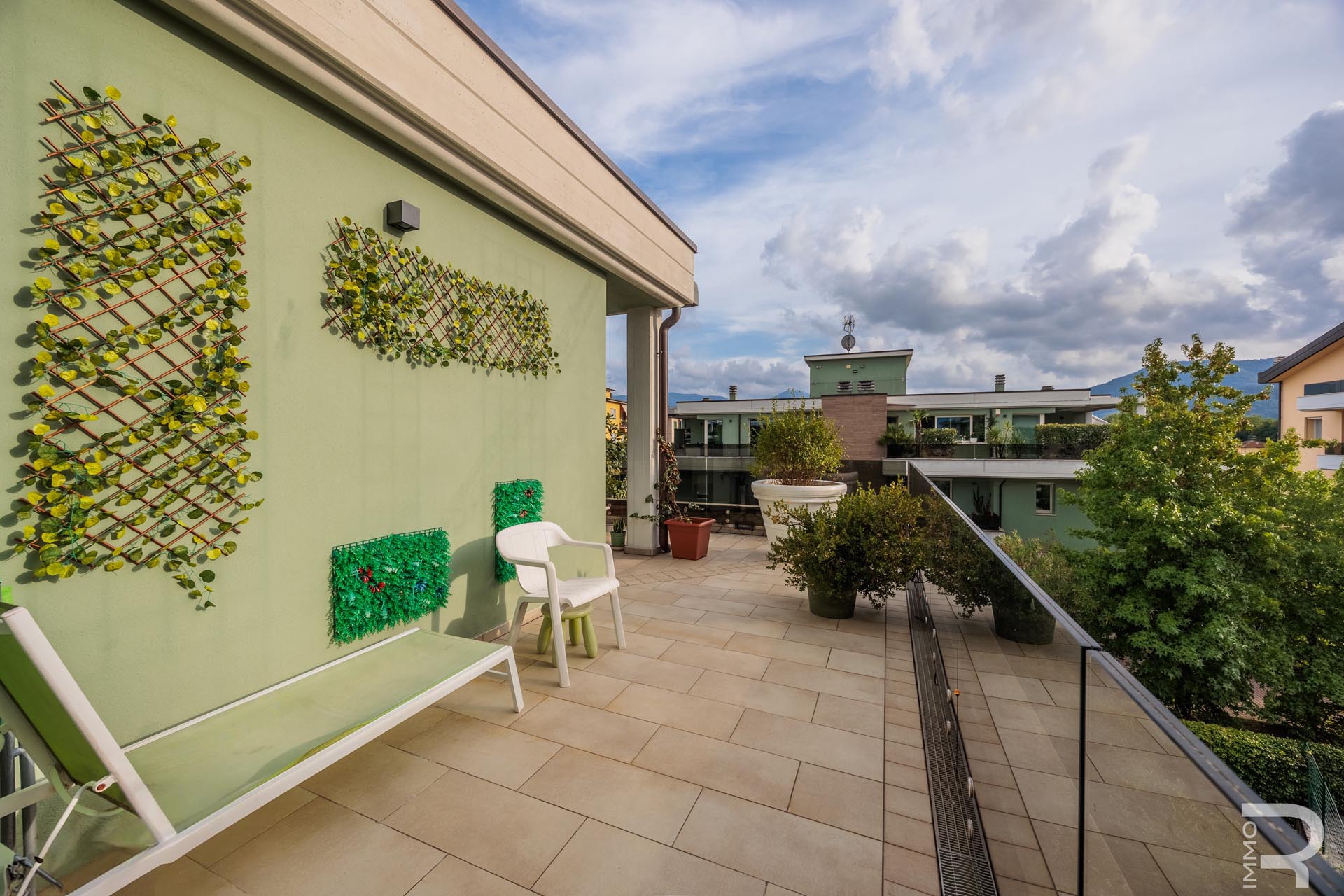 Un punto di forza è la terrazza perimetrale di circa 100 mq, che si collega senza soluzione di continuità alla zona giorno. Offre spazio per soleggiate zone lounge e pranzo, è ideale per serate conviviali all'aperto e offre una splendida vista sui dintorni.