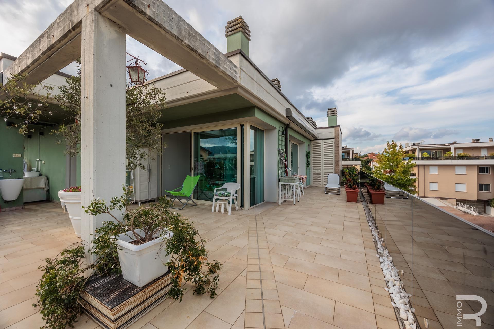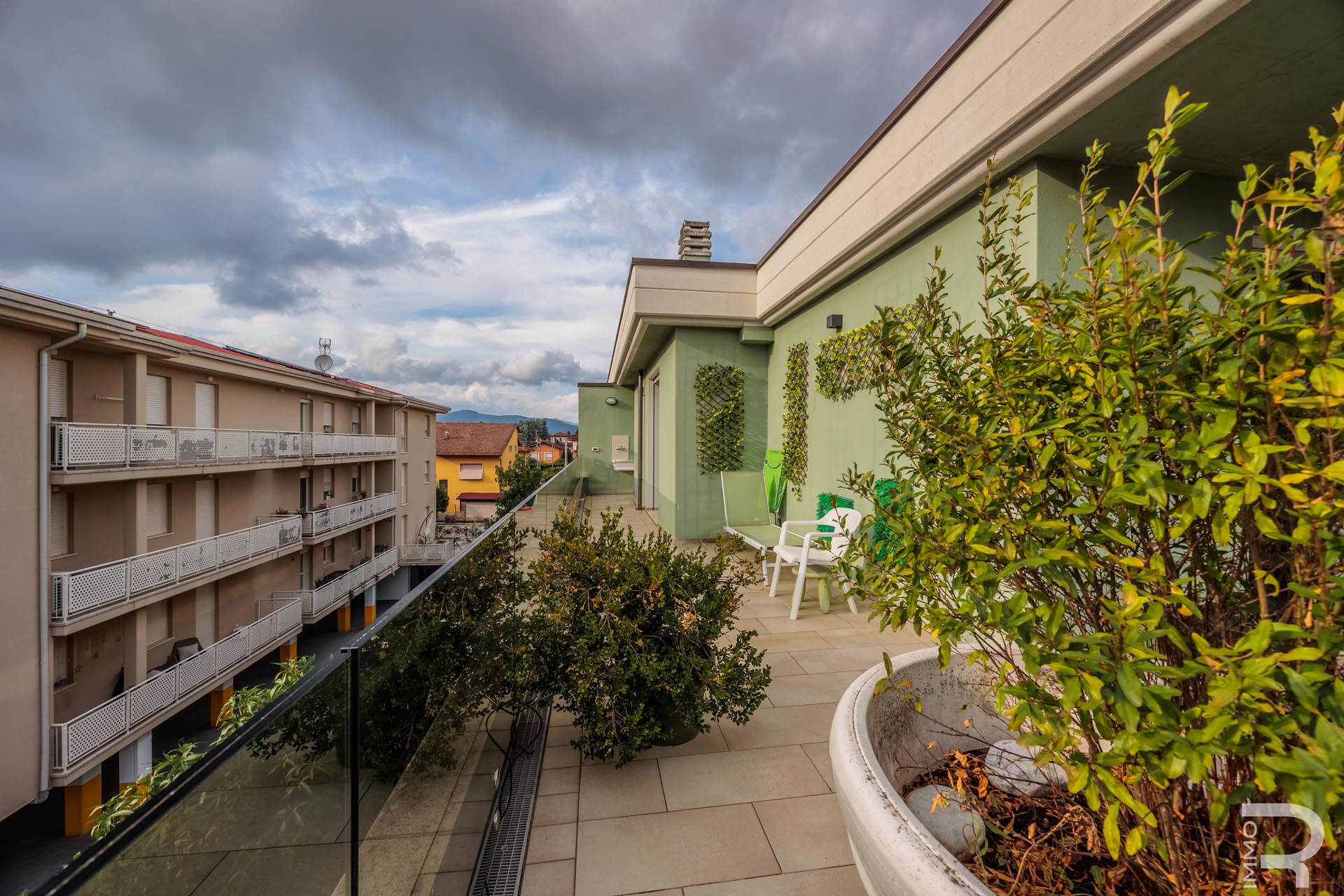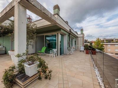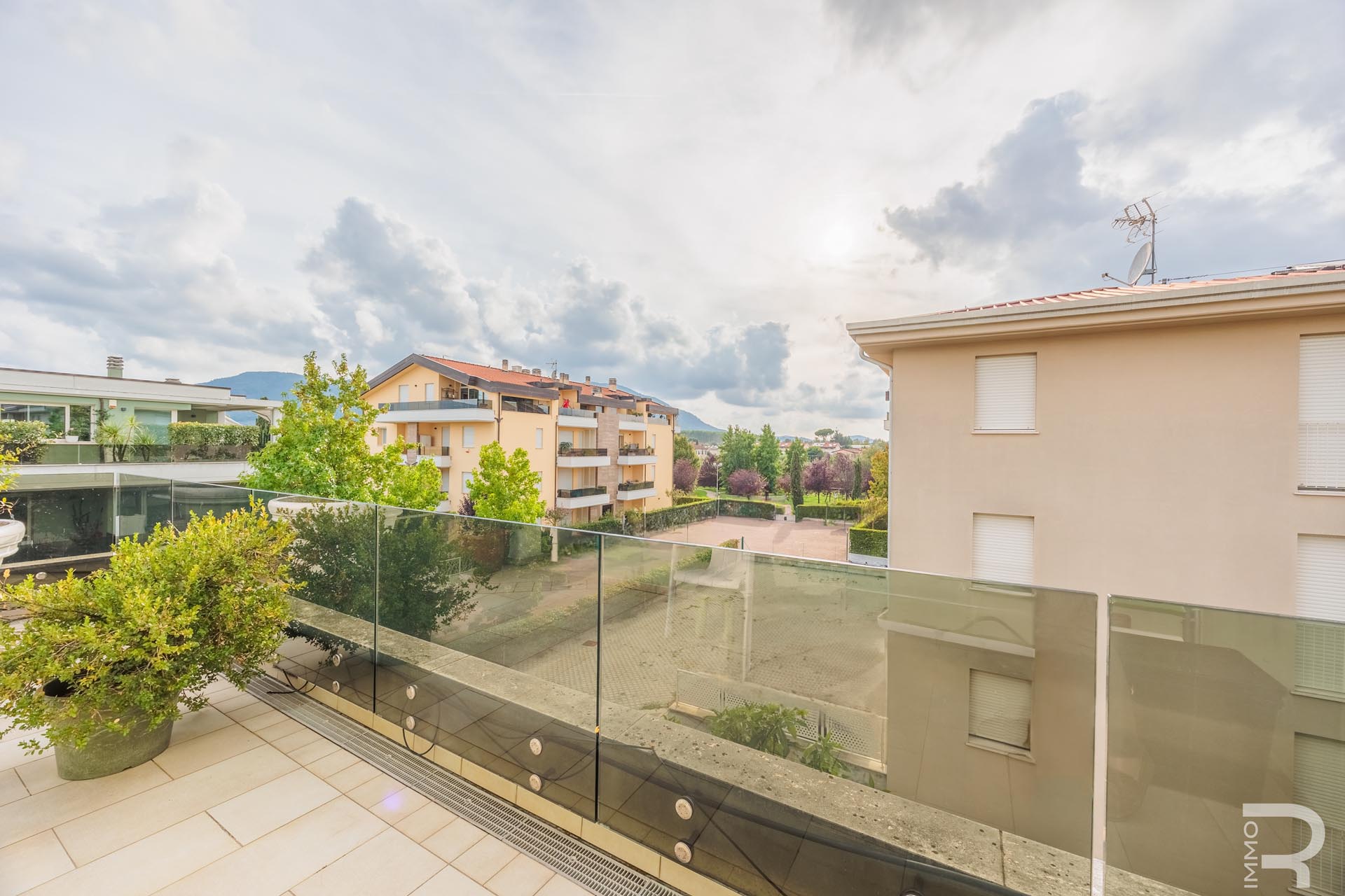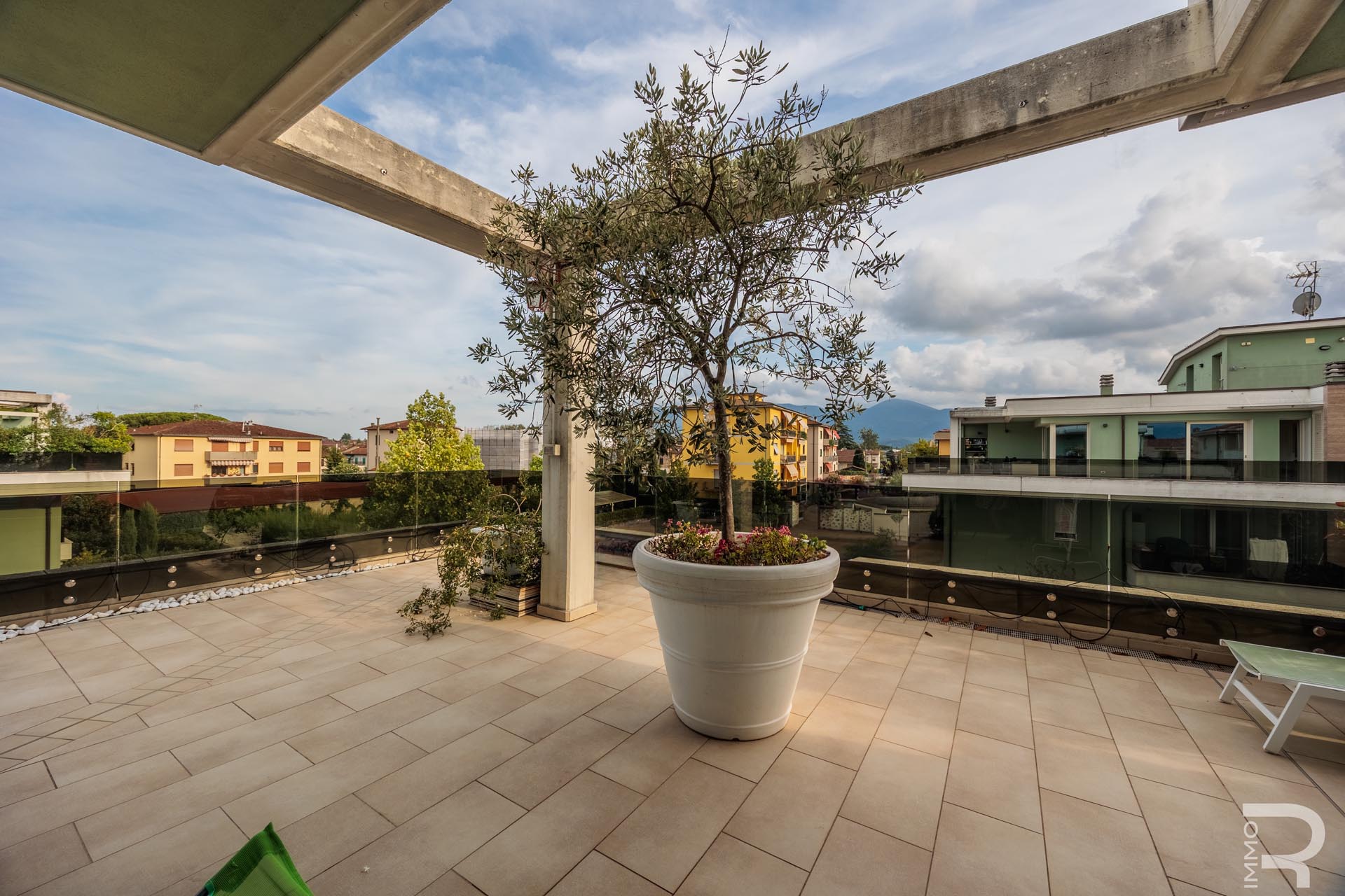 Un punto di forza è la terrazza perimetrale di circa 100 mq, che si collega senza soluzione di continuità alla zona giorno. Offre spazio per soleggiate zone lounge e pranzo, è ideale per serate conviviali all'aperto e offre una splendida vista sui dintorni.