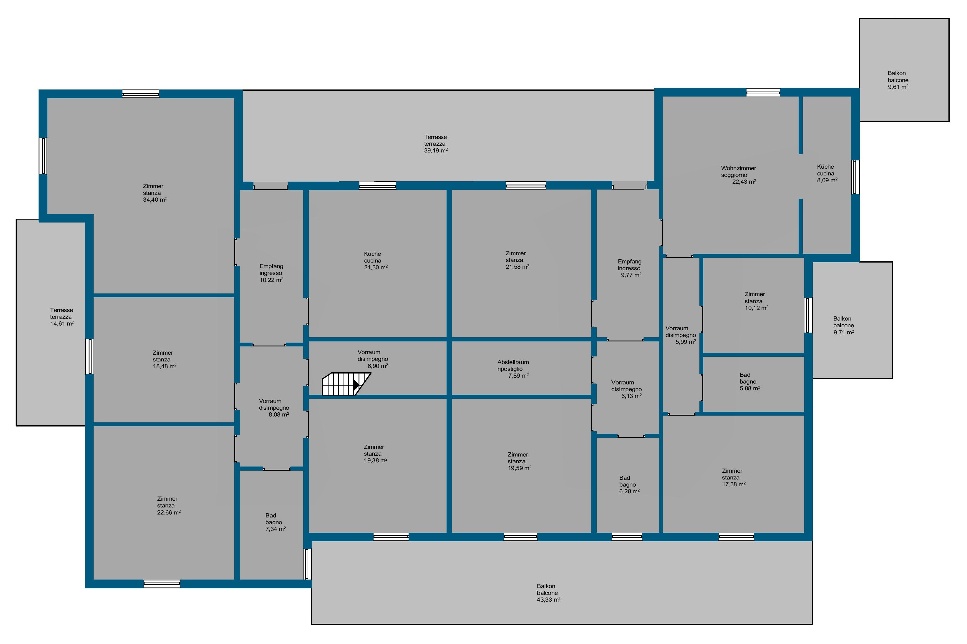 La proprietà si sviluppa su due piani e offre molteplici possibilità di utilizzo. Al primo piano si trovano due appartamenti speculari, ciascuno con una superficie abitabile di circa 150 mq. Ogni unità dispone di stanze spaziose, ideali sia come residenza familiare che come appartamenti per ospiti o vacanze. Complessivamente l'edificio offre 6 camere da letto e 3 bagni, creando così molto spazio per famiglie numerose o ospiti.