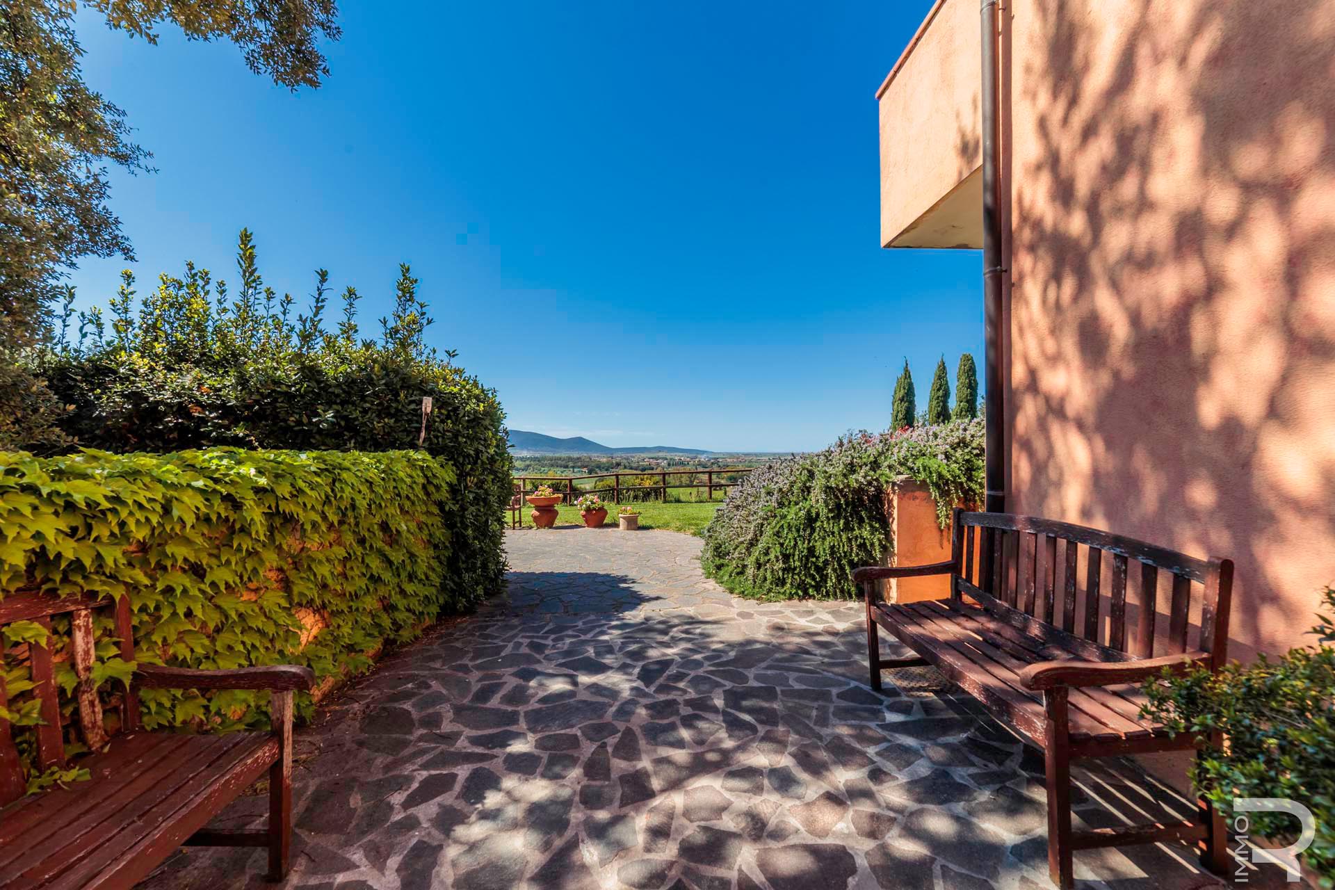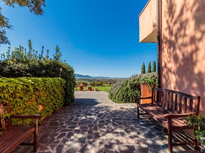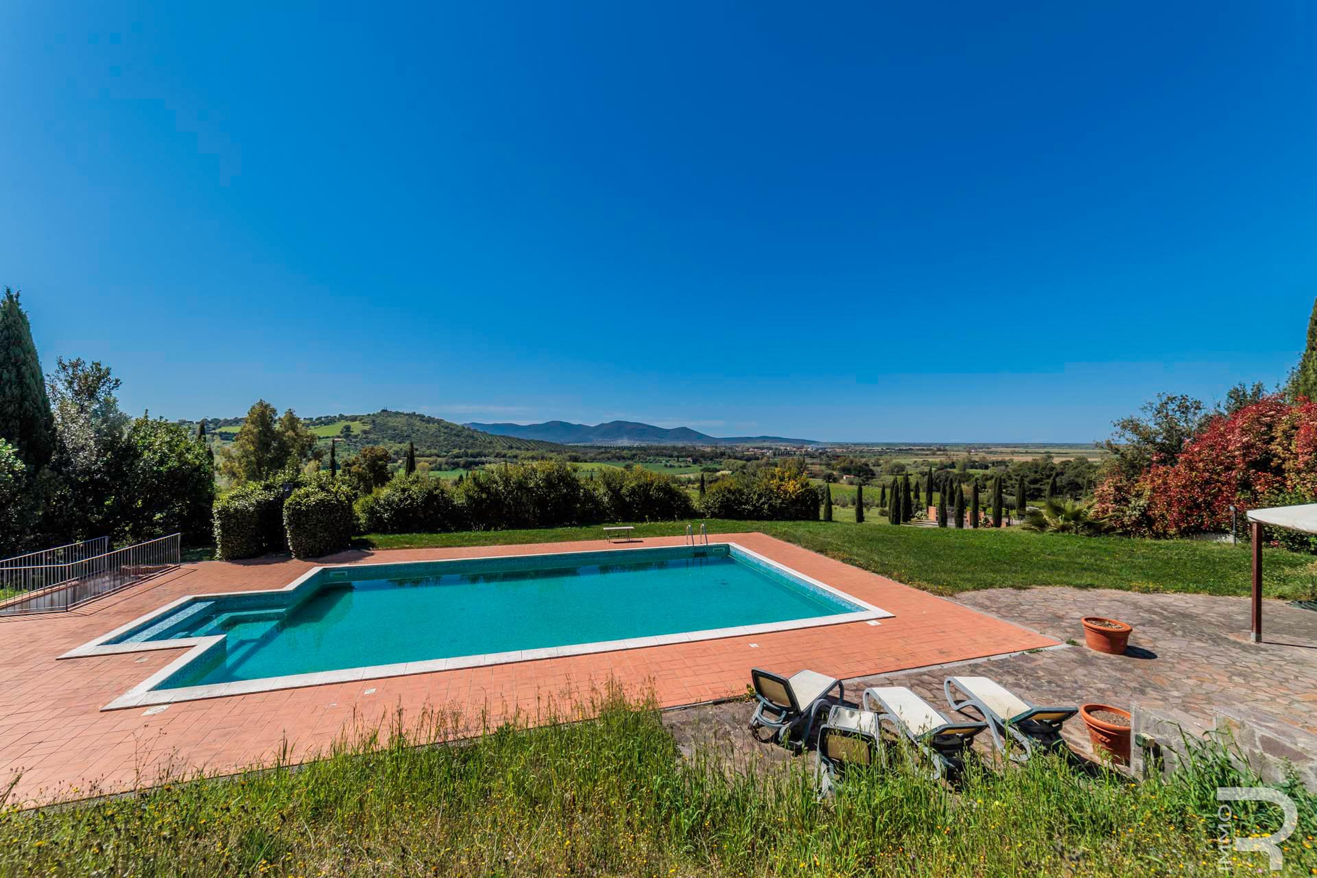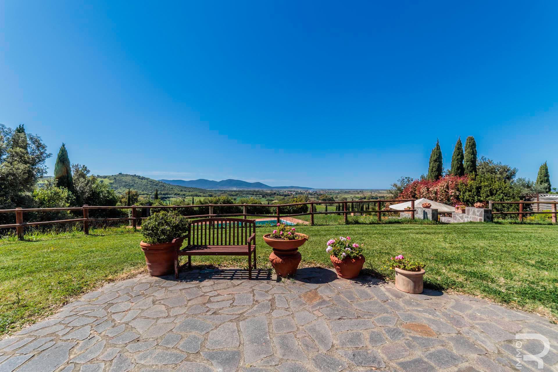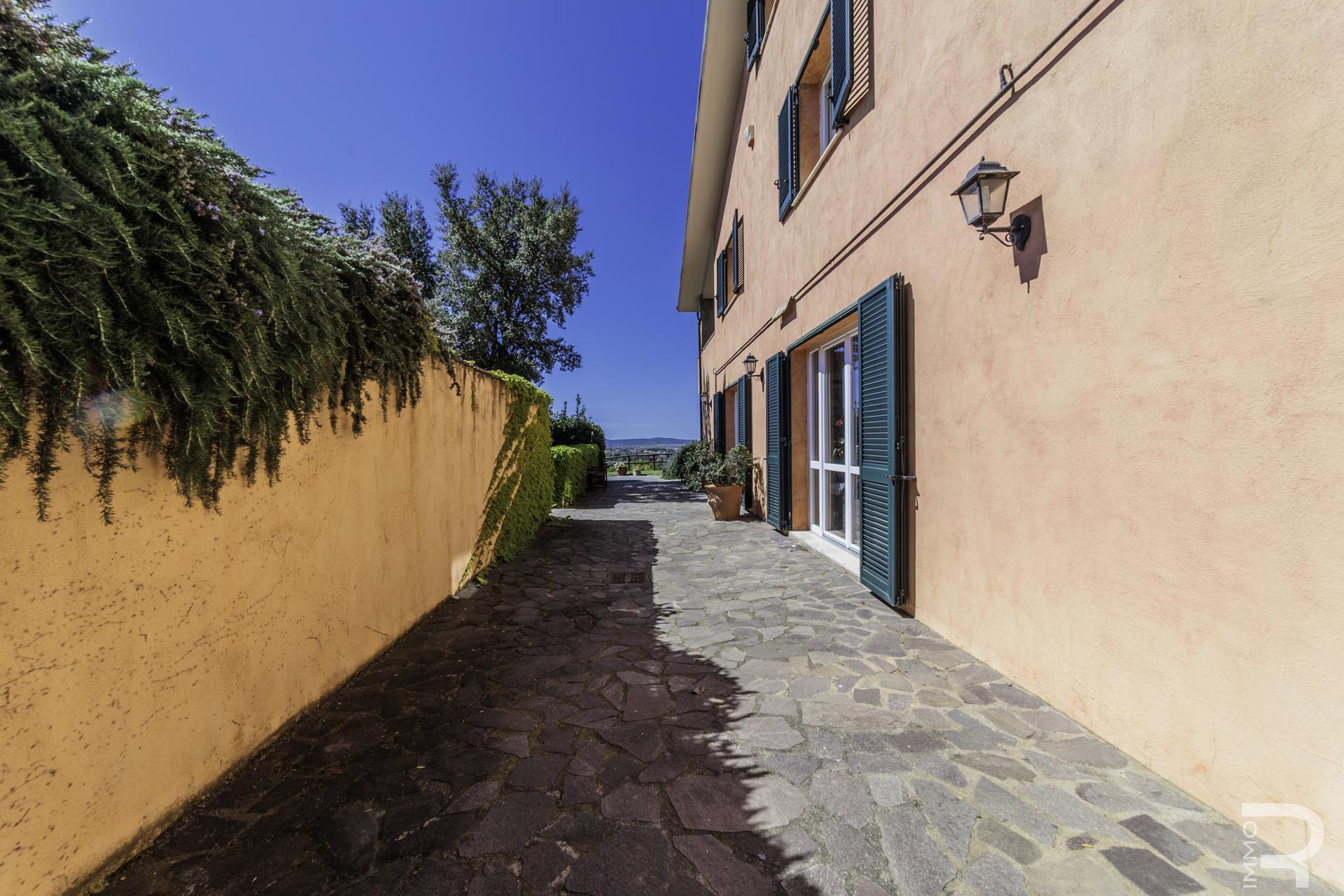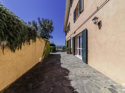 Il cuore dell'area esterna è l'ampio giardino privato di 1,8 ettari, fiancheggiato da un elegante viale di cipressi che fa da cornice suggestiva alla proprietà . Da qui si apre una vista spettacolare sulle dolci colline circostanti e sul mare scintillante in lontananza.