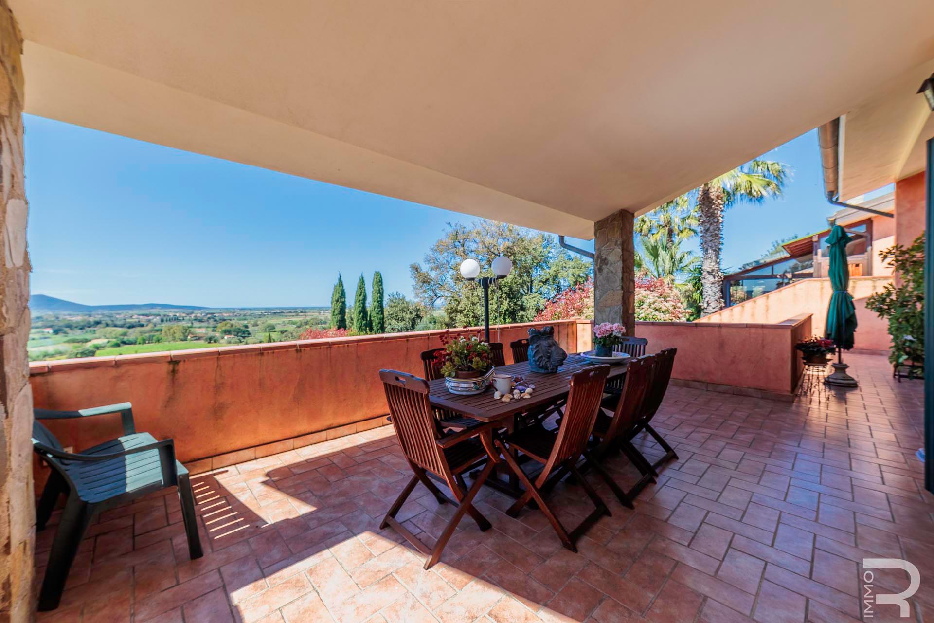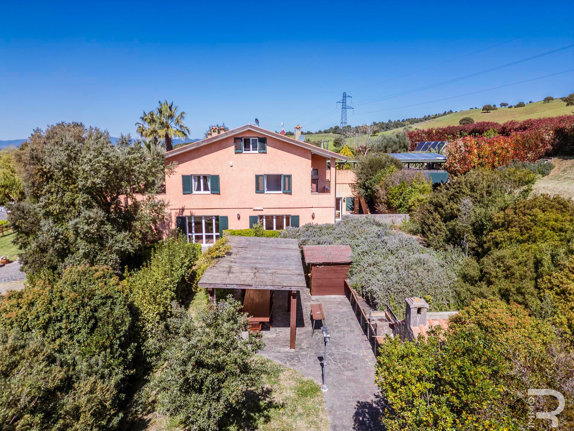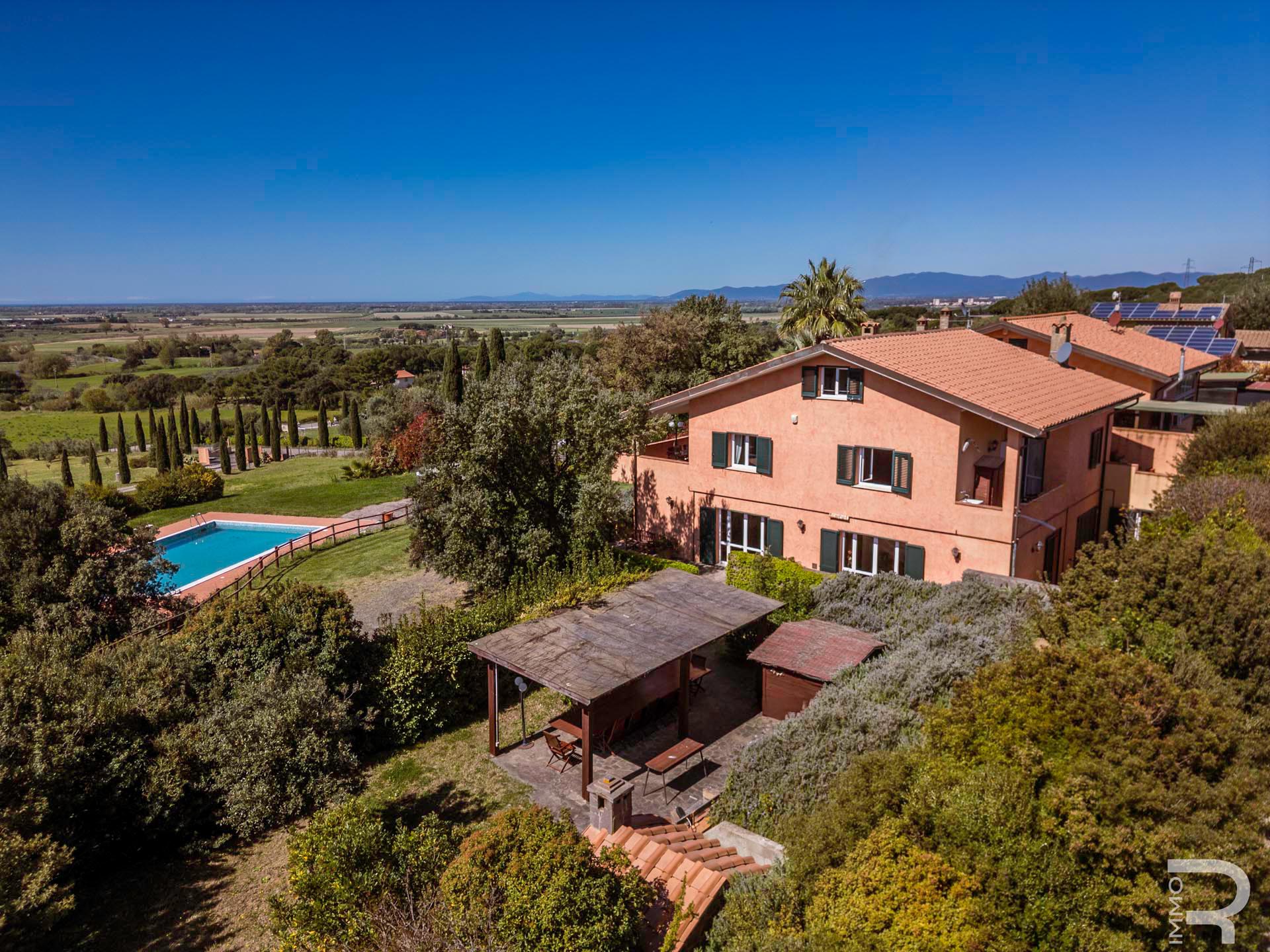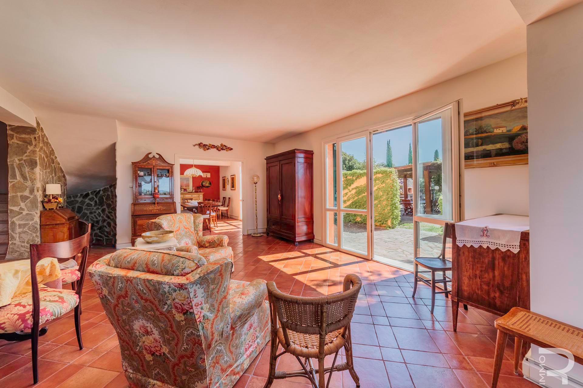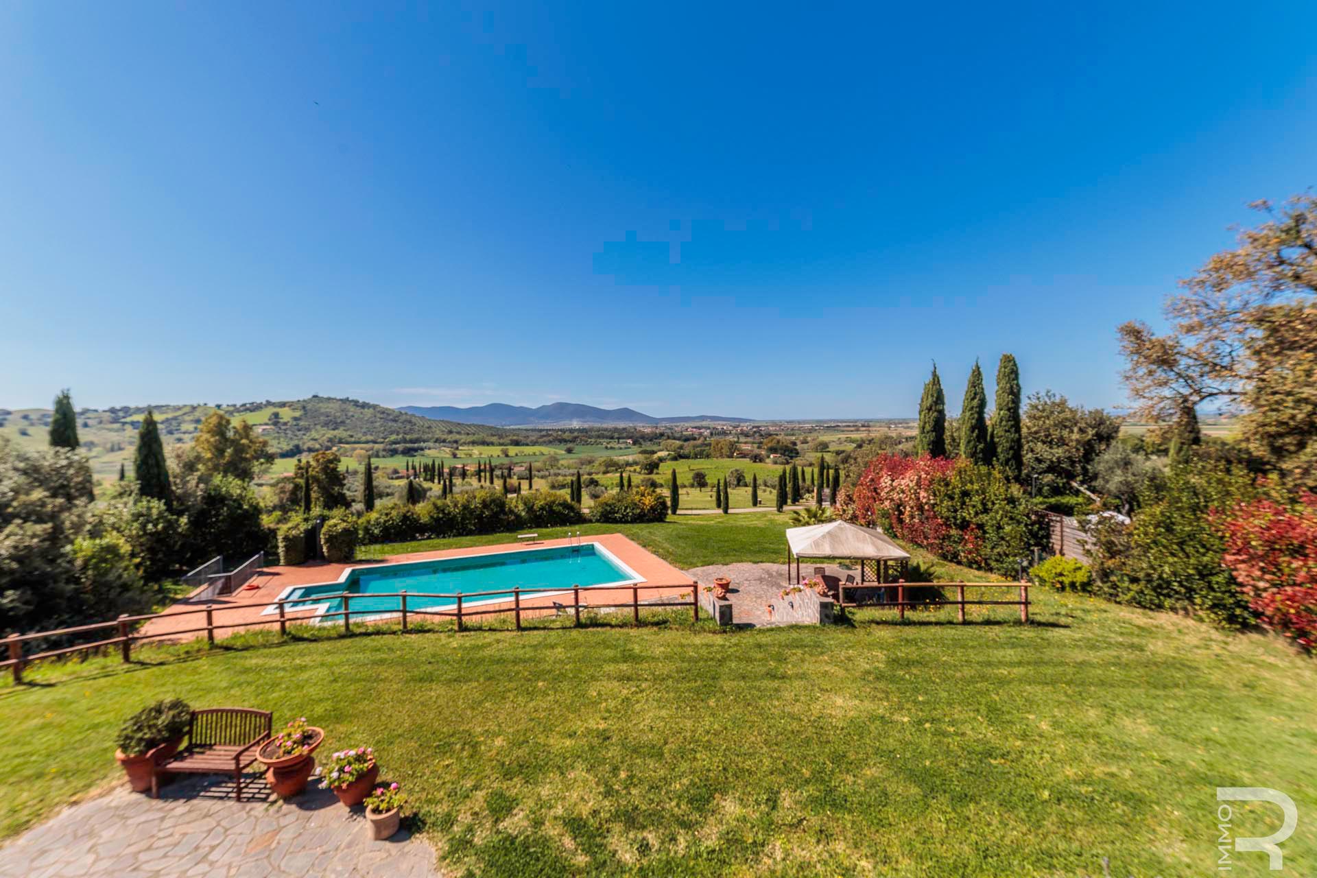 Il cuore dell'area esterna è l'ampio giardino privato di 1,8 ettari, fiancheggiato da un elegante viale di cipressi che fa da cornice suggestiva alla proprietà . Da qui si apre una vista spettacolare sulle dolci colline circostanti e sul mare scintillante in lontananza.