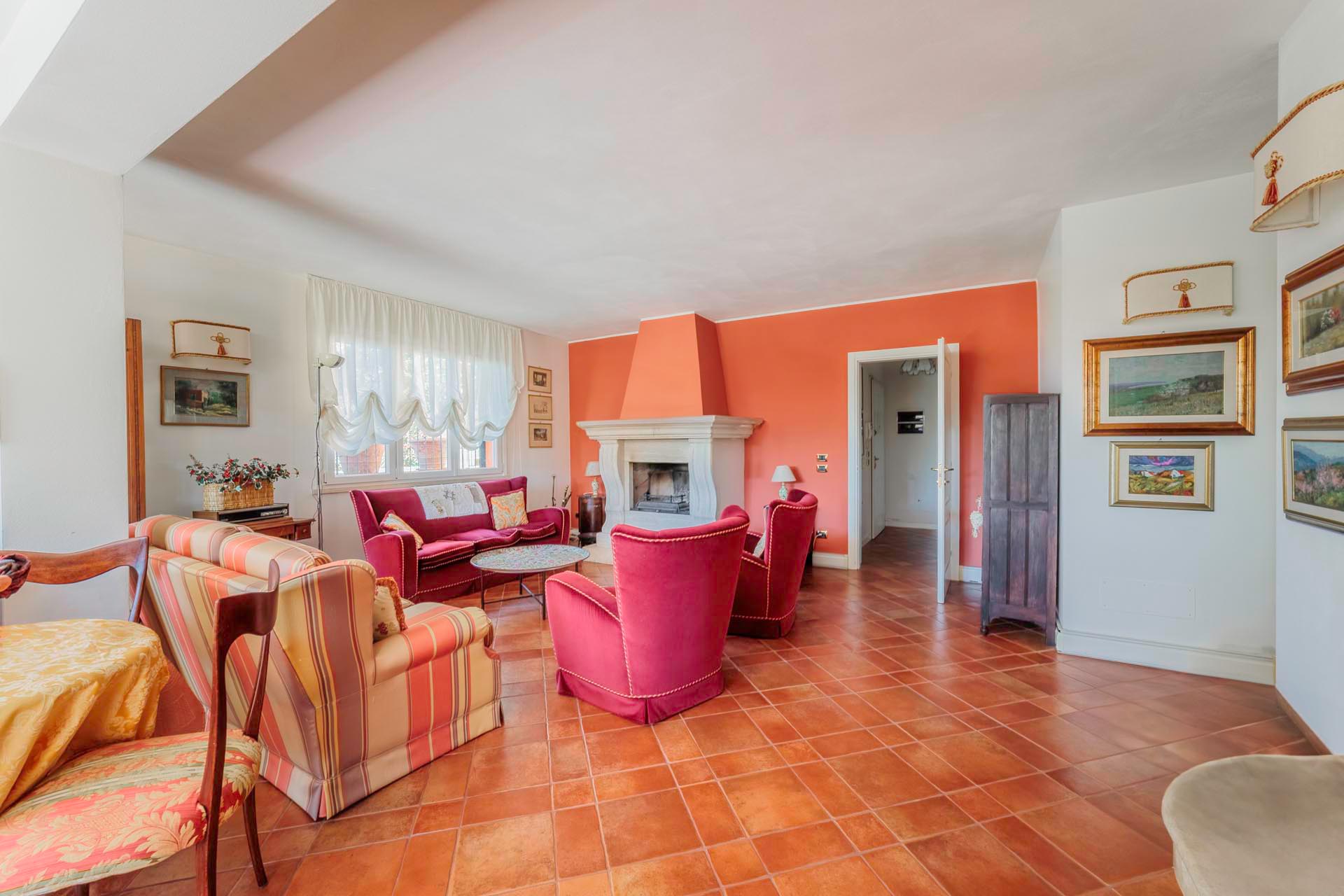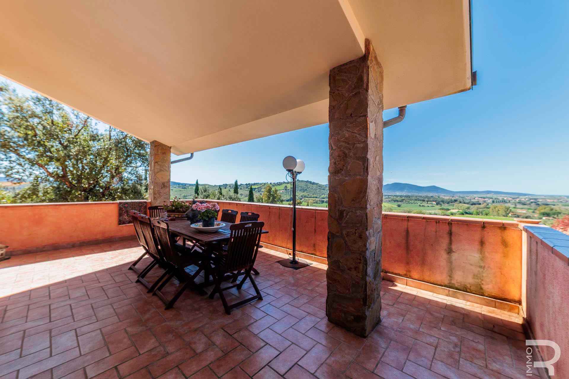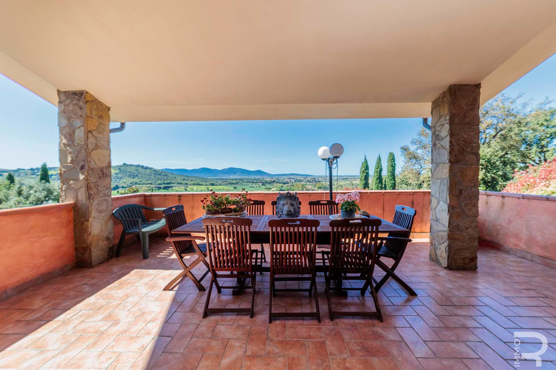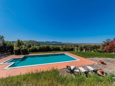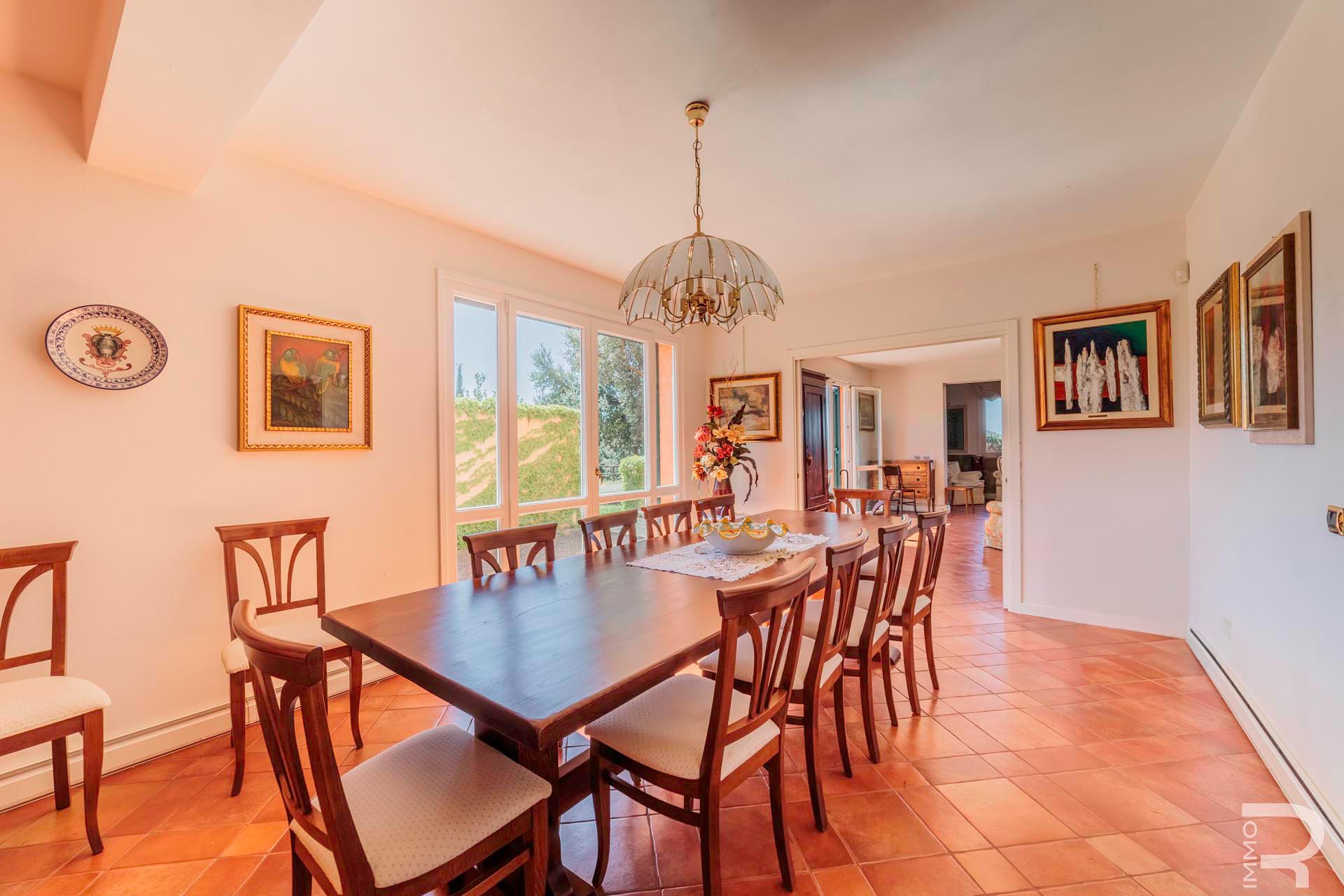 Il cuore dell'area esterna è l'ampio giardino privato di 1,8 ettari, fiancheggiato da un elegante viale di cipressi che fa da cornice suggestiva alla proprietà . Da qui si apre una vista spettacolare sulle dolci colline circostanti e sul mare scintillante in lontananza.