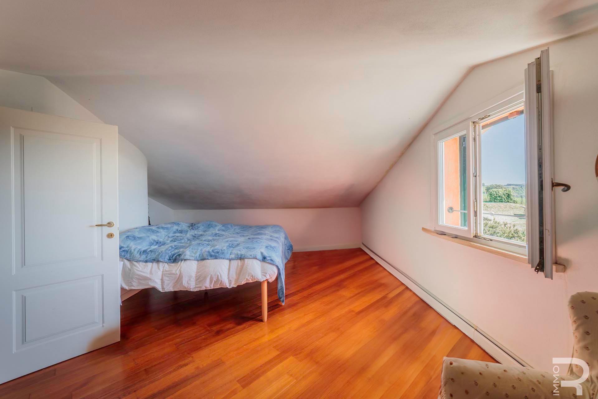 La villetta bifamiliare stessa affascina per le finiture di alta qualità e la disposizione degli spazi ben studiata. L'ampio soggiorno è particolarmente luminoso e offre una zona giorno aperta e accogliente. In totale, la casa dispone di quattro camere da letto, di cui due situate nella mansarda, garantendo così spazio sufficiente per famiglie o ospiti.